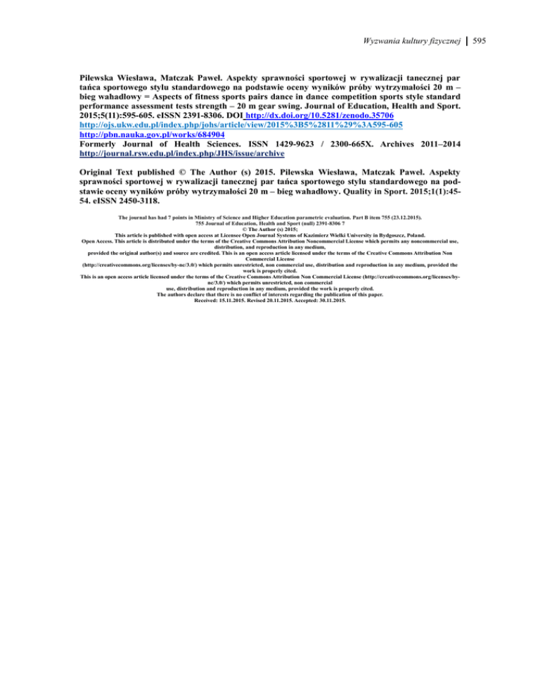 Wyzwania kultury fizycznej Pilewska Wiesława, Matczak Paweł. Aspekty sprawności sportowej w rywalizacji tanecznej par tańca sportowego stylu standardowego na podstawie oceny wyników próby wytrzymałości 20 m – bieg wahadłowy = Aspects of fitness sports pairs dance in dance competition sports style standard performance assessment tests strength – 20 m gear swing. Journal of Education, Health and Sport. 2015;5(11):595-605. eISSN 2391-8306. DOI http://dx.doi.org/10.5281/zenodo.35706 http://ojs.ukw.edu.pl/index.php/johs/article/view/2015%3B5%2811%29%3A595-605 http://pbn.nauka.gov.pl/works/684904 Formerly Journal of Health Sciences. ISSN 1429-9623 / 2300-665X. Archives 2011–2014 http://journal.rsw.edu.pl/index.php/JHS/issue/archive Original Text published © The Author (s) 2015. Pilewska Wiesława, Matczak Paweł. Aspekty sprawności sportowej w rywalizacji tanecznej par tańca sportowego stylu standardowego na podstawie oceny wyników próby wytrzymałości 20 m – bieg wahadłowy. Quality in Sport. 2015;1(1):4554. eISSN 2450-3118. The journal has had 7 points in Ministry of Science and Higher Education parametric evaluation. Part B item 755 (23.12.2015). 755 Journal of Education, Health and Sport (null) 2391-8306 7 © The Author (s) 2015; This article is published with open access at Licensee Open Journal Systems of Kazimierz Wielki University in Bydgoszcz, Poland. Open Access. This article is distributed under the terms of the Creative Commons Attribution Noncommercial License which permits any noncommercial use, distribution, and reproduction in any medium, provided the original author(s) and source are credited. This is an open access article licensed under the terms of the Creative Commons Attribution Non Commercial License (http://creativecommons.org/licenses/by-nc/3.0/) which permits unrestricted, non commercial use, distribution and reproduction in any medium, provided the work is properly cited. This is an open access article licensed under the terms of the Creative Commons Attribution Non Commercial License (http://creativecommons.org/licenses/bync/3.0/) which permits unrestricted, non commercial use, distribution and reproduction in any medium, provided the work is properly cited. The authors declare that there is no conflict of interests regarding the publication of this paper. Received: 15.11.2015. Revised 20.11.2015. Accepted: 30.11.2015. 595 596 Wiesława Pilewska, Paweł Matczak Wiesława Pilewska, Paweł Matczak Instytut Kultury Fizycznej, Uniwersytet Kazimierza Wielkiego w Bydgoszczy Aspekty sprawności sportowej w rywalizacji tanecznej par tańca sportowego stylu standardowego na podstawie oceny wyników próby wytrzymałości 20 m – bieg wahadłowy Aspects of fitness sports pairs dance in dance competition sports style standard performance assessment tests strength – 20 m gear swing Streszczenie Cel pracy W niniejszej pracy podjęto próbę charakterystyki poziomu zdolności wytrzymałościowych par C-S klasowych tańca sportowego stylu standardowego w odniesieniu do aspektów sportowej działalności tanecznej. Materiał Grupę badawczą stanowiły sportowe pary taneczne, trenujące w Toruńskim Klubie Tanecznym Dance & Dance. Grupa liczyła 22 osoby tworząc 11 par. Wiek badanych mieścił się w przedziale 16-22 lata. Grupa na turniejach prezentowała grupę wiekową powyżej 15 lat. W badanej grupie dwie pary prezentowały klasę „C”, sześć klasę „B”, dwie pary klasę „A”, jedna para klasę „S”. Metody badawcze Do pomiaru wytrzymałości wykorzystano 20-metrowy bieg wahadłowy. Test polegał na pokonywaniu 20 metrowych odcinków w określonym czasie. Sygnały określające tempo znajdowały się na nagraniu pozyskane ze strony Narodowego Centrum Badania Kondycji Fizycznej (ncbkf.pl). Niemożność utrzymania tempa lub spóźnienie się na sygnał oznaczający rozpoczęcie kolejnego cyklu, był znakiem do ukończenia testu. Wyniki i wnioski 1. W grupie tancerzy C-S klasowych, stylu standardowego odnotowano istotną statystycznie p≥0,01 współzależność pomiędzy uzyskiwanymi wynikami próby 20 metrowego biegu wahadłowego a ich poziomem sportowym. 2. We wszystkich grupach (tancerzy i tancerek) odnotowano wprost proporcjonalny charakter współzależności pomiędzy wynikiem sportowym a poziomem zdolności wytrzymałościowych (określonych wynikami 20 metrowego biegu wahadłowego). 3. Na przykładzie najlepszych par wnioskować można że profil pary powinien ukazywać dominację partnera w poziomie wytrzymałością a ich partnerki powinny prezentować 60-70% poziomu partnera. Zarówno mniejsza jak i większa różnica wykazują tendencję do słabszych wyników sportowych i charakteryzowała pary o niższym poziomie sportowym. Słowa kluczowe: taniec towarzyski, styl standardowy, 20-metrowy bieg wahadłowy, poziom sportowy. Aspekty sprawności sportowej w rywalizacji tanecznej par tańca sportowego stylu standardowego na podstawie oceny wyników próby wytrzymałości 20M – bieg wahadłowy Abstract Aim of the study In this paper, an attempt to level the characteristics of endurance capacity C-S couples sporty style dance class standard in relation to aspects of dance sport activities. Materials The research group sports were couples dancing, Training in Torun Club & Dance the Dance Dance. The group consisted of 22 people forming 11 pairs. The age of respondents ranged from 16-22 years. The group presented the age-group tournaments over 15 years. In the group of two pairs presented a class "C" six class "B", two pairs of class "A", one pair of class "S". Research Methods Used to measure the strength of a 20-meters gear swing. The test was to overcome the 20 meters sections at a given time. Signals determining the pace were on record obtained from the National Center for the Study of Physical Constitution (ncbkf.pl).Inability to keep pace or late in the signal indicating the start of the next cycle, was a sign to complete th