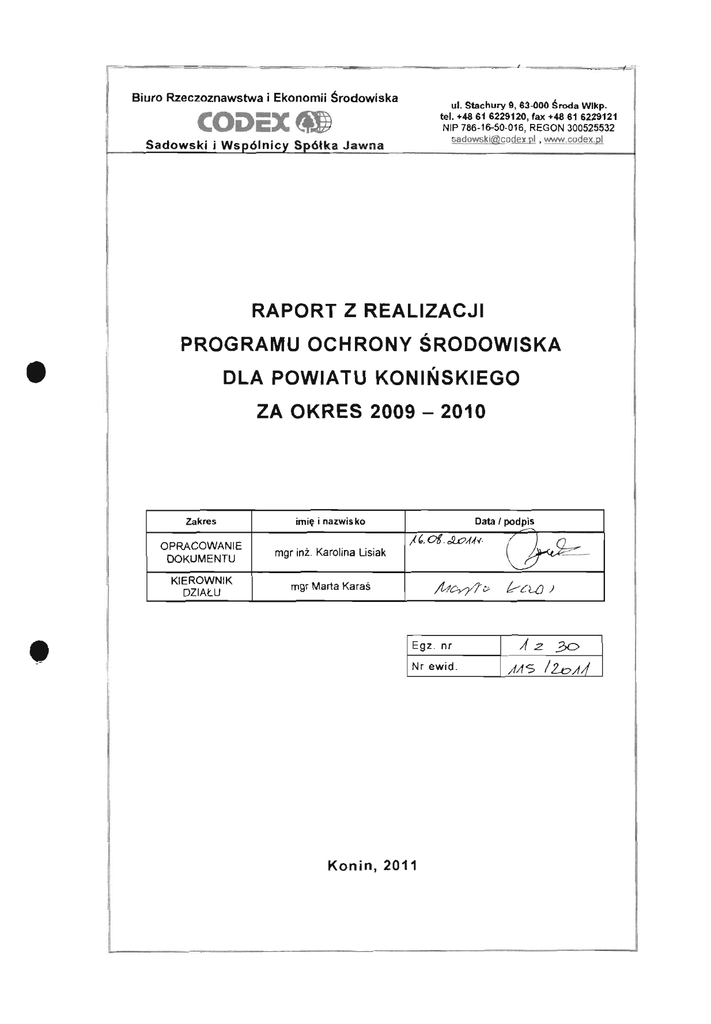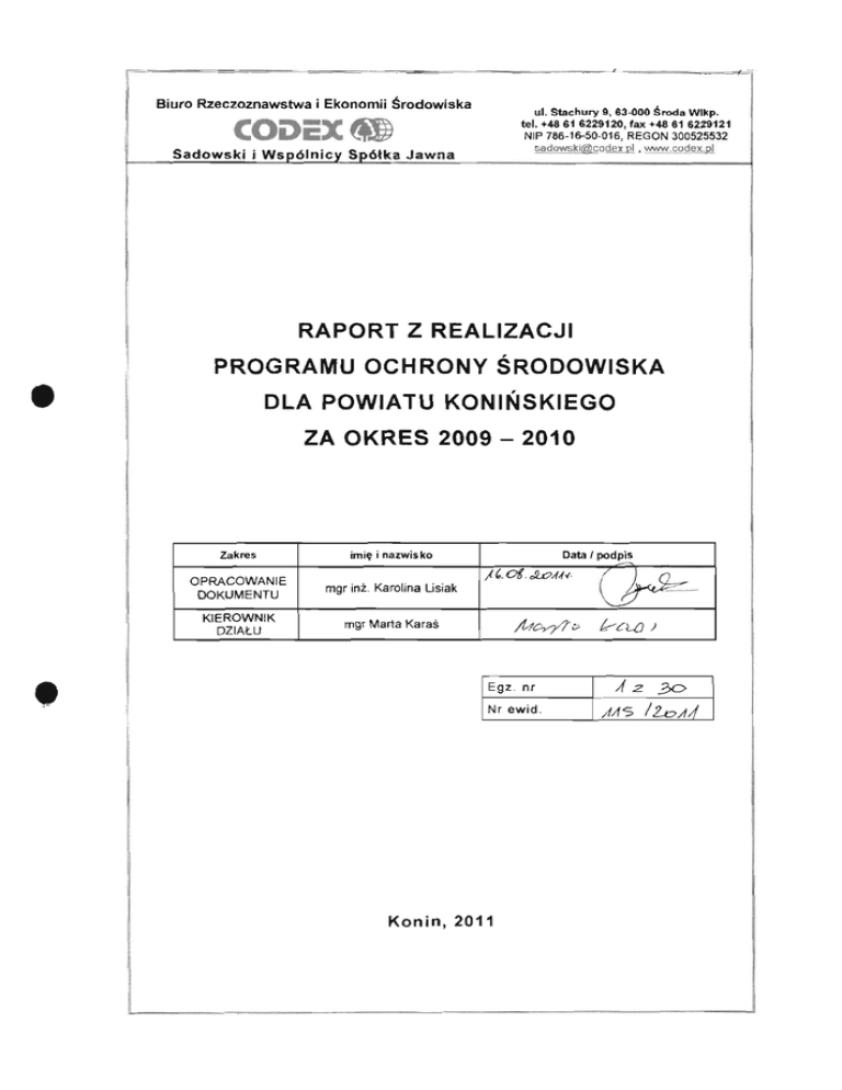 Raport z realizacji Programu Ochrony Środowiska dla Powiatu Konińskiego za okres 2009 – 2010 Spis treści 1. Wprowadzenie...........................................................................................................................................3 2. Charakterystyka ogólna Powiatu Konińskiego..........................................................................................4 3. Zadania wykonane w latach 2009 – 2010 służące realizacji założonych celów.....................................13 3. 1. Ochrona przyrody...........................................................................................................................13 3. 2. Ochrona i zrównoważony rozwój lasów..........................................................................................17 3. 3. Ochrona powierzchni ziemi.............................................................................................................19 3. 4. Zasoby kopalin i wód podziemnych................................................................................................23 3. 5. Zrównoważone wykorzystanie materiałów, wody i energii.............................................................24 3. 6. Wykorzystywanie energii odnawialnej............................................................................................27 3. 7. Kształtowanie stosunków wodnych, ochrona przed powodzią o skutkami suszy..........................27 3. 8. Ochrona wód podziemnych i powierzchniowych............................................................................29 4. 9. Ochrona powietrza..........................................................................................................................33 3. 10. Poważne awarie...........................................................................................................................38 3. 11. Ochrona przed hałasem...............................................................................................................39 3. 12. Ochrona przed promieniowaniem elektromagnetycznym............................................................40 4. Najważniejsze działania w zakresie edukacji ekologicznej.....................................................................41 5. Podsumowanie.........................................................................................................................................43 6. Spis tabel i rysunków...............................................................................................................................45 Biuro Rzeczoznawstwa i Ekonomii Środowiska CODEX Sadowski i Wspólnicy S. J. www.codex.pl 1 Raport z realizacji Programu Ochrony Środowiska dla Powiatu Konińskiego za okres 2009 – 2010 Słowniczek b.d. – brak danych n.d. – nie dotyczy ARiMR – Agencja Restrukturyzacji i Modernizacji Rolnictwa BHP – Bezpieczeństwo i Higiena Pracy GDOŚ – Generalny Dyrektor Ochrony Środowiska JCWPd – Jednolite Części Wód Podziemnych KRUS – Kasa Rolniczego Ubezpieczenia Społecznego KWB – Kopalnia Węgla Brunatnego LOP – Liga Ochrony Przyrody ODR – Ośrodek Doradztwa Rolniczego OSO – Obszary Specjalnej Ochrony OSP – Ochotnicza Straż Pożarna OZE – Odnawialne Źródła Energii PFOŚiGW – Powiatowy Fundusz Ochrony Środowiska i Gospodarki Wodnej PLB – część oznaczenia kodowego obszaru Natura 2000 (np. Dolina Środkowej Warty PLB300002) utworzonego zgodnie na podstawie Dyrektywy Ptasiej (Birds Directive) PLH – część oznaczenia kodowego obszaru Natura 2000 (np. Ostoja Nadwarciańska PLH300009) utworzonego na podstawie Dyrektywy Siedliskowej (Habitats Directive) POŚ – Program Ochrony Środowiska PROW – Program Rozwoju Obszarów Wiejskich PZW – Polski Związek Wędkarski RDOŚ – Regionalny Dyrektor Ochrony Środowiska RLM – Równoważna Liczba Mieszkańców SOO – Specjalne Obszary Ochrony / Regionalna Dyrekcja ochrony Środowiska TPNPT – Towarzystwo Przyjaciół Nadgoplańskiego Parku Tysiąclecdia WFOŚiGW - Wojewódzki Fundusz Ochrony Środowiska i Gospodarki Wodnej WIOŚ – Wojewódzki Inspektorat Ochrony Środowiska WZMiUW – Wojewódzki Zarząd Melioracji i Urządzeń Wodnych ZDP – Zarząd Dróg Powiatowych ZE PAK – Zespół Elektrowni Pątnów Adamów Konin Biuro Rzeczoznawstwa i Ekonomii Środowiska CODEX Sadowski i Wspólnicy S. J. www.codex.pl 2 Raport z realizacji Programu Ochrony Środowiska dla Powiatu Konińskiego za okres 2009 – 2010 1. Wprowadzenie Zgodnie z art.18 ust. 2 ustawy z dnia 27 kwietnia 2001 roku – Prawo ochrony środowiska (tj. Dz. U. z 2008 r. Nr 25 poz. 150 ze zm.), Rada Powiatu co 2 lata przedstawia Raport z realizacji Powiatowego Programu Ochrony Środowiska. Powiatowy program ochrony środowiska wyznacza m. in. główne kierunki działań w zakresie ochrony zasobów przyrody na obszarze powiatu, z określeniem celów krótko – i długookresowych. Program Ochrony Środowiska dla Powiatu Konińskiego na okres 2008 – 2012 został przyjęty Uchwałą Nr XXII/101/08 Rady Powiatu Konińskiego z dnia 26 września 2008 r. Zgodnie z wymaganiami ustawowymi, Program Ochrony Środowiska powinien być aktualizowany co 4 lata. Raport z wykonania Powiatowego Programu Ochrony Środowiska organ wykonawczy powiatu zobowiązany jest przedłożyć Radzie Powiatu oraz Zarządowi Województwa w terminie do dnia 30 czerwca, po upływie okresu sprawozdawczego. Niniejszy Raport obejmuje lata 2009 – 2010. Zamysłem opracowania Raportu z wykonania Programu Ochrony Środowiska jest analiza faktycznego stanu środowiska uwzględniając standardy jakości zawarte w ustawie Prawo ochrony środowiska. Szczególnym celem jest ograniczanie szkodliwych czynników wpływających na zdrowie i propozycje zapobiegania zagrożeniom zdrowia poprzez poprawę stanu powietrza atmosferycznego, ochronę przed chemicznym zanieczyszczeniem gleb i wód, właściwą gospodarkę odpadami, ochronę przed ha