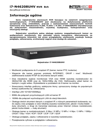 i7-N46208UHV NVR 8ch Specyfikacja techniczna Informacje ogólne Seria rejestratorów sieciowych NVR bazująca na ostatnich osiągnięciach technologicznych. i7-N46208UHV jest zbudowany na dedykowanej platformie sprzętowej (ang. embedded), pracuje z zastosowaniem nowoczesnych technik kodowania oraz dekodowania H.265, H.264+ i H.264. i7-N46208UHV charakteryzuje się połączeniem niezawodności, wysokiej wydajności, funkcjonalności oraz intuicyjnej obsługi. Rejestrator umożliwia pełną obsługę systemu megapikselowych kamer na podłączonych monitorach, bez potrzeby użycia komputera. Alternatywnie na oprogramowaniu klienckim lub przez przeglądarkę użytkownik uzyskuje funkcje podglądu, odtwarzania, archiwizacji nagrań oraz dostęp do ustawień. Rejestrator i7-N46208UHV • Możliwość podłączenia do 8 urządzeń IP (kamer, kamer PTZ, koderów). • Wsparcie dla kamer poprzez protokoły INTERNEC, ONVIF i inne*. Możliwość zdefiniowania ścieżki RTSP do strumienia danych wideo. • Dwa niezależne wyjścia monitorowe VGA oraz HDMI wysokiej rozdzielczości do 3840x2160 dla HDMI oraz do 1920x1080p dla VGA. Definiowalny układ kamer na każdym z wyjść wideo. Wyświetlanie w podziałach do 9 kamer na monitor. • Nowoczesny interfejs graficzny, estetyczne ikony; uproszczony dostęp do popularnych funkcji użytkownika np. odtwarzania. • Interfejs LAN 10/100/1000Mbps • 80Mb dla połączeń przychodzących LAN od kamer IP. • 160Mb dla połączeń wychodzących LAN do stacji klienckich. • Obsługa dwóch strumieni danych z urządzeń IP, o różnych parametrach kodowania, np.: do zapisu oraz podglądu w sieci lokalnej (wysoka rozdzielczość, jakość i liczba klatek → duży strumień), a drugi do transmisji sieciowej przez Internet (niższa rozdzielczość, jakość liczba klatek → mały strumień). • Obsługa kamer w rozdzielczościach: 8 Mpx / 6 MPx / 5 MPx / 4 Mpx / 3 MPx / 1080p / UXGA / 720p / VGA / 4CIF / DCIF / 2CIF / CIF / QCIF • Obsługa podglądu, zapisu i odtwarzania w wysokiej rozdzielczości. • Powiększenie cyfrowe w podglądzie i odtwarzaniu. Wersja 08.2016. Wszelkie prawa zastrzeżone. Dalsze informacje można uzyskać na www.internec.pl . i7-N46208UHV NVR 8ch Specyfikacja techniczna • Inteligentne wyszukiwanie nagrań (tzw. postdetekcja)** w trybach odtwarzania lokalnym oraz zdalnym przez program i7-VMS. • Odtwarzanie – różne tryby: szybki dostęp do ostatnich minut nagrania pozostawiając tryb na żywo dla pozostałych kanałów. Przejście bezpośrednio z podglądu do odtwarzania wybranego kanału. Zaawansowane wyszukiwanie według czasu, zdarzeń, zdarzeń inteligentnych**, znaczników oraz tryb odtwarzania podokresów. • Odtwarzanie - funkcje: jedno i wielokamerowe, w przód, wstecz, zwolnione, przyspieszone - duża prędkość przeglądania nagrań (aż do x128). Dodawanie własnych znaczników na nagraniu tzw. tagów ułatwia późniejszy powrót do nagrania. Szybki backup nagrań na USB z poziomu odtwarzania. • Wsparcie dla myszy w sterowaniu PTZ, w tym tryb 3D** - zaznaczając fragment obrazu kamera PTZ wykonuje zbliżenie optyczne fragmentu. • Tryb nagrywania ciągły bądź aktywowany zdarzeniem, określony harmonogramem, oddzielnie definiowalny dla każdego kanału. • Obsługiwane zdarzenia z urządzeń IP **: detekcja ruchu, alarmy inteligentne, alarmy z wejść alarmowych. • Parametry: rozdzielczość, ilość klatek, przepływność bitowa oraz jakość obrazu oddzielnie definiowalne dla każdej kamery • Definiowanie oddzielnych parametrów dla zapisu ciągłego oraz alarmowego **. • 4 wejścia alarmowe / 1 wyjście alarmowe. Możliwość powiązania wejść alarmowych z szeregiem reakcji np. wywołanie zapisu z dowolnej kamery, pozycjonowanie kamery PTZ itp. Wyjścia alarmowe mogą informować o błędach i alarmach systemowych np. uszkodzenie dysku, utrata obrazu z kamery, itp. • Konto administratora z pełnym dostępem. Możliwość tworzenia kont użytkowników o oddzielnie definiowalnych uprawnieniach dla pracy lokalnej oraz do dostępu zdalnego. Definiowanie uprawnień na poziomie kanału. • Obudowa wolnostojąca, miejsce na 2 dyski SATA. • Możliwość zamontowania do 2 HDD. • Obsługa S.M.A.R.T., standby i pre-alokacji dla HDD, obsługa dysków SATA o pojemności do 6TB każdy. Możliwość określenia przydziału dysku dla poszczególnych kamer, ustalenia limitów pojemności dla zapisu danego kanału. • Szeroki zakres diagnostyki z poziomu menu, informacje o zajętości sieci dla połączeń przychodzących oraz wychodzących, funkcja SMART dla każdego dysku. • Własny serwer DDNS ułatwia konfigurację połączenia zdalnego w lokalizacjach o zmiennym IP (np. przez Neostradę itp.) • Protokoły TCP/IP: IPv6, PPPoE, DHCP, DNS, DDNS, NTP, SADP, SMTP, SNMP, UpnP™, P2P. • Możliwość obsługi rejestratorów przez sieć TCP/IP, w pakiecie zaawansowane oprogramowanie typu CMS: i7-VMS PL bez limitu stanowisk. • Możliwość obsługi rejestratorów przez sieć TCP/IP przez przeglądarki: Firefox, IE, Opera i inne, oprogramowanie na urządzenia mobilne i7-MVS PL. *Inne obsługiwane protokoły/producentów prosimy konsultować z działem technicznym. Wersja 08.2016. Wszelkie prawa zastrzeżone. Dalsze informacje można uzyskać na www.internec.pl . i7-N46208UHV NVR 8ch Specyfikacja techniczna ** Funkcje dostępne dla urządzeń IP podłączonych po protokole INTERNEC Informacje podstawowe Do 8 urządzeń sieciowych IP (kamer, koderów). Możliwość podłączenia kamer IP, kamer PTZ IP, koderów wideo IP. Obsługiwane protokoły: INTERNEC, ONVIF, RTSP i inne*. Możliwość zapisu strumienia wideo, lub wideo + audio, definiowalna oddzielnie dla każdego kanału. • Każdy kanał obsługuje dwu-strumieniowość. • Niezależna konfiguracja dla każdego kanału, w tym rozdzielczość, liczba klatek na sekundę, przepływność bitowa, jakość obrazu. • Definiowalne ustawienia parametr