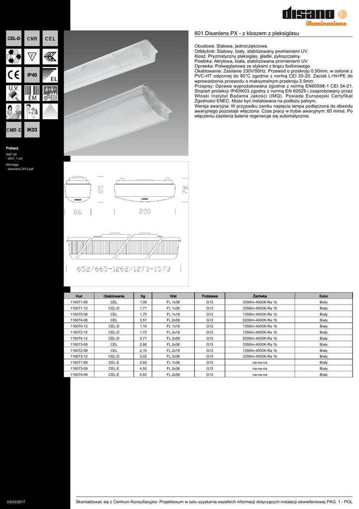 601 Disanlens PX - z kloszem z pleksiglasu Obudowa: Stalowa, jednoczęściowa. Odbłyśnik: Stalowy, biały, stabilizowany promieniami UV. Klosz: Pryzmatyczny pleksiglas, gładki, pyłoszczelny. Powłoka: Akrylowa, biała, stabilizowana promieniami UV. Oprawka: Poliwęglanowa ze stykami z brązu fosforowego. Okablowanie: Zasilanie 230V/50Hz. Przewód o przekroju 0.50mm, w osłonie z PVC-HT odpornej do 90°C zgodnie z normą CEI 20-20. Zacisk L+N+PE do wprowadzenia przewodu o maksymalnym przekroju 2.5mm. Przepisy: Oprawa wyprodukowana zgodnie z normą EN60598-1 CEI 34-21. Stopień protekcji IP40IK03 zgodny z normą EN 60529 i zaaprobowany przez Włoski Instytut Badania Jakości (IMQ). Posiada Europejski Certyfikat Zgodności ENEC. Może być instalowana na podłożu palnym. Wersja awaryjna: W przypadku zaniku napięcia lampa podłączona do obwodu awaryjnego pozostaje włączona. Czas pracy w trybie awaryjnym: 60 minut. Po włączeniu zasilania bateria regeneruje się automatycznie. Pobierz DXF 2D - d601_1.dxf Montaggi - disanlens 2013.pdf 03/03/2017 Kod Okablowanie Kg Wat Podstawa Źarówka Kolor 116071-08 CEL 1,95 FL 1x36 G13 3350lm-4000K-Ra 1b Biały 116071-12 CEL-D 1,71 FL 1x36 G13 3350lm-4000K-Ra 1b Biały 116070-08 CEL 1,70 FL 1x18 G13 1350lm-4000K-Ra 1b Biały 116074-08 CEL 3,51 FL 2x58 G13 5200lm-4000K-Ra 1b Biały 116070-12 CEL-D 1,10 FL 1x18 G13 1350lm-4000K-Ra 1b Biały 116072-12 CEL-D 1,72 FL 2x18 G13 1350lm-4000K-Ra 1b Biały 116074-12 CEL-D 3,71 FL 2x58 G13 5200lm-4000K-Ra 1b Biały 116073-08 CEL 2,86 FL 2x36 G13 3350lm-4000K-Ra 1b Biały 116072-08 CEL 2,10 FL 2x18 G13 1350lm-4000K-Ra 1b Biały 116073-12 CEL-D 3,02 FL 2x36 G13 3350lm-4000K-Ra 1b Biały 116071-09 CEL-E 2,60 FL 1x36 G13 na-na-na Biały 116073-09 CEL-E 4,50 FL 2x36 G13 na-na-na Biały 116074-09 CEL-E 6,60 FL 2x58 G13 na-na-na Biały Skontaktować się z Centrum Konsultacyjno- Projektowym w celu uzyskania wszelkich informacji dotyczących instalacji oświetleniowej. PAG 1 - POL