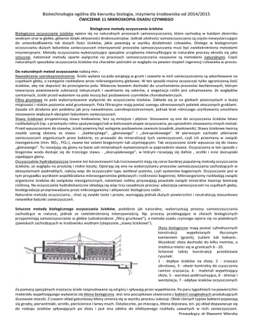 Biotechnologia ogólna dla kierunku biologia, inżynieria środowiska od 2014/2015 ĆWICZENIE 11 MIKROSKOPIA OSADU CZYNNEGO Biologiczne metody oczyszczania ścieków Biologiczne oczyszczanie ścieków opiera się na naturalnych procesach samooczyszczania, które zachodzą w każdym zbiorniku wodnym oraz w glebie, głównie dzięki aktywności drobnoustrojów. Jednak zdolności samooczyszczania są często niewystarczające do unieszkodliwienia tak dużych ilości ścieków, jakie powstają w wyniku działalności człowieka. Dlatego w biologicznym oczyszczaniu dużych ładunków zanieczyszczeń intensywność procesów samooczyszczania musi być zwielokrotniona metodami inżynieryjnymi. Metody oczyszczania wykorzystujące specjalne urządzenia intensyfikujące te naturalne procesy określa się jako sztuczne, natomiast metody oparte wyłącznie na procesach samooczyszczania nazywane są metodami naturalnymi. Część naturalnych sposobów oczyszczania ścieków ma charakter pośredni ze względu na pewien stopień ingerencji człowieka w proces. Do naturalnych metod oczyszczania należą min.: Nawadnianie szerokoprzestrzenne. Ścieki wylane na pola wsiąkają w grunt i zawarte w nich zanieczyszczenia są adsorbowane na cząstkach gleby, a następnie rozkładane przez mikroorganizmy glebowe. W ten sposób można oczyszczać tylko ograniczoną ilość ścieków, aby nie dopuścić do przeciążenia pola. Wówczas bowiem dochodzi do uruchomienia procesów beztlenowych, którym towarzyszy powstawanie substancji toksycznych i uwalnianie się odorów, a wegetacja roślin jest zahamowana. Ze względów sanitarnych, ścieki przed wylaniem na pola muszą być pozbawione czynników chorobotwórczych. Filtry gruntowe to pola wykorzystywane wyłącznie do oczyszczania ścieków. Zakłada się je na glebach piaszczystych o dużej miąższości i niskim poziomie wód gruntowych. Pola filtracyjne mają postać szeregu zdrenowanych poletek otoczonych groblami. Zasada ich działania jest podobna jak przy nawadnianiu szerokoprzestrzennym, jednak brak rolniczego użytkowania umożliwia stosowanie większych obciążeń ładunkiem zanieczyszczeń. Stawy ściekowe przypominają stawy hodowlane, lecz są mniejsze i płytsze. Stosowane są one do oczyszczania ścieków łatwo rozkładalnych (np. z przemysłu rolno-spożywczego) lub w końcowym etapie oczyszczania, po uprzednim stosowaniu innych metod. Przed wpuszczeniem do stawów, ścieki powinny być wstępnie pozbawione zawiesin (osadnik, piaskownik). Stawy ściekowe tworzą zwykle szereg złożony ze stawu : „bakteryjnego”, „glonowego” i „skorupiakowego”. W pierwszym zachodzi utlenianie zanieczyszczeń organicznych przez bakterie, co prowadzi do mineralizacji tych zanieczyszczeń, czyli ich przemiany w związki nieorganiczne (min. NO3-, PO4-), zwane też solami biogennymi lub użyźniającymi. Tak oczyszczone ścieki wpuszcza się do stawu „glonowego”. Tu rozwijają się glony na bazie soli mineralnych wytworzonych w poprzednim stawie. Oczyszczona w ten sposób z biogenów woda dostaje się do trzeciego stawu - „skorupiakowego”, w którym rozwijają się dafnie , oczliki i inne skorupiaki zajadające glony. Oczyszczalnie hydrobotaniczne (zwane też korzeniowymi lub trzcinowymi) stają się coraz bardziej popularną metodą oczyszczania ścieków, ze względu na prostotę i niskie koszty. Opierają się one na wykorzystaniu procesów samooczyszczania zachodzących w ekosystemach podmokłych, należą więc do oczyszczalni typu wetland systems, czyli systemów bagiennych. Oczyszczanie jest w tym przypadku wynikiem współdziałania mikroorganizmów glebowych i roślinności bagiennej. Mikroorganizmy rozkładają związki organiczne ścieków do związków nieorganicznych, natomiast rośliny przyswajają powstałe związki mineralne tworząc biomasę roślinną. Na oczyszczanie hydrobotaniczne składają się więc trzy zasadnicze procesy: adsorpcja zanieczyszczeń na cząstkach gleby, biodegradacja przeprowadzana przez mikroorganizmy i aktywność biologiczna roślin. Naturalne metody oczyszczania , choć są zwykle tanie i proste, wymagają jednak dużych powierzchni i neutralizują stosunkowo niewielkie ładunki zanieczyszczeń. Sztuczne metody biologicznego oczyszczania ścieków, podobnie jak naturalne, wykorzystują procesy samooczyszczania zachodzące w naturze, jednak ze zwielokrotnioną intensywnością. Np. procesy przebiegające w złożach biologicznych przypominają samooczyszczanie w glebie (udoskonalone „filtry gruntowe”), a metoda osadu czynnego opiera się na podobnych zjawiskach zachodzących w środowisku wodnym (ulepszone „stawy ściekowe”). Złoża biologiczne mają postać cylindrycznych konstrukcji wypełnionych tłuczonym kamieniem (granit), żużlem lub koksem.. Wysokość złoża dochodzi do kilku metrów, a średnica mieści się w granicach 6 - 20. Schemat takiej konstrukcji przedstawia rysunek: 1 - dopływ ścieków na złoże, 2 - zraszacz obrotowy, 3 - otwór kontrolny do czyszczenia ramion zraszacza, 4 - materiał wypełniający złoże, 5 - warstwa podtrzymująca, 6 - drenaż i wentylacja, 7 - odpływ ścieków oczyszczonych Za pomocą specjalnych zraszaczy ścieki rozpryskiwane są od góry i spływają przez wypełnienie. Po paru tygodniach na powierzchni materiału wypełniającego wytwarza się błona biologiczna. Jest ona początkowo utworzona z bakterii zooglealnych produkujących śluzowate otoczki. Z czasem skład gatunkowy błony zmienia się w wyniku procesu sukcesji. Obok różnych typów bakterii pojawiają się grzyby, pierwotniaki, wrotki, pierścienice i larwy much. Ostatecznie, po miesiącu, błona dojrzewa, tzn. jej skład dopasowuje się do rodzaju ścieków spływających po złożu i jest ona zdolna do efektywnego rozkładu zawartych w nich zanieczyszczeń. Prowadzący: dr Sławomir Wierzba Biotechnologia ogólna dla kierunku biologia, inżynieria środowiska od 2014/2015 ĆWICZE