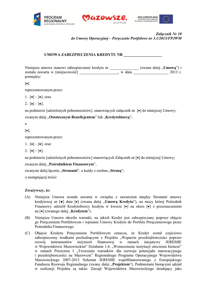 Załącznik Nr 10 do Umowy Operacyjnej – Poręczenie Portfelowe nr 3.1/2013/FPJWM UMOWA ZABEZPIECZENIA KREDYTU NR ____________________ Niniejsza umowa stanowi zabezpieczenie kredytu nr _______________ (zwana dalej „Umową”) i została zawarta w [miejscowość] ____________________, w dniu __________________ 2013 r. pomiędzy: [ ] reprezentowanym przez: 1. [ ] – [ ]; oraz 2. [ ] – [ ]; na podstawie [udzielonych pełnomocnictw], stanowiących załącznik nr [ ] do niniejszej Umowy; zwanym dalej „Ostatecznym Beneficjentem” lub „Kredytobiorcą”; a [ ], reprezentowanym przez: 1. [ ] – [ ]; oraz 2. [ ] – [ ]; na podstawie [udzielonych pełnomocnictw] stanowiących Załącznik nr [ ] do niniejszej Umowy; zwanym dalej „Pośrednikiem Finansowym”, zwanymi dalej łącznie „Stronami”, a każdy z osobna „Stroną”; o następującej treści: Zważywszy, że: (A) Niniejsza Umowa została zawarta w związku z zawarciem między Stronami umowy kredytowej nr [●] dnia [ ] (zwana dalej „Umową Kredytu”), na mocy której Pośrednik Finansowy udzielił Kredytobiorcy kredytu w kwocie [ ] na okres [ ] z przeznaczeniem na [ ] (zwanego dalej „Kredytem”). (B) Niniejsza Umowa określa warunki, na jakich Kredyt jest zabezpieczany poprzez objęcie go Poręczeniem Portfelowym i wpisanie Umowy Kredytu do Portfela Poręczeniowego przez Pośrednika Finansowego. (C) Objęcie Kredytu Poręczeniem Portfelowym oznacza, że Kredyt został częściowo zabezpieczony środkami pochodzącymi z Projektu „Wsparcie przedsiębiorczości poprzez rozwój instrumentów inżynierii finansowej w ramach inicjatywy JEREMIE w Województwie Mazowieckim” Działanie 1.4. „Wzmocnienie instytucji otoczenia biznesu” w ramach Priorytetu I „Tworzenie warunków dla rozwoju potencjału innowacyjnego i przedsiębiorczości na Mazowszu” Regionalnego Programu Operacyjnego Województwa Mazowieckiego 2007-2013 Schemat JEREMIE współfinansowanego z Europejskiego Funduszu Rozwoju Regionalnego (zwany dalej „Projektem”). Podmiotami biorącymi udział w realizacji Projektu są także: Zarząd Województwa Mazowieckiego działający jako Instytucja Zarządzająca RPO WM (zwana dalej „Instytucją Zarządzającą”) oraz Bank Gospodarstwa Krajowego, któremu Instytucja Zarządzająca powierzyła w zarząd środki pochodzące z RPO w ramach Projektu (zwany dalej „Menadżerem”). Środki pochodzące z Projektu są własnością Instytucji Zarządzającej. (D) Objęcie Kredytu Poręczeniem Portfelowym jest możliwe po spełnieniu łącznie następujących warunków: Zawarcie niniejszej Umowy; Uiszczenie przez Kredytobiorcę opłaty prowizyjnej za udzielenie Jednostkowego Poręczenia (Kredytu zabezpieczonego Jednostkowym Poręczeniem) zgodnie z wytycznymi Pośrednika Finansowego (lub Tabelą opłat i prowizji Pośrednika Finansowego)(jeśli dotyczy1); Wpisania przez Pośrednika Finansowego Umowy Kredytu do Portfela Poręczeniowego; Przedstawienie przez Ostatecznego Beneficjenta stosownych oświadczeń zgodnie z przepisami regulującymi zasady udzielania wsparcia ze środków unijnych w formie pomocy de minimis oraz wystawienie przez Pośrednika Finansowego Zaświadczenia o pomocy de minimis, które sporządza się zgodnie ze wzorem, stanowiącym załącznik do Rozporządzenia Rady Ministrów (Dz. U. z 2007 r., Nr 53, poz. 354, z późn. zm ) z dnia 20 marca 2007 r. (jeżeli dotyczy)2i; Wniesienie przez Ostatecznego Beneficjenta zabezpieczenia należytego wykonania niniejszej Umowy w postaci weksla in blanco albo oświadczenia o poddaniu się egzekucji w formie aktu notarialnego na podstawie art. 777 § 1 pkt 5 kpc zgodnie z punktem 3 poniżej. Strony Umowy postanawiają co następuje: 1. 1 2 Zobowiązania i oświadczenia Kredytobiorcy 1.1. Kredytobiorca niniejszym oświadcza, że jest świadom tego, że część środków zabezpieczających udzielony mu Kredyt ma charakter środków publicznych pochodzących z Europejskiego Funduszu Rozwoju Regionalnego (w ramach Projektu) i w związku z tym Kredytobiorca zobowiązuje się do wypełniania świadczeń wymienionych poniżej. 1.2. Kredytobiorca zobowiązuje się do przechowywania dokumentacji związanej z realizowanym przedsięwzięciem, na który udzielono mu Kredytu, przez okres do dnia 31 grudnia 2023 r. lub, w przypadku pomocy publicznej, 10 lat od dnia zawarcia niniejszej Umowy, jako Umowy Operacyjnej II Stopnia w ramach Projektu, przy czym w każdym przypadku nie krócej niż do dnia 31 grudnia 2023 r. Dokumenty powyższe należy przechowywać w formie oryginałów lub kopii poświadczonych za zgodność z oryginałem na powszechnie uznawanych nośnikach danych w …...................................................................... [podać miejsce przechowywania]. 1.3. Kredytobiorca zobowiązuje się do pisemnego powiadomienia Pośrednika Finansowego o zmianie miejsca przechowywania określonego w pkt 1.2 powyżej w przypadku jego zmiany lub w przypadku zawieszenia, likwidacji lub zaprzestania działalności Kredytobiorcy. W przypadku, gdy Jednostkowe Poręczenie udzielane na korzystniejszych warunkach finansowych niż rynkowe, de minimis, Pośrednik Finansowy ma prawo do zwolnienia uiszczania opłaty za przyznanie Jednostkowego Poręczenia. W przypadku, gdy Jednostkowe Poręczenie udzielane na korzystniejszych warunkach finansowych niż rynkowe. jest przez Pośrednika Finansowego zgodnie z zasadami udzielania pomocy Ostatecznego Beneficjenta z obowiązku jest przez Pośrednika Finansowego 2 1.4. Pośrednik Finansowy może przedłużyć termin przechowywania dokumentacji informując o tym Kredytobiorcę na piśmie przed upływem terminu przechowywania. 1.5. Kredytobiorca zobowiązuje się do prowadzenia działań informacyjnych o pochodzeniu środków zabezpieczających jego Kredyt ze środków Unii Europejskiej zgodnie z zaleceniami i informacjami przekazywanymi mu przez Pośrednika Finansowego. Pośrednikowi Finansowemu oraz Menadżerowi przysł