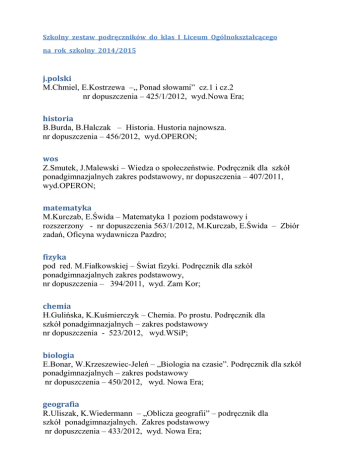 Szkolny zestaw podręczników do klas I Liceum Ogólnokształcącego na rok szkolny 2014/2015 j.polski M.Chmiel, E.Kostrzewa –„ Ponad słowami” cz.1 i cz.2 nr dopuszczenia – 425/1/2012, wyd.Nowa Era; historia B.Burda, B.Halczak – Historia. Hustoria najnowsza. nr dopuszczenia – 456/2012, wyd.OPERON; wos Z.Smutek, J.Malewski – Wiedza o społeczeństwie. Podręcznik dla szkół ponadgimnazjalnych zakres podstawowy, nr dopuszczenia – 407/2011, wyd.OPERON; matematyka M.Kurczab, E.Świda – Matematyka 1 poziom podstawowy i rozszerzony - nr dopuszczenia 563/1/2012, M.Kurczab, E.Świda – Zbiór zadań, Oficyna wydawnicza Pazdro; fizyka pod red. M.Fiałkowskiej – Świat fizyki. Podręcznik dla szkół ponadgimnazjalnych zakres podstawowy, nr dopuszczenia – 394/2011, wyd. Zam Kor; chemia H.Gulińska, K.Kuśmierczyk – Chemia. Po prostu. Podręcznik dla szkół ponadgimnazjalnych – zakres podstawowy nr dopuszczenia - 523/2012, wyd.WSiP; biologia E.Bonar, W.Krzeszewiec-Jeleń – „Biologia na czasie”. Podręcznik dla szkół ponadgimnazjalnych – zakres podstawowy nr dopuszczenia – 450/2012, wyd. Nowa Era; geografia R.Uliszak, K.Wiedermann – „Oblicza geografii” – podręcznik dla szkół ponadgimnazjalnych. Zakres podstawowy nr dopuszczenia – 433/2012, wyd. Nowa Era; wiedza o kulturze K.Moraczewski, St. Kandulski –„Picasso, Krzyżowcy i afrykańscy czarodzieje” nr dopuszczenia - 490/2012, wyd. eMPi2; podstawy przedsiębiorczości J.Korba, Z.Smutek - Podstawy przedsiębiorczości. „Odkrywamy na nowo”, wyd. OPERON, nr dopuszczenia – 483/2012: informatyka E.Krawczyński, M.Wilk, Z.Talaga –„Informatyka nie tylko dla uczniów”, zakres podstawowy, nr dopuszczenia – 414/2012, wyd. PWN; edukacja dla bezpieczeństwa M.Goniewicz, A.Nowak-Kowal, Z.Smutek Edukacja dla bezpieczeństwa nr dopuszczenia – 411/2012, wyd. OPERON; religia Red. ks. J.Szpet – „Moje miejsce w kościele” Podręczniki do j.angielskiego i j.niemieckiego podane będą w pierwszych dniach września po dokonaniu podziału klas na grupy językowe.