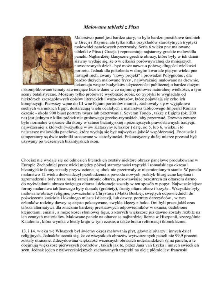 Malowane tabletki z Pitsa Malarstwo panel jest bardzo stary; to było bardzo prestiżowe średnich w Grecji i Rzymie, ale tylko kilka przykładów starożytnych tryptyki malowideł panelowych przetrwały. Seria 6 wieku pne malowane tabletki z Pitsa ( Grecja ) reprezentują najstarszy greckie malowidła panelu. Najbardziej klasyczne greckie obrazy, które były w ich dzień sławny wydaje się, że o wielkości porównywalnej do mniejszych nowoczesnych dzieł - być może nawet o połowę długości wielkości portretu. Jednak dla pokolenia w drugim kwartale piątym wieku pne nastąpił ruch, zwany "nowy projekt" i prowadził Polygnotus , dla bardzo dużych malowane fryzy , najwyraźniej malowane na drewnie, dekoracja wnętrz budynków użyteczności publicznej o bardzo dużym i skomplikowane tematy zawierające liczne dane w co najmniej połowie naturalnej wielkości, a tym sceny batalistyczne. Możemy tylko próbować wyobrazić sobie, co tryptyki to wyglądało od niektórych szczegółowych opisów literackich i waza-obrazów, które pojawiają się echo ich kompozycji. Pierwszy wpne do III wne Fajum portretów mumii , zachowały się w wyjątkowo suchych warunkach Egipt, dostarczają wielu ocalałych z malarstwa tablicowego Imperial Roman okresie - około 900 biust portrety twarz lub przetrwania. Severan Tondo , także z Egiptu (ok. 200 ne) jest jednym z kilku próbek nie grobowego grecko-rzymskich, aby przetrwać. Drewno zawsze było normalne wsparcie dla ikony w sztuce bizantyjskiej i późniejszych prawosławnych tradycji, najwcześniej z których (wszystkie w św Katarzyny Klasztor ) datę, od 5. lub 6. wieku, i to najstarsze malowidła panelowe, które wydają się być najwyższa jakość współczesnej. Encaustic i temperatury są dwie techniki stosowane w starożytności. Enkaustyczny dużej mierze przestał być używany po wczesnych bizantyjskich ikon. Chociaż nie wydaje się od odniesień literackich zostały niektóre obrazy panelowe produkowane w Europie Zachodniej przez wieki między późnej starożytności tryptyki i romańskiego okresu i bizantyjskie ikony zostały przywiezione, są obok nie przetrwały w niezmienionym stanie. W panelu malarstwo 12 wieku doświadczył przebudzenia z powodu nowych praktyk-liturgiczne kapłana i zgromadzenia były teraz na tej samej stronie ołtarza, pozostawiając przestrzeń za ołtarzem darmo do wyświetlania obrazu świętego ołtarza i dekoracje zostały w ten sposób w popyt. Najwcześniejsze formy malarstwa tablicowego były dossals (grzbiety), fronty ołtarz ołtarz i krzyże . Wszystkie były malowane obrazy religijne, powszechnie Chrystusa i Matki Boskiej, świętych odpowiednich do poświęcenia kościoła i lokalnego miasta i diecezji, lub dawcy. portrety darczyńców , w tym członków rodziny dawcy są często pokazywane, zwykle klęczy z boku. Oni byli przez jakiś czas tańsza alternatywa dla znacznie bardziej prestiżowych odpowiedników w okucia, ozdobione klejnotami, emalii , a może kości słoniowej figur, z których większość już dawno zostały rozbite na ich cennych materiałów. Malowane panele na ołtarze są najbardziej liczne w Hiszpanii, szczególnie Katalonia , która wynika z biedy kraju w tym czasie, a także braku reformacji ikonoklazmu. 13. i 14. wieku we Włoszech był świetny okres malowania płyt, głównie ołtarzy i innych dzieł religijnych. Jednakże ocenia się, że ze wszystkich obrazów wytworzonych paneli nie 99,9 procent zostały utracone. Zdecydowana większość wczesnych obrazach niderlandzkich są na panelu, a te obejmują większość pierwszych portretów , takich jak te, przez Jana van Eycka i innych świeckich scen. Jednak jeden z najwcześniejszych zachowanych tryptyki na oleje płótnie jest francuski