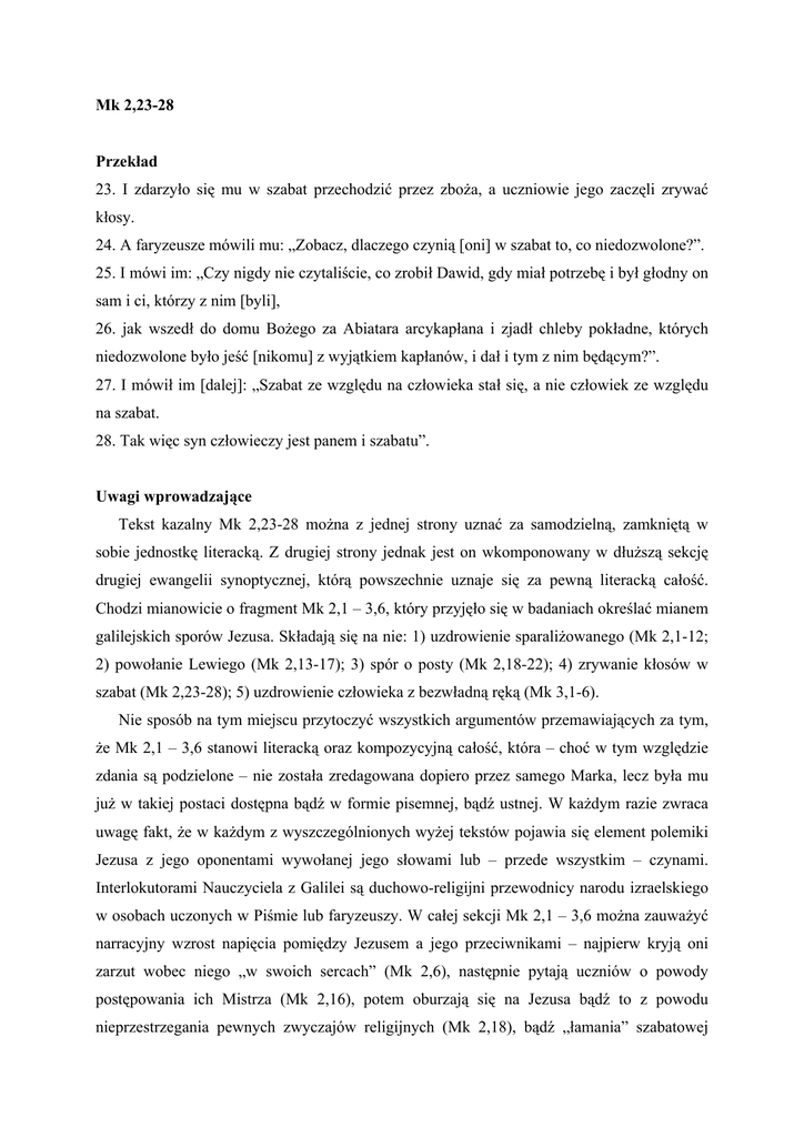 Mk 2,23-28 Przekład 23. I zdarzyło się mu w szabat przechodzić przez zboża, a uczniowie jego zaczęli zrywać kłosy. 24. A faryzeusze mówili mu: „Zobacz, dlaczego czynią [oni] w szabat to, co niedozwolone?”. 25. I mówi im: „Czy nigdy nie czytaliście, co zrobił Dawid, gdy miał potrzebę i był głodny on sam i ci, którzy z nim [byli], 26. jak wszedł do domu Bożego za Abiatara arcykapłana i zjadł chleby pokładne, których niedozwolone było jeść [nikomu] z wyjątkiem kapłanów, i dał i tym z nim będącym?”. 27. I mówił im [dalej]: „Szabat ze względu na człowieka stał się, a nie człowiek ze względu na szabat. 28. Tak więc syn człowieczy jest panem i szabatu”. Uwagi wprowadzające Tekst kazalny Mk 2,23-28 można z jednej strony uznać za samodzielną, zamkniętą w sobie jednostkę literacką. Z drugiej strony jednak jest on wkomponowany w dłuższą sekcję drugiej ewangelii synoptycznej, którą powszechnie uznaje się za pewną literacką całość. Chodzi mianowicie o fragment Mk 2,1 – 3,6, który przyjęło się w badaniach określać mianem galilejskich sporów Jezusa. Składają się na nie: 1) uzdrowienie sparaliżowanego (Mk 2,1-12; 2) powołanie Lewiego (Mk 2,13-17); 3) spór o posty (Mk 2,18-22); 4) zrywanie kłosów w szabat (Mk 2,23-28); 5) uzdrowienie człowieka z bezwładną ręką (Mk 3,1-6). Nie sposób na tym miejscu przytoczyć wszystkich argumentów przemawiających za tym, że Mk 2,1 – 3,6 stanowi literacką oraz kompozycyjną całość, która – choć w tym względzie zdania są podzielone – nie została zredagowana dopiero przez samego Marka, lecz była mu już w takiej postaci dostępna bądź w formie pisemnej, bądź ustnej. W każdym razie zwraca uwagę fakt, że w każdym z wyszczególnionych wyżej tekstów pojawia się element polemiki Jezusa z jego oponentami wywołanej jego słowami lub – przede wszystkim – czynami. Interlokutorami Nauczyciela z Galilei są duchowo-religijni przewodnicy narodu izraelskiego w osobach uczonych w Piśmie lub faryzeuszy. W całej sekcji Mk 2,1 – 3,6 można zauważyć narracyjny wzrost napięcia pomiędzy Jezusem a jego przeciwnikami – najpierw kryją oni zarzut wobec niego „w swoich sercach” (Mk 2,6), następnie pytają uczniów o powody postępowania ich Mistrza (Mk 2,16), potem oburzają się na Jezusa bądź to z powodu nieprzestrzegania pewnych zwyczajów religijnych (Mk 2,18), bądź „łamania” szabatowej kazuistyki (Mk 2,24), a wreszcie jawnie naradzają się, jak Nauczyciela z Galilei zabić (Mk 3,6). Sama struktura literacka tekstu kazalnego jest przejrzysta i typowa dla wielu tekstów ewangelicznych relacjonujących polemiki Jezusa z jego adwersarzami: 1) wprowadzenie narracyjno-sytuacyjne (w. 23); 2) pytanie – zarzut faryzeuszów (w. 24); 3) dwuczłonowa odpowiedź Jezusa: powołanie się na przykład Dawida (w. 25n) i logion o szabacie (w. 27); 4) logion o Synu Człowieczym (w. 28). Warto wreszcie dodać, ze nie ma powodu – jak chcą niektórzy egzegeci – by zaprzeczać historyczności zrelacjonowanego w Mk 2,23-28 wydarzenia. Oczywiście należy liczyć się z tym, że w procesie przekazu tradycji ustęp ten został w pewnym stopniu zmodyfikowany, niemniej jednak w swym jądrze sięga on historycznego Jezusa. Komentarz W. 23. Wiersz ten – jak zasygnalizowano – stanowi narracyjno-sytuacyjne wprowadzenie do całej relacji. Jest ono jednak zarówno ważne, jak i pewnym stopniu kłopotliwe. Ważne dlatego, że nakreśla okoliczności, które stają się zarzewiem konfliktu i dysputy Markowego Jezusa z jego – tu jeszcze dokładnie nie wskazanymi – oponentami. Kłopotliwe zaś dlatego, że nie sytuuje całego wydarzenia w sposób precyzyjny w miejscu i czasie. Jest tylko ogólnie wzmiankowane, że był dzień szabatu. Gdzie miało miejsce całe wydarzenie, też nie wiadomo. Jedynie z kontekstu poprzedzającego można wnioskować, że najprawdopodobniej gdzieś w okolicach Kafarnaum. O ile pierwsza część tego wiersza nie przysparza translacyjnych trudności, o tyle pojawiają się one w drugiej. Niemalże wszystkie przekłady biblijne tłumaczą ten fragment, z niewielkimi wariacjami, jako a uczniowie jego zaczęli w drodze zrywać kłosy. Tekst grecki brzmi jednak na tym miejscu następująco: kai hoi mathetai autou erksanto hodon poiein tillontes tous stachuas, co należałoby przełożyć: a uczniowie jego zaczęli czynić (torować) drogę zrywając kłosy. Problematyczny jest tutaj zwrot hodon poiein – czynić (torować) drogę. Jest on w języku greckim niespotykany i wszystko wskazuje na to, że nie można go rozumieć dosłownie, a w konsekwencji trzeba tłumaczyć go ad sensum. Trudno bowiem wyobrazić sobie, by torowanie drogi przez łany zbóż miało odbywać się przez zrywanie samych kłosów. Poza tym, jak wynika z dalszej części tekstu, a dokładniej z odpowiedzi Jezusa (por. w. 25n), celem zrywania kłosów przez uczniów nie było przygotowanie drogi, a zaspokojenie głodu. To w potrzebie uczniów należy upatrywać powodu, dla którego zrywali oni kłosy, a nie w konieczności utorowania drogi. Fragment kai hoi mathetai autou erksanto hodon poiein tillontes tous stachuas należy więc odczytywać z perspektywy dalszej części całej relacji. W. 24. Na arenie wydarzeń nagle pojawiają się przeciwnicy Jezusa w osobach faryzeuszów. Skąd się tu wzięli? Najwyraźniej cały czas obserwowali oni Jezusa. Dostrzegają oni postępowanie uczniów i zadają Nauczycielowi z Galilei prowokacyjne pytanie: Zobacz, dlaczego czynią [oni] w szabat to, co niedozwolone?. Strażnicy szabatowej kazuistyki dopatrują się w postępowaniu uczniów wykroczenia. Na czym ono polegało? Z jednej strony na samym fakcie zrywania kłosów, a więc faryzeusze zinterpretowali działanie uczniów jako formę pracy, niedozwolonej wszakże w dzień szabatu. Nieistotne dla nich było to, że uczniowie pragnęli zaspokoić swój głód, a ich postę