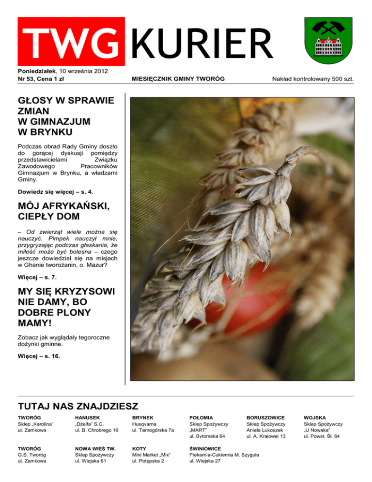 TWG KURIER Poniedziałek, 10 września 2012 Nr 53, Cena 1 zł MIESIĘCZNIK GMINY TWORÓG Nakład kontrolowany 500 szt. GŁOSY W SPRAWIE ZMIAN W GIMNAZJUM W BRYNKU Podczas obrad Rady Gminy doszło do gorącej dyskusji pomiędzy przedstawicielami Związku Zawodowego Pracowników Gimnazjum w Brynku, a władzami Gminy. Dowiedz się więcej – s. 4. MÓJ AFRYKAŃSKI, CIEPŁY DOM – Od zwierząt wiele można się nauczyć. Pimpek nauczył mnie, przygryzając podczas głaskania, że miłość może być bolesna – czego jeszcze dowiedział się na misjach w Ghanie tworożanin, o. Mazur? Więcej – s. 7. MY SIĘ KRYZYSOWI NIE DAMY, BO DOBRE PLONY MAMY! Zobacz jak wyglądały tegoroczne dożynki gminne. Więcej – s. 16. TUTAJ NAS ZNAJDZIESZ TWORÓG Sklep „Karolina” ul. Zamkowa HANUSEK „Dżelfa” S.C. ul. B. Chrobrego 16 BRYNEK Husqvarna ul. Tarnogórska 7a POŁOMIA Sklep Spożywczy „MART” ul. Bytomska 64 BORUSZOWICE Sklep Spożywczy Aniela Lukoszek ul. A. Krajowej 13 TWORÓG G.S. Tworóg ul. Zamkowa NOWA WIEŚ TW. Sklep Spożywczy ul. Wiejska 61 KOTY Mini Market „Mix” ul. Potępska 2 ŚWINIOWICE Piekarnia-Cukiernia M. Szyguła ul. Wiejska 27 WOJSKA Sklep Spożywczy „U Nowaka” ul. Powst. Śl. 64 TWG KURIER WSTĘPNIAK OD REDAKCJI SPIS TREŚCI DRODZY MIESZKAŃCY, TABLICA777777777777777777....str.3 SESJA77777777777777777777.str.4 - Niezbędnik mieszkańca gminy - Głosy w sprawie zmian w gimnazjum w Brynku PRAWNIK777777777777.777777..str.5 - Prawa i obowiązki najemcy HOBBYSTA777777777777.77777..str.6 - Mistrz z Tworoga POD LUPĄ77777777777777777.7str.7 - Mój afrykański, ciepły dom - Odbudowując swoją historię - Co kryją nasze gminne lasy? KULTURALNIE7777777777777.7.7str.10 - Ferie z Gminnym Ośrodkiem Kultury - Plenerowa zabawa - W pogoni za ojcem Mateuszem - „Dziękuję za fajowskie półkolonie...” - Tajemnica kartonika NA BIEŻĄCO7777777777777.777.str.13 - Druga kadencja pani sołtys - Kuchenna rewolucja w Świniowicach - 998, czyli ratujemy i uczymy ratować z OSP w Tworogu - Dumna OSP w Boruszowicach-Hanusku - Raj – Poraj - Podsumowanie sezonu w „Brzeźnicy” - Otwarcie placu zabaw w „Brzeźnicy” - Europejska Gmina Tworóg - My się kryzysowi nie damy, bo dobre plony mamy! Po wakacyjnej przerwie wracamy z kolorową okładką, pełni energii, gotowi by jeszcze ciekawiej przekazywać wam wieści z gminy. Dziękujemy za wasze zainteresowanie gazetą i maile wysyłane na naszą pocztę internetową. Dzięki nim wiemy z jakimi problemami się borykacie i o czym chcielibyście przeczytać na naszych łamach. We wrześniowym numerze piszemy m.in. o hodowcy papużek, który zdobył tytuł Mistrza Polski, przybliżamy życie misjonarza w Afryce, zdradzamy gdzie warto wybrać się na spacer. Wspominamy również letnie festyny oraz dożynki gminne, które w tym roku odbyły się w Wojsce. W „prawniku” przybliżamy prawo lokatorskie, a w „na bieżąco” podsumowujemy sezon w Ośrodku Wypoczynkowym „Brzeźnica”. Zapraszamy do lektury! www.twg-kurier.pl [email protected] REDAKCJA redaktor naczelna: Marta Kobędza-Krain dziennikarze: Grażyna Chmiel Agata Frączek Ewa Jaruszowic KREACJA Łukasz Krain MECENAT Grażyna Chmiel – dyrektor Gminnego Ośrodka Kultury GOŚCINNIE Łukasz Frączek, Alina Łukoszek, Błażej Śliwiński, Elżbieta Zawartka, Monika Ziob WYDAWCA Gminny Ośrodek Kultury w Tworogu, ul. Zamkowa 1, 42-690 Tworóg, tel. (32) 285 74 92 DRUK Foto&druk Damian Zymela Redakcja zastrzega sobie prawo do redagowania i skracania tekstów przesyłanych do druku. 2 TWG KURIER TABLICA XX JUBILEUSZOWA PIELGRZYMKA NA JASNĄ GÓRĘ „Kościół Naszym Domem” – to hasło tegorocznej Diecezjalnej Pieszej Pielgrzymki Gliwickiej na Jasną Górę, która w tym roku obchodziła jubileusz dwudziestolecia. Historia pielgrzymowania na Jasną Górę sięga 1626 r. – czasów wojny trzydziestoletniej, kiedy to wojska duńskie oblegały Gliwice. To właśnie wtedy mieszkanki Gliwic ślubowały Maryji coroczne pielgrzymowanie na Jasną Górę, w zamian za ocalenie ich miasta. I tak Gliwice zostały ocalone, a Gliwiczanie już w tym samym roku pieszo ruszyli do Częstochowy, by podziękować Matce Bożej za ratunek. Tradycja utrzymuje się już prawie 400 lat. W sobotę 18 sierpnia o godz. 6 rano pielgrzymi wyruszyli z Boronowa do Częstochowy. Wejście kilkunastu różnokolorowych, rozśpiewanych grup na Jasną Górę miało miejsce około godz. 14. MAMY KOMISARIAT! Co roku parafianie Diecezji Gliwickiej zbierają się pod koniec sierpnia i wyruszają pieszo z Katedry Gliwickiej w kierunku Częstochowy. Tegoroczna pielgrzymka była już XX pielgrzymką diecezjalną i 366 pielgrzymką ślubowaną. W tym roku zgromadziła ona w 11 grupach 1686 pielgrzymów, w tym 36 kapłanów, 19 kleryków, 11 sióstr zakonnych. Najmłodszym uczestnikiem była pięcioletnia Kinga, natomiast najstarsi pielgrzymi liczyli sobie po osiemdziesiąt lat. W związku ze zmianami organizacyjnymi w Komendzie Powiatowej Policji w Tarnowskich Górach, tworoski posterunek został przekształcony w komisariat. Uroczyste otwarcie miało miejsce 3 września. W wydarzeniu uczestniczył komendant powiatowy Policji w Tarnowskich Górach, przewodnicząca rady gminy – Maria Łukoszek oraz wójtowie i zastępcy wójtów gmin Tworóg i Krupski Młyn, na terenie których działa komisariat. Mieszkańcy naszej gminy pielgrzymowali w grupie "Fioletowej 1" (grupa dekanalna toszecka). W naszych szeregach również znalazł się osiemdziesięciolatek, pan Jan. "Fioletowi 1" to najliczniejsza grupa. Co roku przybywa w niej pielgrzymów. Tym razem liczyła 224 osoby. W praktyce zmiany oznaczają zwiększenie ilości etatów policjantów patrolowych. Mieszkańcy mogą się więc spodziewać liczniejszych patroli. Komendantem został dotychczasowy kierownik posterunku – asp. sztab. Adam Wylon. Tegoroczna Pielgrzymka trwała krócej niż zwykle. Po raz pierwszy tylko 3 dni, a nie jak dotychczas – 4. W 