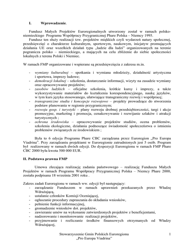 I. Wprowadzenie. Fundusz Małych Projektów Euroregionalnych utworzony został w ramach polskoniemieckiego Programu Współpracy Przygranicznej Phare Polska – Niemcy 1995. Fundusz ten służy realizacji tzw. projektów miękkich czyli wydarzeń natury społecznej, przedsięwzięć o charakterze kulturalnym, sportowym, naukowym, inicjatyw promujących działania UE oraz wszelkich działań typu „ludzie dla ludzi” organizowanych na terenie pogranicza polsko – niemieckiego, a mających na celu zbliżenie do siebie społeczności lokalnych z terenu Polski i Niemiec. W ramach FMP organizowane i wspierane są przedsięwzięcia z zakresu m.in. - wymiany kulturalnej – spotkania i wymiana młodzieży, działalność artystyczna i sportowa, imprezy ludowe; demokracji lokalnej – szkolenia, dostarczanie informacji, wizyty na zasadzie wymiany oraz opracowywanie projektów; zasobów ludzkich – oficjalne szkolenia, krótkie kursy i imprezy, a także wykorzystywanie materiałów do kształcenia korespondencyjnego, naukę języków, w tym kurs języka stosowanego, ułatwiające transgraniczny rozwój i współpracę; transgraniczne studia i koncepcje rozwojowe – projekty prowadzące do stworzenia podstaw planowania w regionie przygranicznym; rozwoju gosp. i turystyki – plany rozwoju drobnej przedsiębiorczości, targi i akcje promocyjne, marketing i promocja, oznakowywanie i rozwijanie szlaków i atrakcji turystycznych ; ochrona środowiska – opracowywanie projektów studiów, ocena problemów, szkolenia ekologiczne, działania podnoszące świadomość społeczeństwa o istnieniu problemów związanych ze środowiskiem ; Była to 6 edycja Programu Phare CBC zarządzana przez Euroregion „Pro Europa Viadrina”. Przy zarządzaniu projektami w Euroregionie zatrudnionych jest 5 osób. Program był realizowany w ramach dwóch edycji. Do dyspozycji Euroregionu w ramach FMP Phare CBC 2000 była kwota 500 000 EUR. II. Podstawa prawna FMP Umowa zlecająca realizację zadania państwowego – realizację Funduszu Małych Projektów w ramach Programu Współpracy Przygranicznej Polska – Niemcy Phare 2000, została podpisana 18 września 2001 roku . Zakres zadań Euroregionu w ramach ww. edycji był następujący: - zarządzanie Funduszem w ramach uprawnień przekazanych przez Władzę Wdrażającą, - ustalanie członków Komisji Oceniającej, - ogłaszanie procedury zapraszania do składania wniosków, - pełnienie funkcji informacyjnej, - gromadzenie wniosków dot. projektów, - zawieranie umów na wykonanie zatwierdzonych projektów z beneficjentami, - nadzorowanie i monitorowanie realizacji projektów, - przyjmowanie i rozliczanie środków finansowych otrzymanych od Władzy Wdrażającej, Stowarzyszenie Gmin Polskich Euroregionu „Pro Europa Viadrina” 1 - przestrzeganie terminowości wykonania projektów, gromadzenie raportów od beneficjentów, sporządzanie raportów podsumowujących wykorzystanie poszczególnych transz, na potrzeby Władzy Wdrażającej. III. Opis wyboru projektów Ogłoszenia o naborze projektów ukazały się odpowiednio 20.03.2002 r. i 12.09.2002 r. Na przełomie lutego i marca 2002 przeprowadzono cykl szkoleń dla beneficjentów. Celem warsztatów było zapoznanie uczestników z kompletem dokumentów, które obowiązywały w Euroregionie, a były konieczne do sporządzenia wniosku. Na szkoleniach omawiane były wytyczne Funduszu Małych Projektów Phare CBC 2000, procedura selekcji, przedstawiano zasady i etapy prawidłowego wypełniania wniosków. Z oferty szkoleń w ramach dwóch edycji skorzystało łącznie 348 osób. Na szkolenia wysłano w sumie 353 pisemne zaproszenia bezpośrednio do beneficjentów z terenu Euroregionu jak i urzędów miast i gmin członkowskich z prośbą o poinformowanie podległych im jednostek o możliwości ubiegania się ośrodki Phare i możliwość udziału w szkoleniach. Łącznie przeprowadzono 11 szkoleń: - 19.02.2002 r. – w Drezdenku ( dla powiatu strzelecko – drezdeneckiego) - 21.02.2002 r. – w Międzyrzeczu ( dla powiatu międzyrzeckiego) - 25.02.2002 r. – w Słubicach ( dla powiatu słubickiego) - 27.02.2002 r. – w Lubniewicach (dla powiatu sulęcińskiego) - 01.03.2002 r. – w Gorzowie ( dla powiatu gorzowskiego - grodzkiego) - 05.03.2002 r. – w Kostrzynie ( dla powiatu gorzowskiego – ziemskiego) - 12.04.2002 r. – w Dębnie (dla miasta Dębna) - 17.09.2002 r. – w Gorzowie ( dla powiatu strzelecko – drezdeneckiego, powiatu międzyrzeckiego, i powiatu gorzowskiego) - 19.09.2002 r. – w Gorzowie ( dla powiatu słubickiego, powiatu sulęcińskiego i miasta Dębna) - 20.09.2002 r – w Gorzowie ( dla miasta Gorzowa) Posiedzenia Komisji Oceniającej miały miejsce 10-12.06.2002 r w Przeborowie oraz 21-22.10.2002r w Gorzowie Wlkp. W odniesieniu do I edycji FMP 2000 w terminie do 20 maja 2002 r. do godz. 15:00 wpłynęło 62 wnioski, w tym 2 wpłynęły po terminie. Komisja Oceniająca po ocenie formalnej odrzuciła 21 wniosków a po technicznej 8 wniosków. Ogółem Komisja Oceniająca udzieliła wsparcia 31 wnioskom na łączna kwotę 271 883 EUR. Po przesłaniu raportu do Przedstawicielstwa Komisji Europejskiej ostatecznie zostało zaakceptowanych 29 wniosków na łączną kwotę 246 266 EUR. W odniesieniu do II edycji FMP 2000 w terminie do 11 października 2002 r. do godz. 15:00 wpłynęło 65 wniosków. Komisja Oceniająca po ocenie formalnej odrzuciła 32 wnioski a po technicznej 5 wniosków. Ogółem Komisja Oceniająca udzieliła wsparcia 28 wnioskom na łączną kwotę 228 734 EUR. Po przesłaniu raportu do Przedstawicielstwa Komisji Europejskiej ostatecznie zostało zaakceptowanych 22 wnioski na łączną kwotę 170 469,67 EUR. Pisma dotyczące informacji o rekomendacji wniosków zostały przekazane beneficjentom 23 sierpnia 2002 (I edycja) oraz 27 listopada 2002 (II edycja). Stowarzyszenie Gmin Polskich Euroregionu „Pro Europa Viadrina” 2 Tabela 1. Harmonogram działań w ramach FMP Dzia