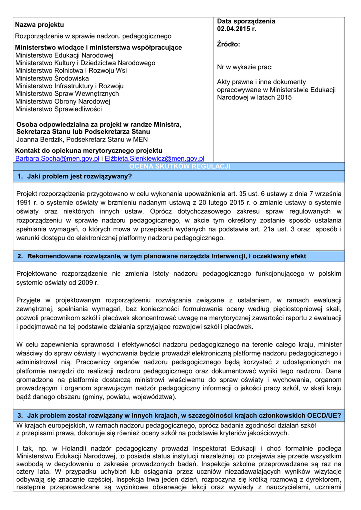 Nazwa projektu Rozporządzenie w sprawie nadzoru pedagogicznego Ministerstwo wiodące i ministerstwa współpracujące Ministerstwo Edukacji Narodowej Ministerstwo Kultury i Dziedzictwa Narodowego Ministerstwo Rolnictwa i Rozwoju Wsi Ministerstwo Środowiska Ministerstwo Infrastruktury i Rozwoju Ministerstwo Spraw Wewnętrznych Ministerstwo Obrony Narodowej Ministerstwo Sprawiedliwości Data sporządzenia 02.04.2015 r. Źródło: Nr w wykazie prac: Akty prawne i inne dokumenty opracowywane w Ministerstwie Edukacji Narodowej w latach 2015 Osoba odpowiedzialna za projekt w randze Ministra, Sekretarza Stanu lub Podsekretarza Stanu Joanna Berdzik, Podsekretarz Stanu w MEN Kontakt do opiekuna merytorycznego projektu [email protected] i Elż[email protected] OCENA SKUTKÓW REGULACJI 1. Jaki problem jest rozwiązywany? Projekt rozporządzenia przygotowano w celu wykonania upoważnienia art. 35 ust. 6 ustawy z dnia 7 września 1991 r. o systemie oświaty w brzmieniu nadanym ustawą z 20 lutego 2015 r. o zmianie ustawy o systemie oświaty oraz niektórych innych ustaw. Oprócz dotychczasowego zakresu spraw regulowanych w rozporządzeniu w sprawie nadzoru pedagogicznego, w akcie tym określony zostanie sposób ustalania spełniania wymagań, o których mowa w przepisach wydanych na podstawie art. 21a ust. 3 oraz sposób i warunki dostępu do elektronicznej platformy nadzoru pedagogicznego. 2. Rekomendowane rozwiązanie, w tym planowane narzędzia interwencji, i oczekiwany efekt Projektowane rozporządzenie nie zmienia istoty nadzoru pedagogicznego funkcjonującego w polskim systemie oświaty od 2009 r. Przyjęte w projektowanym rozporządzeniu rozwiązania związane z ustalaniem, w ramach ewaluacji zewnętrznej, spełniania wymagań, bez konieczności formułowania oceny według pięciostopniowej skali, pozwoli pracownikom szkół i placówek skoncentrować uwagę na merytorycznej zawartości raportu z ewaluacji i podejmować na tej podstawie działania sprzyjające rozwojowi szkół i placówek. W celu zapewnienia sprawności i efektywności nadzoru pedagogicznego na terenie całego kraju, minister właściwy do spraw oświaty i wychowania będzie prowadził elektroniczną platformę nadzoru pedagogicznego i administrował nią. Pracownicy organów nadzoru pedagogicznego będą korzystać z udostępnionych na platformie narzędzi do realizacji nadzoru pedagogicznego oraz dokumentować wyniki tego nadzoru. Dane gromadzone na platformie dostarczą ministrowi właściwemu do spraw oświaty i wychowania, organom prowadzącym i organom sprawującym nadzór pedagogiczny informacji o jakości pracy szkół, w skali kraju bądź danego obszaru (gminy, powiatu, województwa). 3. Jak problem został rozwiązany w innych krajach, w szczególności krajach członkowskich OECD/UE? W krajach europejskich, w ramach nadzoru pedagogicznego, oprócz badania zgodności działań szkół z przepisami prawa, dokonuje się również oceny szkół na podstawie kryteriów jakościowych. I tak, np. w Holandii nadzór pedagogiczny prowadzi Inspektorat Edukacji i choć formalnie podlega Ministerstwu Edukacji Narodowej, to posiada status instytucji niezależnej, co przejawia się przede wszystkim swobodą w decydowaniu o zakresie prowadzonych badań. Inspekcje szkolne przeprowadzane są raz na cztery lata. W przypadku uchybień lub osiągania przez uczniów niezadawalających wyników wizytacje odbywają się znacznie częściej. Inspekcja trwa jeden dzień, rozpoczyna się krótką rozmową z dyrektorem, następnie przeprowadzane są wycinkowe obserwacje lekcji oraz wywiady z nauczycielami, uczniami i rodzicami. Holenderscy inspektorzy po każdej wizytacji sporządzają krótki, dwustronicowy raport, jakościowy, który zawiera opis dobrych i słabych elementów pracy szkoły oraz podaje ocenę w kontekście średnich wyników krajowych. Zadaniem szkoły jest wdrożenie działań mających na celu poprawę w obszarach wskazanych jako słabe. W Irlandii jednostką odpowiedzialną za ewaluację podstawowych i ponadpodstawowych szkół i placówek jest departament Ministerstwa Edukacji i Umiejętności o nazwie Inspektorat. Przeprowadzenie całościowej ewaluacji placówki szkolnej obejmuje pięć obszarów jej działalności: jakość zarządzania szkołą, jakość planowania, jakość programu nauczania, jakość nauczania i uczenia się, jakość wsparcia udzielanego uczniom. Głównym zadaniem ewaluacji jest dostarczenie szkole informacji na temat jej dobrych i słabych stron. W końcowym raporcie inspektorzy nie wystawiają ocen, lecz formułują wnioski i rekomendacje z ewaluacji bez odwoływania się do danych ilościowych lub źródeł pozyskania informacji. Podczas ewaluacji przedmiotowej inspekcji poddaje się wszystkie elementy mające wpływ na jakość nauczania danego przedmiotu. Podczas jednego dnia inspektorzy obserwują 5-6 lekcji, poddając analizie proces nauczania i uczenia się, formy oceniania, zasady udzielania informacji zwrotnej uczniowi i jego rodzicom oraz dokumenty świadczące o sposobach planowania pracy przez nauczyciela. W Anglii nadzór pedagogiczny i wizytacje szkolne realizowane są przez Urząd ds. Standardów w Edukacji, Opieki nad Dziećmi i Umiejętności OFSTED. Angielski system nadzoru pedagogicznego koncentruje się przede wszystkim na wynikach egzaminów zewnętrznych i to one rzutują na ostateczną ocenę szkoły. Czynniki, które także są brane pod uwagę podczas kontroli to efektywność kształcenia, wielokulturowość, pochodzenie etniczne, równość płci i integracja uczniów o zróżnicowanych i specyficznych możliwościach edukacyjno-wychowawczych. Końcowy raport z przeprowadzonej wizytacji przedstawia informacje w odniesieniu do trzech obszarów pracy szkoły: prezentuje wyniki i osiągniecia uczniów, ukazuje w jakim stopniu szkoła wyrównuje szanse edukacyjne oraz przedstawia jakość szkolnych działań na rzecz bezpieczeństwa. Źródło: „Nadzór pedagogiczny