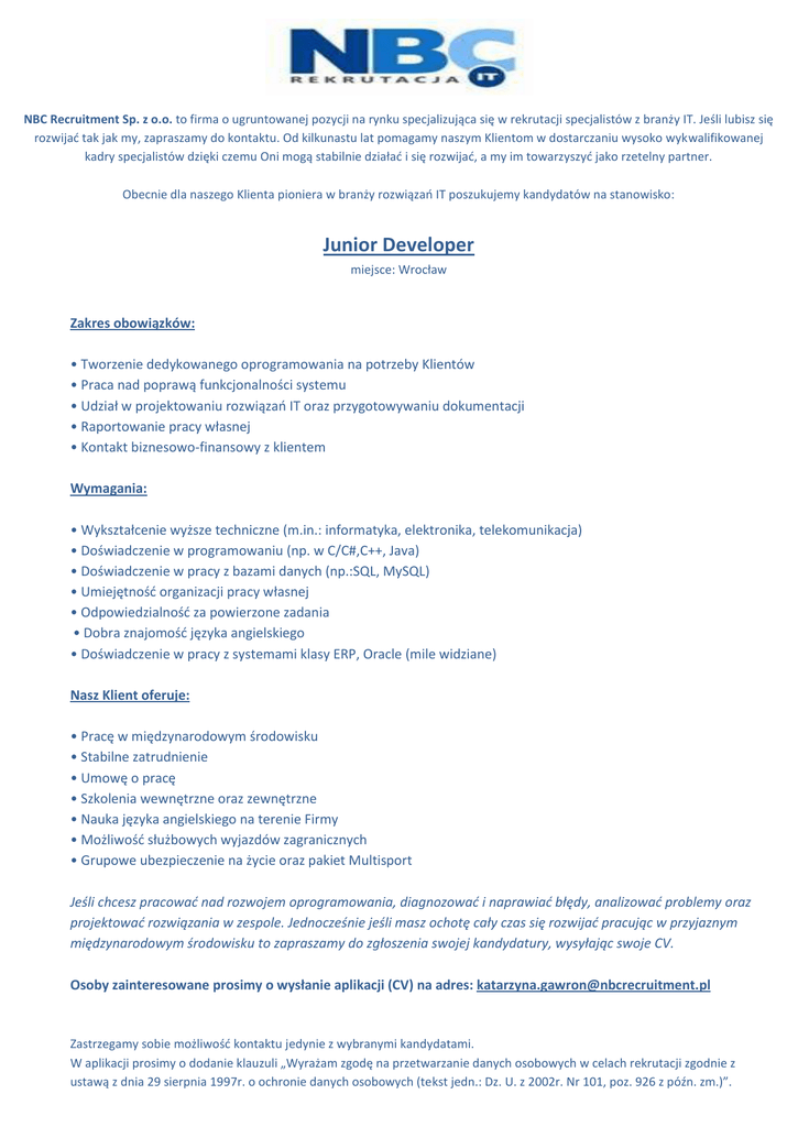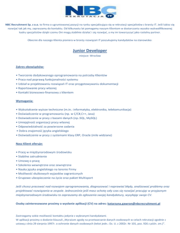 NBC Recruitment Sp. z o.o. to firma o ugruntowanej pozycji na rynku specjalizująca się w rekrutacji specjalistów z branży IT. Jeśli lubisz się rozwijać tak jak my, zapraszamy do kontaktu. Od kilkunastu lat pomagamy naszym Klientom w dostarczaniu wysoko wykwalifikowanej kadry specjalistów dzięki czemu Oni mogą stabilnie działać i się rozwijać, a my im towarzyszyć jako rzetelny partner. Obecnie dla naszego Klienta pioniera w branży rozwiązań IT poszukujemy kandydatów na stanowisko: Junior Developer miejsce: Wrocław Zakres obowiązków: • Tworzenie dedykowanego oprogramowania na potrzeby Klientów • Praca nad poprawą funkcjonalności systemu • Udział w projektowaniu rozwiązań IT oraz przygotowywaniu dokumentacji • Raportowanie pracy własnej • Kontakt biznesowo-finansowy z klientem Wymagania: • Wykształcenie wyższe techniczne (m.in.: informatyka, elektronika, telekomunikacja) • Doświadczenie w programowaniu (np. w C/C#,C++, Java) • Doświadczenie w pracy z bazami danych (np.:SQL, MySQL) • Umiejętność organizacji pracy własnej • Odpowiedzialność za powierzone zadania • Dobra znajomość języka angielskiego • Doświadczenie w pracy z systemami klasy ERP, Oracle (mile widziane) Nasz Klient oferuje: • Pracę w międzynarodowym środowisku • Stabilne zatrudnienie • Umowę o pracę • Szkolenia wewnętrzne oraz zewnętrzne • Nauka języka angielskiego na terenie Firmy • Możliwość służbowych wyjazdów zagranicznych • Grupowe ubezpieczenie na życie oraz pakiet Multisport Jeśli chcesz pracować nad rozwojem oprogramowania, diagnozować i naprawiać błędy, analizować problemy oraz projektować rozwiązania w zespole. Jednocześnie jeśli masz ochotę cały czas się rozwijać pracując w przyjaznym międzynarodowym środowisku to zapraszamy do zgłoszenia swojej kandydatury, wysyłając swoje CV. Osoby zainteresowane prosimy o wysłanie aplikacji (CV) na adres: [email protected] Zastrzegamy sobie możliwość kontaktu jedynie z wybranymi kandydatami. W aplikacji prosimy o dodanie klauzuli „Wyrażam zgodę na przetwarzanie danych osobowych w celach rekrutacji zgodnie z ustawą z dnia 29 sierpnia 1997r. o ochronie danych osobowych (tekst jedn.: Dz. U. z 2002r. Nr 101, poz. 926 z późn. zm.)”.