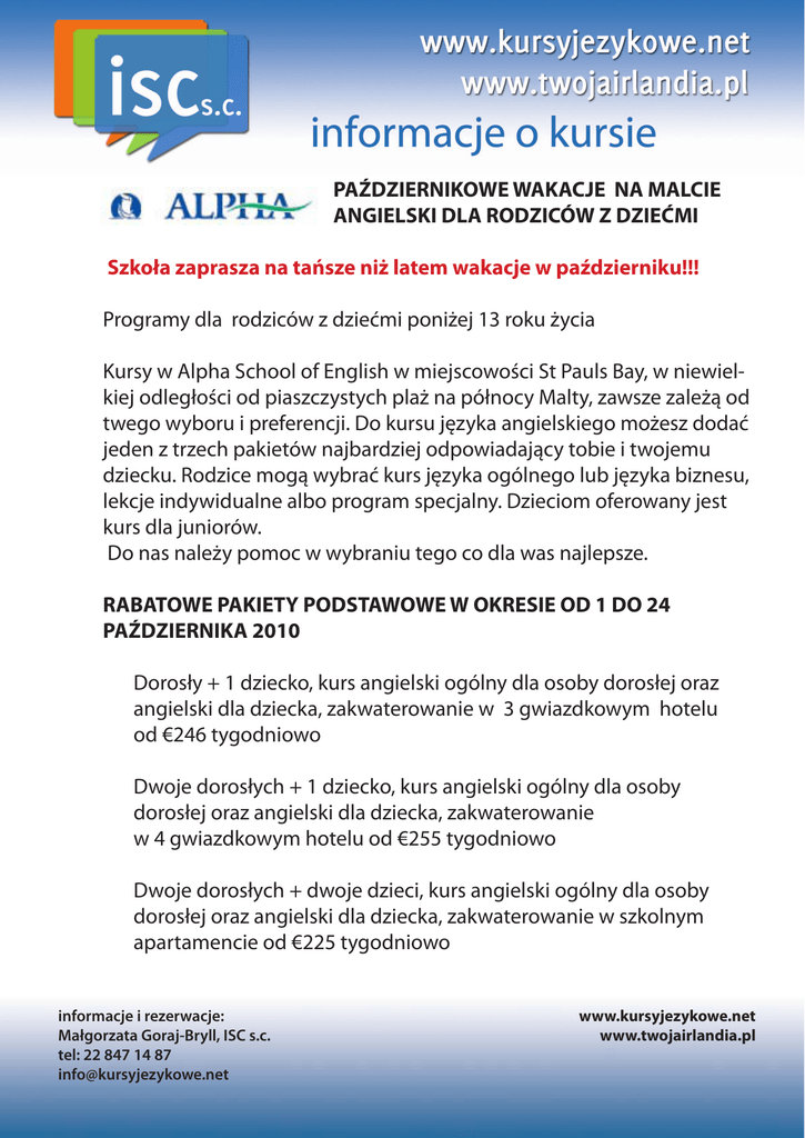 PAŹDZIERNIKOWE WAKACJE NA MALCIE ANGIELSKI DLA RODZICÓW Z DZIEĆMI Szkoła zaprasza na tańsze niż latem wakacje w październiku!!! Programy dla rodziców z dziećmi poniżej 13 roku życia Kursy w Alpha School of English w miejscowości St Pauls Bay, w niewielkiej odległości od piaszczystych plaż na północy Malty, zawsze zależą od twego wyboru i preferencji. Do kursu języka angielskiego możesz dodać jeden z trzech pakietów najbardziej odpowiadający tobie i twojemu dziecku. Rodzice mogą wybrać kurs języka ogólnego lub języka biznesu, lekcje indywidualne albo program specjalny. Dzieciom oferowany jest kurs dla juniorów. Do nas należy pomoc w wybraniu tego co dla was najlepsze. RABATOWE PAKIETY PODSTAWOWE W OKRESIE OD 1 DO 24 PAŹDZIERNIKA 2010 Dorosły + 1 dziecko, kurs angielski ogólny dla osoby dorosłej oraz angielski dla dziecka, zakwaterowanie w 3 gwiazdkowym hotelu od €246 tygodniowo Dwoje dorosłych + 1 dziecko, kurs angielski ogólny dla osoby dorosłej oraz angielski dla dziecka, zakwaterowanie w 4 gwiazdkowym hotelu od €255 tygodniowo Dwoje dorosłych + dwoje dzieci, kurs angielski ogólny dla osoby dorosłej oraz angielski dla dziecka, zakwaterowanie w szkolnym apartamencie od €225 tygodniowo informacje i rezerwacje: Małgorzata Goraj-Bryll, ISC s.c. tel: 22 847 14 87 [email protected] www.kursyjezykowe.net www.twojairlandia.pl Prócz kursu angielskiego proponowane są dodatkowo odpłatne pakiety rodzinne. RODZINNY PAKIET • całodzienna wycieczka statkiem do Comino • całodzienna lub półdniowa wycieczka i zabawa w Parku Wodnym • całodzienna wyprawa motorówką do Comino • całodzienna wycieczka i zwiedzanie Gozo • półdniowa wycieczka plażą do Mellieha, Golden Bay, Ghajn Tuffieha lub Paradise Bay • Valletta - półdniowa wycieczka i zwiedzanie • Mdina - półdniowa wycieczka i zwiedzanie • półdniowa wycieczka i zwiedzanie świątyń Hagar Qim & Mnajdra • półdniowa wycieczka po zachodniej Malcie • wieczorne świętowanie wraz z maltańczykami, uczta i fajerwerki jeśli przypadnie tradycyjne święto. RODZINNY PAKIET PRZYGODOWY • całodzienna wycieczka luksusowym statkiem do Gozo, Comino & the Blue Lagoon • całodzienne Safari “Jeepem wokół Malty” • całodzienna lub półdniowa wycieczka do Parku Wodnego • Pół dnia sportu wspinaczka lub nurkowanie • Rodzinna, półdniowa wyprawa kajakiem • Półdniowe Safari podwodne • 2 godziny jazdy konnej w malowniczym krajobrazie wyspy informacje i rezerwacje: Małgorzata Goraj-Bryll, ISC s.c. tel: 22 847 14 87 [email protected] www.kursyjezykowe.net www.twojairlandia.pl RODZINNY PAKIET JUNIORA • całodzienna lub półdniowa zabawa w Parku Wodnym • Całodzienna wycieczka statkiem do Comino • wycieczka na plan filmowy “Popeye Village” • Półdniowe Safari podwodne • 2 godziny jazdy konnej w malowniczym krajobrazie wyspy • półdniowe odwiedziny w centrum Malta Falconry Centre • półdniowa wycieczka plażą do Mellieha, Golden Bay lub Paradise Bay • półdniowy pobyt w parku Mediterraneo Marine Park • półdniowy pobyt Parku Playmobil Park informacje i rezerwacje: Małgorzata Goraj-Bryll, ISC s.c. tel: 22 847 14 87 [email protected] www.kursyjezykowe.net www.twojairlandia.pl
