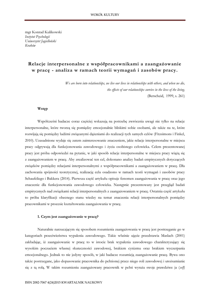 WOKÓŁ KULTURY mgr Konrad Kulikowski Instytut Psychologii Uniwersytet Jagielloński Kraków Relacje interpersonalne z współpracownikami a zaangażowanie w pracę - analiza w ramach teorii wymagań i zasobów pracy. We are born into relationships, we live our lives in relationships with others, and when we die, the effects of our relationships survive in the lives of the living. (Berscheid, 1999, s. 261) Wstęp Współcześni badacze coraz częściej wskazują na potrzebę zwrócenia uwagi nie tylko na relacje interpersonalne, które tworzą się pomiędzy emocjonalnie bliskimi sobie osobami, ale także na te, które rozwijają się pomiędzy ludźmi związanymi dążeniami do realizacji tych samych celów (Fitzsimons i Finkel, 2010). Uzasadnione wydaje się zatem zainteresowanie znaczeniem, jakie relacje interpersonalne w miejscu pracy odgrywają dla funkcjonowania zawodowego i życia osobistego człowieka. Celem prezentowanej pracy jest próba odpowiedzi na pytanie, w jaki sposób relacje interpersonalne w miejscu pracy wiążą się z zaangażowaniem w pracę. Aby zrealizować ten cel, dokonano analizy badań empirycznych dotyczących związków pomiędzy relacjami interpersonalnymi z współpracownikami a zaangażowaniem w pracę. Dla zachowania spójności teoretycznej, realizację celu osadzono w ramach teorii wymagań i zasobów pracy Schaufeliego i Bakkera (2014). Pierwsza część artykułu opisuje fenomen zaangażowania w pracę oraz jego znaczenie dla funkcjonowania zawodowego człowieka. Następnie prezentowany jest przegląd badań empirycznych nad związkami relacji interpersonalnych z zaangażowaniem w pracę. Ostatnia część artykułu to próba klaryfikacji obecnego stanu wiedzy na temat znaczenia relacji interpersonalnych pomiędzy pracownikami w procesie kształtowania zaangażowania w pracę. 1. Czym jest zaangażowanie w pracę? Naturalnie narzucającym się sposobem rozumienia zaangażowania w pracę jest postrzeganie go w kategoriach przeciwieństwa wypalenia zawodowego. Takie właśnie ujęcie przedstawia Maslach (2001) zakładając, iż zaangażowanie w pracę to w istocie brak wypalenia zawodowego charakteryzujący się wysokim poczuciem własnej skuteczności zawodowej, brakiem cynizmu oraz brakiem wyczerpania emocjonalnego. Jednak to nie jedyny sposób, w jaki badacze rozumieją zaangażowanie pracę. Bywa ono także postrzegane, jako dopasowanie pracownika do pełnionej przez niego roli zawodowej i utożsamianie się z tą rolą. W takim rozumieniu zaangażowany pracownik w pełni wyraża swoje prawdziwe ja (self) ISSN 2082-7067 4(24)2015 KWARTALNIK NAUKOWY WOKÓŁ KULTURY w pracy i poprzez pracę (Kahn, 1990) oraz inwestuje swoje poznawcze, emocjonalne i fizyczne zasoby w pełnioną przez siebie rolę zawodową (Rich i in., 2010). Zdaniem Rothbard (2001) zaangażowany pracownik charakteryzuje się dwiema właściwościami: jest zaabsorbowany pełnioną rolą zawodową i poświęca swojej pracy wiele uwagi. Zaangażowanie w pracę bywa utożsamiane (Britt i in., 2005) z poczuciem odpowiedzialności za wykonywaną pracę, przeświadczeniem, że sposób wykonania pracy i jej jakość jest ważna. Soane i in. (2012) za jeden z wymiarów zaangażowania w pracę uznają zaangażowanie społeczne (social engagement) rozumiane jako stopień, w jakim pracownik jest powiązany relacjami społecznymi ze swoim środowiskiem pracy oraz wartościami wyznawanymi wraz ze swoimi współpracownikami. Próbując znaleźć wspólny mianownik tak wielu sposobów rozumienia zaangażowania w pracę Shuck i in. (2012) zauważają, że większość badaczy postrzega zaangażowanie, jako pewien rodzaj poznawczej, behawioralnej i emocjonalnej energii ukierunkowanej na osiąganie pozytywnych efektów pracy. Na potrzeby prowadzonych w prezentowanym artykule analiz, zaangażowanie w pracę rozumiane będzie zgodnie z koncepcją zaangażowania w pracę Schaufeliego i współpracowników (2006) - najczęściej stosowanym obecnie w badaniach naukowych sposobem ujmowania zaangażowania (Saks, Gruman, 2014). Zaangażowanie określa się tu jako raczej odrębny od wypalenia, niż będący jego przeciwieństwem, pozytywny stan umysłu charakteryzowany przez wigor – energię do pracy i wytrwałość wobec przeciwności, oddanie się pracy – przekonanie o znaczeniu i sensowności wykonywanej pracy i zaabsorbowanie pracą – głęboka koncentracja podczas pracy i trudność z oderwaniem się od niej (Schaufeli i in., 2006; Schaufeli i Bakker, 2010). Takie ujmowanie zaangażowania zyskuje akceptację badaczy, gdyż nie tylko opisuje, czym jest zaangażowanie, ale także umiejscawia je w kontekście teoretycznym w ramach teorii wymagań i zasobów pracy (Bakker i Demerouti, 2014). Przyczyn zaangażowania upatruje się tutaj we wzajemnym oddziaływaniu zasobów, jakie praca daje (np. wsparcie współpracowników) i wymagań, jakie stawia (np. wysokie tempo pracy) (Schaufeli i in., 2009). 2. Czy warto skupiać się na zaangażowaniu w pracę? Zaangażowanie w pracę jest popularnym przedmiotem badań, gdyż wiąże się zarówno z dobrostanem pracowników, jak i z efektywnością ich pracy. Praca zaangażowanych jest lepiej oceniana przez przełożonych, zaangażowani częściej podejmują zadania, które wykraczają poza ich obowiązki oraz przejawiają mniej zachowań szkodliwych dla przedsiębiorstwa (Shantz, i in., 2013). Pracowników zaangażowanych cechuje niższa chęć rezygnacji z pracy (Yalabik i in., 2013) oraz mniejsza liczba absencji (Merrill i in., 2013). Zaangażowanie w pracę wiąże się z lepszym zdrowiem psychicznym i fizycznym (Leijten i in., 2014) oraz wyższym poziomem wykonania pracy (Halbesleben i Wheeler, 2008; Bakker i Bal, 2010; Christian i in., 2011; Shimazu i in., 2012, Shimazu, i in., 2015). Zaangażowanie w pracę oddziałuje nie tylko na sferę pracy zawodowej, ale na całość życia pracowników, zaangażowani cechują się bowiem wyższą satysfakcją z życ
