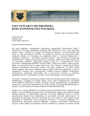 LIST OTWARTY DO PREMIERA RZECZYPOSPOLITEJ POLSKIEJ Kraków, dnia 29 kwietnia 2008 r. Szanowny Pan Donald Tusk Prezes Rady Ministrów Szanowny Panie Premierze, My niżej podpisani, zaniepokojeni niespójnymi propozycjami Ministerstwa Nauki i Szkolnictwa Wyższego, pragniemy przekazać Panu Premierowi nasze uwagi dotyczące reformy nauki i szkolnictwa wyższego. Podzielając przekonanie, że wysoki poziom tych ściśle ze sobą powiązanych dziedzin ma zasadnicze znaczenie dla przyszłości kraju, uznajemy również, że wymagają one głębokich zmian w systemie finansowania i organizacji. Popieramy - jako dobry początek reformy - plan utworzenia Narodowego Centrum Nauki - organizacji autonomicznej, powołanej do finansowania badań naukowych na światowym poziomie. Jednocześnie jednak, szereg tez i proponowanych zmian, zawartych w dokumentach MNiSW z kwietnia 2008 r., budzi nasze obawy i rodzi sprzeciw. Błędy w rozpoznaniu przyczyn złego stanu rzeczy, jak i niektóre z zamierzonych działań zagrażają powodzeniu rzeczywistej reformy. Nie ulega wątpliwości, że istotny postęp można osiągnąć tylko przez radykalną poprawę jakości kadr oraz organizacji w nauce i szkolnictwie wyższym, przy równoczesnym szybkim wzroście nakładów finansowych. Paradoksalnie, propozycje ministerialne idą w przeciwnym kierunku, tj. obniżenia standardów jakości w szkolnictwie wyższym i niewystarczającego wzrostu nakładów. Uważamy, że podstawową przyczyną słabości kadr jest nieatrakcyjność kariery naukowej i akademickiej, wyrażająca się między innymi przez niskie wynagrodzenia, szczególnie wśród młodych naukowców. Pomimo obecnego wzrostu gospodarczego, wynagrodzenia naukowców i nauczycieli akademickich nie uległy zmianie i pozostają niekonkurencyjne w Europie. Ten stan również jest odpowiedzialny za brak mobilności kadr. Pogląd, że to wymóg habilitacji jest istotną przyczyną powolnych karier naukowych, jest błędny. Nie ma przeszkód merytorycznych w uzyskaniu tego stopnia, gdy kandydat posiada dorobek naukowy na odpowiednim poziomie. W istocie habilitacja stanowi w Polsce najważniejszy element oceny kandydatów do przyszłych stanowisk profesorskich i to niezależnie od dyscypliny naukowej, podobnie jak to ma miejsce w wielu krajach Europy Zachodniej (w Niemczech, Austrii, Szwajcarii, Włoszech i we Francji). Zgadzając się z koniecznością uproszczenia procesu habilitacji, wyrażamy jednocześnie zdecydowany sprzeciw wobec planów jej likwidacji. Równie szkodliwe są pomysły stworzenia dwóch typów doktoratów: naukowego i zawodowego, oraz wprowadzenia możliwości otwierania przewodów doktorskich po licencjacie. O ile usuwanie przeszkód administracyjnych i proceduralnych w karierze akademickiej jest słuszne, nie może być ono mylone z obniżaniem wymagań merytorycznych. Uważamy, że należy stworzyć system finansowania premiujący najlepsze jednostki naukowe i szkoły wyższe. Za szkodliwy uważamy zamiar finansowania prywatnych szkół wyższych ze skromnych obecnie środków publicznych. W rzeczywistości niezbędny jest proces odwrotny: działania ustawodawcze umożliwiające znacznie większe zaangażowanie sektora prywatnego w finansowanie szkolnictwa wyższego i badań naukowych. Zaliczenie do zjawisk pozytywnych kilkukrotnego wzrostu liczby studiujących w Polsce (przy nieznacznie tylko zmienionym poziomie finansowania) oraz dwunastokrotnego wzrostu liczby nadawanych doktoratów, jako wielkich osiągnięć i szans na przyszłość, jest kolejnym błędem. Stało się tak prawie wyłącznie dzięki drastycznemu obniżeniu wymagań merytorycznych stawianych studentom i doktorantom oraz inflacji jakości kadr w niektórych szkołach wyższych. Zjawiskom tym towarzyszy groźna patologia, tzw. „wieloetatowość”. W krajach przodujących gospodarczo, sukcesy w badaniach podstawowych doprowadziły do ogromnego postępu w naukach stosowanych i innowacyjnej gospodarce. Dokumenty MNiSW nie uwzględniają oczywistego związku między jakością uprawianej nauki i szkolnictwa wyższego, a poziomem edukacji ponadpodstawowej. Planowana znaczna poprawa jakości kadr w instytucjach badawczych i w przemyśle wysokich technologii stoi w jawnej sprzeczności z coraz gorszym nauczaniem matematyki oraz praktyczną eliminacją nauczania przedmiotów ścisłych i przyrodniczych w polskich szkołach. Drastyczne ograniczenie programów szkolnych w tym zakresie przekreśla możliwość rozwoju talentów już na bardzo wczesnym etapie kształcenia. Wyrażamy nadzieję, że obecny rząd nie powtórzy błędów z przeszłości, kiedy to nauce i szkolnictwu wyższemu narzucano szkodliwe rozwiązania, wbrew interesom społeczeństwa. Uznając, że prawidłowy rozwój edukacji i nauki jest warunkiem koniecznym do tego, by Polska zajęła należne jej miejsce w Europie i na świecie, oczekujemy przeprowadzenia rzetelnej i opartej o konkrety dyskusji na temat planowanych reform. Podjęcie takiej dyskusji uważamy za swój obowiązek i jesteśmy do niej przygotowani. Ze względu na wagę poruszanych spraw, list ten przekazujemy również do wiadomości publicznej. Łączymy wyrazy szacunku Lista podpisów Głosy poparcia zbiorowego Uwaga Dziękując wszystkim, którzy spontanicznie i masowo udzielili swojego poparcia informujemy, że dnia 12 maja 2008 r. list otwarty został wysłany pocztą do Premiera, a kopię wręczono Min. B. Kudryckiej w czasie jej pobytu w Krakowie. Poza tym, list wysłano do następujących adresatów: 1. Prezydent Rzeczypospolitej Polskiej 2. Marszałek Sejmu Rzeczypospolitej Polskiej 3. Marszałek Senatu Rzeczypospolitej Polskiej 4. Konferencja Rektorów Akademickich Szkół Polskich 5. Centralna Komisja ds. Stopni i Tytułów 6. Redakcja "Rzeczpospolitej" 7. Redakcja "Gazety Wyborczej" 8. Redakcja "Dziennika" 9. Redakcja "Dziennika Polskiego" 10. Redakcja programu "Wiadomości" Telewizji Polskiej 11. Redakcja programu "Fakty" telewizji TV