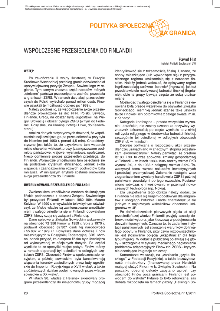 Wszelkie prawa zastrzeżone. Każda reprodukcja lub adaptacja całości bądx cześci niniejszej publikacji, niezależnie od zastosowanej techniki reprodukcji (drukarskiej, fotograficznej, komputerowej i in. ), wymaga pisemnej zgody Wydawcy WSPÓŁCZESNE PRZESIEDLENIA DO FINLANDII Paweł Hut Instytut Polityki Społecznej UW WSTĘP Po zakończeniu II wojny światowej w Europie Środkowo-Wschodniej przebieg granic odzwierciedlał uprzywilejowaną pozycję Związku Sowieckiego w regionie. Tym samym znaczna część narodów, których „etniczne” państwa przesunięto na zachód, pozostała w granicach ZSRS. W ramach dwu akcji przesiedleńczych do Polski wyjechało ponad milion osób. Finowie uzyskali tę możliwość dopiero po 1989 r. Należy podkreślić, że współcześnie akcje przesiedleńcze prowadzone są do: RFN, Polski, Szwecji, Finlandii, Grecji, na obszar byłej Jugosławii, na Węgry, Słowację i obszar byłego ZSRS (w tym do Federacji Rosyjskiej, na Ukrainę, Łotwę i Litwę, do Kazachstanu)1. Analiza danych statystycznych dowodzi, że współcześnie najliczniejsza grupa przesiedleńców przybyła do Niemiec (od 1950 r. ponad 4,5 mln). Charakterystyczne jest także to, że uzyskiwane tam wsparcie miało charakter wielosektorowy (zaangażowane podmioty państwowe, krajowe, wyznaniowe, społeczne). Nieco odmiennie proces przesiedleń przebiegał do Finlandii. Wprawdzie umożliwiono tam osiedlanie się na podstawie kryterium etnicznego, jednak skala wsparcia i zaangażowania różnych podmiotów bała mniejsza. W niniejszym artykule zostanie omówiona akcja przesiedleńcza do Finlandii. UWARUNKOWANIA PRZESIEDLEŃ DO FINLANDII Zwolennikiem umożliwienia osobom deklarującym fińskie pochodzenie z obszaru Związku Sowieckiego był prezydent Finlandii w latach 1982–1994 Mauno Koivisto. W 1990 r. w wywiadzie telewizyjnym oświadczył, że fińskie władze są zainteresowane umożliwieniem trwałego osiedlenia się w Finlandii obywatelom ZSRS, którzy czują się związani z Finlandią. Dane spisowe w Związku Sowieckim wskazywały na obecność 72 356 Finów w 1959 r. Spis z 1970 r. podawał obecność 62 307 osób tej narodowości i 55 687 w 1979 r.2. Powyższe dane dotyczą Finów mieszkających w Rosyjskiej Federacyjnej SRS. Można jednak przyjąć, że diaspora fińska była liczniejsza od wykazywanej w oficjalnych danych. Po części wynikało to ze specyfiki miejsc pobytu Finów, którzy w ramach deportacji byli osiedlani w odległych częściach ZSRS. Obecność Finów w społeczeństwie rosyjskim, a później sowieckim, była konsekwencją włączenia terenów zasiedlonych przez ludy ugrofińskie do Imperium Rosyjskiego w XVIII wieku3, a także z późniejszych działań podejmowanych przez władze sowieckie w XX wieku4. W latach 90. władze z Helsinek skierowały program przesiedleńczy do niejednolitej grupy mogącej 28 identyfikować się z tożsamością fińską. Uznano, że osoby mieszkające (lub wywodzące się) z przygranicznego regionu utożsamiają się z narodem fińskim. Należy jednak wskazać, że opisywany region Ingrii zasiedlają zarówno Iżorowie5 (Ingrowie), jak też przedstawiciele napływowej ludności fińskiej (Ingrianie); obie te grupy bywają często ze sobą utożsamiane. Możliwość trwałego osiedlenia się w Finlandii skierowana była przede wszystkim do obywateli Związku Sowieckiego, niemniej jednak szansę taką uzyskali także Finowie i ich potomkowie z całego świata, m.in. z Kanady6. Kategorie konfesyjne – przede wszystkim wyznanie luterańskie, nie zostały uznane za oczywisty wyznacznik tożsamości; po części wynikało to z nikłej roli życia religijnego w środowisku ludności fińskiej, szczególnie tej osiedlonej w odległych obwodach ZSRS lub w miastach. Decyzję polityczną o rozpoczęciu akcji przesiedleńczej uzasadniano w znacznym stopniu przesłankami ekonomicznymi7. Należy pamiętać, że przełom lat 80. i 90. to czas epokowej zmiany gospodarczej w Finlandii – w latach 1980–1985 roczny wzrost PKB wynosił 3%, a do 1988 r. osiągnął rozmiar 3,9%. Towarzyszył temu wzrost nakładów inwestycyjnych i produkcji przemysłowej. Załamanie nastąpiło wraz z ograniczeniem wymiany handlowej z ZSRS i później państwami powstałymi po jego rozpadzie. Postanowiono wówczas o inwestowaniu w przemysł nowoczesnych technologii (np. Nokia). Dla uzupełnienia tego obrazu należy dodać, że Finlandia nie stała się krajem docelowym dla imigrantów z ubogiego Południa i nadal charakteryzuje się jednym z najniższych wskaźników obecności imigrantów w UE. Po doświadczeniach pierwszych pięciu lat akcji przesiedleńczej władze Finlandii przyjęły zasadę dobrowolności wyboru, jako kluczową w podejmowaniu decyzji migracyjnych. Oznacza to, że zadaniem instytucji państwowych jest stworzenie warunków do trwałego pobytu w Finlandii, przy czym rozpowszechnione jest stosowanie pojęcia „ekspatriacja” dla tego typu migracji. W debacie publicznej pojawiają się głosy – szczególnie w sytuacji medialnego nagłaśniania problemów adaptacyjnych Finów z b. ZSRS – krytycznie oceniające imigrację etniczną8. Komentarze wskazują na „zanikanie języka fińskiego” w Federacji Rosyjskiej, a także bezużyteczność infrastruktury (finansowanej przez Helsinki) mającej służyć Finom w b. Związku Sowieckim. Na początku obecnej dekady zapytano wprost: czy obecność Finów poza granicami Finlandii jest powodem do wstydu? Pytanie to było retoryczne, zaś debata rozpoczęta na łamach gazety „Helsingin SoPolityka Społeczna nr 1/2011 nomat” dowodziła zasadności pozostawienia potencjalnych imigrantów w ich krajach pochodzenia. Głosy te nie są marginesem dyskusji. Można też wskazać, że początkowe zaangażowanie osób wywodzących się z Ingrii w organizowanie akcji przesiedleńczej znacznie zmalało – po części jest to efekt negatywnego stereotypu dotyczącego imigracji Finów z Federacji R