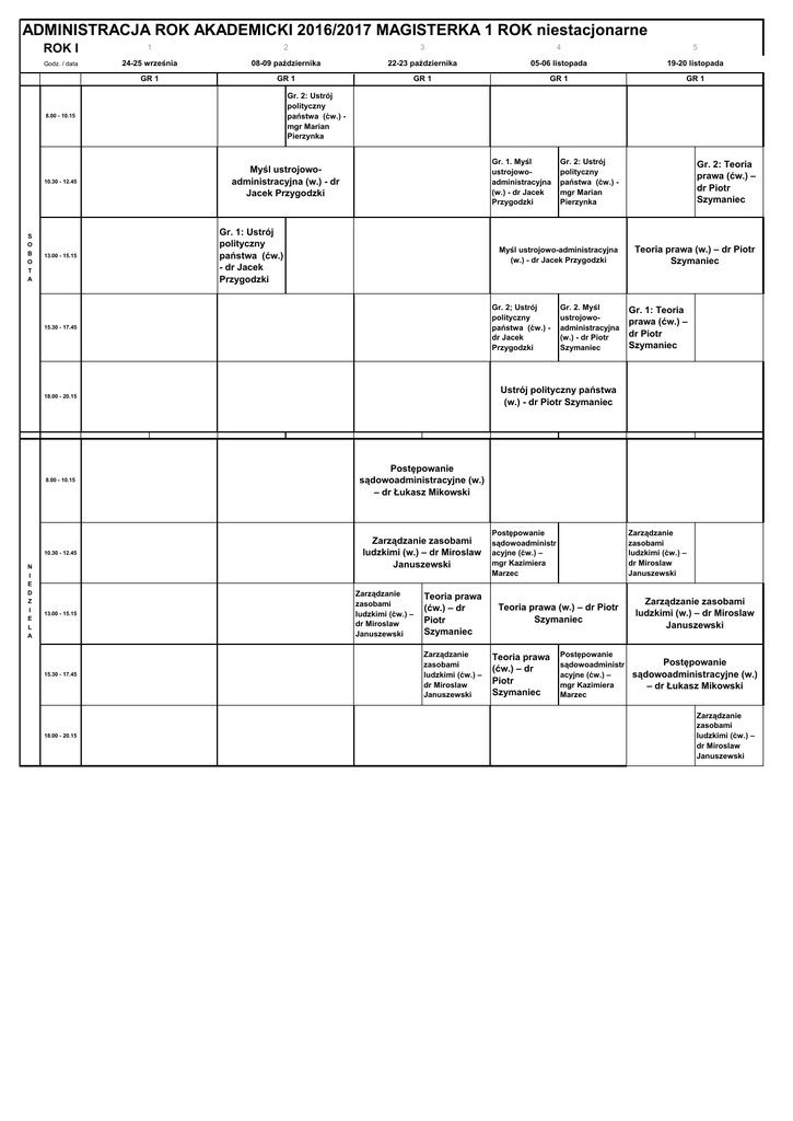 ADMINISTRACJA ROK AKADEMICKI 2016/2017 MAGISTERKA 1 ROK niestacjonarne ROK I 1 2 3 4 5 Godz. / data 24-25 września 08-09 października 22-23 października 05-06 listopada 19-20 listopada GR 1 GR 1 GR 1 GR 1 GR 1 Gr. 2: Ustrój polityczny państwa (ćw.) mgr Marian Pierzynka 8.00 - 10.15 10.30 - 12.45 S O B O T A 13.00 - 15.15 Gr. 1. Myśl ustrojowoadministracyjna (w.) - dr Jacek Przygodzki Myśl ustrojowoadministracyjna (w.) - dr Jacek Przygodzki Gr. 1: Ustrój polityczny państwa (ćw.) - dr Jacek Przygodzki 8.00 - 10.15 Postępowanie sądowoadministracyjne (w.) – dr Łukasz Mikowski 10.30 - 12.45 Zarządzanie zasobami ludzkimi (w.) – dr Miroslaw Januszewski 15.30 - 17.45 18.00 - 20.15 Myśl ustrojowo-administracyjna (w.) - dr Jacek Przygodzki Teoria prawa (w.) – dr Piotr Szymaniec Gr. 2. Myśl ustrojowoadministracyjna (w.) - dr Piotr Szymaniec Gr. 1: Teoria prawa (ćw.) – dr Piotr Szymaniec Ustrój polityczny państwa (w.) - dr Piotr Szymaniec 18.00 - 20.15 13.00 - 15.15 Gr. 2: Teoria prawa (ćw.) – dr Piotr Szymaniec Gr. 2; Ustrój polityczny państwa (ćw.) dr Jacek Przygodzki 15.30 - 17.45 N I E D Z I E L A Gr. 2: Ustrój polityczny państwa (ćw.) mgr Marian Pierzynka Zarządzanie zasobami ludzkimi (ćw.) – dr Miroslaw Januszewski Teoria prawa (ćw.) – dr Piotr Szymaniec Zarządzanie zasobami ludzkimi (ćw.) – dr Miroslaw Januszewski Postępowanie sądowoadministr acyjne (ćw.) – mgr Kazimiera Marzec Zarządzanie zasobami ludzkimi (ćw.) – dr Miroslaw Januszewski Teoria prawa (w.) – dr Piotr Szymaniec Teoria prawa (ćw.) – dr Piotr Szymaniec Postępowanie sądowoadministr acyjne (ćw.) – mgr Kazimiera Marzec Zarządzanie zasobami ludzkimi (w.) – dr Miroslaw Januszewski Postępowanie sądowoadministracyjne (w.) – dr Łukasz Mikowski Zarządzanie zasobami ludzkimi (ćw.) – dr Miroslaw Januszewski ADMINISTRACJA ROK AKADEMICKI 2016/2017 MAGISTERKA 1 ROK niestacjonarne Rok I 6 7 8 9 10 Godz. / data 03-04 grudnia 17-18 grudnia 14-15 stycznia 21-22 stycznia 28-29 stycznia GR 1 GR 1 GR 1 GR 1 GR 1 8.00 - 10.15 10.30 - 12.45 S O B O T A Gr. 1: Postępowanie Gr. 2: Teoria sądowoadministr prawa (ćw.) – dr acyjne (ćw.) – Piotr Szymaniec mgr Kazimiera Marzec Postępowanie 13.00 - 15.15 Teoria prawa (w.) – dr Piotr Szymaniec Zarządzanie zasobami ludzkimi sądowoadministr Teoria prawa acyjne (ćw.) – (ćw.) – dr Piotr (w.) – dr Miroslaw Januszewski mgr Kazimiera Szymaniec Marzec Gr. 2: 15.30 - 17.45 Zarządzanie Gr. 1: Teoria Postępowanie zasobami prawa (ćw.) – sądowoadministr ludzkimi (ćw.) – acyjne (ćw.) – dr Piotr dr Miroslaw mgr Kazimiera Szymaniec Januszewski Marzec Postępowanie sądowoadministr acyjne (ćw.) – mgr Kazimiera Marzec 8.00 - 10.15 10.30 - 12.45 13.00 - 15.15 15.30 - 17.45 18.00 - 20.15 Gr. 2. Myśl ustrojowoadministracyjna (w.) - dr Piotr Szymaniec Teoria prawa (ćw.) – dr Piotr Szymaniec Ustrój polityczny państwa (w.) dr Piotr Szymaniec 18.00 - 20.15 N I E D Z I E L A Postępowanie sądowoadministr acyjne (ćw.) – mgr Kazimiera Marzec Zarządzanie zasobami ludzkimi (ćw.) – dr Miroslaw Januszewski Postępowanie sądowoadministracyjne (w.) – dr Łukasz Mikowski Postępowanie sądowoadministracyjne (w.) – dr Łukasz Mikowski Postępowanie sądowoadministr acyjne (ćw.) – mgr Kazimiera Marzec Postępowanie sądowoadministracyjne (w.) – dr Łukasz Mikowski Gr. 1: Myśl Gr. 2: Ustrój Postępowanie sądowoadministr acyjne (ćw.) – mgr Kazimiera Marzec polityczny Myśl ustrojowo-administracyjna ustrojowoadministracyjna państwa (ćw.) (w.) - dr Jacek Przygodzki (ćw.) - dr Jacek mgr Marian Myśl ustrojowoadministracyjna (ćw.) - dr Jacek Przygodzki Ustrój polityczny państwa (ćw.) dr Jacek Przygodzki Gr. 2: Ustrój polityczny państwa (ćw.) - mgr Marian Pierzynka Przygodzki Pierzynka Gr. 1: Ustrój polityczny państwa (ćw.) dr Jacek Przygodzki Teoria prawa (ćw.) – dr Piotr Szymaniec Teoria prawa (ćw.) – dr Piotr Szymaniec Postępowanie sądowoadministr acyjne (ćw.) – mgr Kazimiera Marzec Gr. 2. Myśl ustrojowoadministracyjna (w.) - dr Piotr Szymaniec Ustrój polityczny państwa (w.) - dr Piotr Szymaniec
