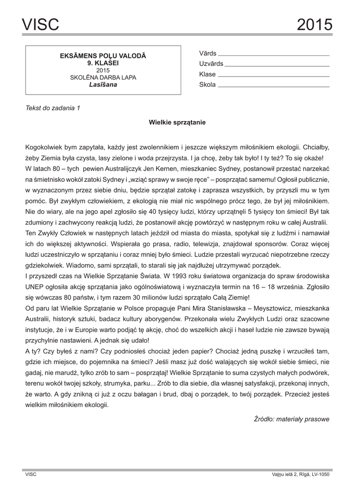 VISC 2015 Vārds EKSĀMENS POĻU VALODĀ 9. KLASEI Uzvārds 2015 SKOLĒNA DARBA LAPA Klase Lasīšana Skola Tekst do zadania 1 Wielkie sprzątanie Kogokolwiek bym zapytała, każdy jest zwolennikiem i jeszcze większym miłośnikiem ekologii. Chciałby, żeby Ziemia była czysta, lasy zielone i woda przejrzysta. I ja chcę, żeby tak było! I ty też? To się okaże! W latach 80 – tych pewien Australijczyk Jen Kernen, mieszkaniec Sydney, postanowił przestać narzekać na śmietnisko wokół zatoki Sydney i „wziąć sprawy w swoje ręce” – posprzątać samemu! Ogłosił publicznie, w wyznaczonym przez siebie dniu, będzie sprzątał zatokę i zaprasza wszystkich, by przyszli mu w tym pomóc. Był zwykłym człowiekiem, z ekologią nie miał nic wspólnego prócz tego, że był jej miłośnikiem. Nie do wiary, ale na jego apel zgłosiło się 40 tysięcy ludzi, którzy uprzątnęli 5 tysięcy ton śmieci! Był tak zdumiony i zachwycony reakcją ludzi, że postanowił akcję powtórzyć w następnym roku w całej Australii. Ten Zwykły Człowiek w następnych latach jeździł od miasta do miasta, spotykał się z ludźmi i namawiał ich do większej aktywności. Wspierała go prasa, radio, telewizja, znajdował sponsorów. Coraz więcej ludzi uczestniczyło w sprzątaniu i coraz mniej było śmieci. Ludzie przestali wyrzucać niepotrzebne rzeczy gdziekolwiek. Wiadomo, sami sprzątali, to starali się jak najdłużej utrzymywać porządek. I przyszedł czas na Wielkie Sprzątanie Świata. W 1993 roku światowa organizacja do spraw środowiska UNEP ogłosiła akcję sprzątania jako ogólnoświatową i wyznaczyła termin na 16 – 18 września. Zgłosiło się wówczas 80 państw, i tym razem 30 milionów ludzi sprzątało Całą Ziemię! Od paru lat Wielkie Sprzątanie w Polsce propaguje Pani Mira Stanisławska – Meysztowicz, mieszkanka Australii, historyk sztuki, badacz kultury aborygenów. Przekonała wielu Zwykłych Ludzi oraz szacowne instytucje, że i w Europie warto podjąć tę akcję, choć do wszelkich akcji i haseł ludzie nie zawsze bywają przychylnie nastawieni. A jednak się udało! A ty? Czy byłeś z nami? Czy podniosłeś chociaż jeden papier? Chociaż jedną puszkę i wrzuciłeś tam, gdzie ich miejsce, do pojemnika na śmieci? Jeśli masz już dość walających się wokół siebie śmieci, nie gadaj, nie marudź, tylko zrób to sam – posprzątaj! Wielkie Sprzątanie to suma czystych małych podwórek, terenu wokół twojej szkoły, strumyka, parku... Zrób to dla siebie, dla własnej satysfakcji, przekonaj innych, że warto. A gdy znikną ci już z oczu bałagan i brud, dbaj o porządek, to twój porządek. Przecież jesteś wielkim miłośnikiem ekologii. Źródło: materiały prasowe VISC Vaļņu ielā 2, Rīgā, LV-1050 Eksāmens poļu valodā 9. klasei Skolēna darba lapa Lasīšana 2015 2 Zadanie 1 (10 punktów) Proszę zaznaczyć „X” prawidłowe odpowiedzi według wzoru! P – prawda; F – fałsz 0. Trudno jest spotkać przeciwników ekologii. 1. Jen Kernen postanowił narzekać. P Aizpilda skolotājs: F 1.1.____ 2. Jen Kernen był ekologiem, który zaczął sprzątanie Ziemi. 1.2.____ 3. Prasa, radio i telewizja przeszkadzały Kernenowi w znajdowaniu sponsorów. 4. Ludzie, którzy sami brali udział w akcji, chętniej dbali o porządek. 5. 1.3.____ 1.4.____ Do akcji przystąpili przedstawiciele z ponad 80 krajów. 1.5.____ 6. Pani Mira Stanisławska-Meysztowicz mieszka w Austrii. 1.6.____ 7. Na apel Jena Kernena zgłosiło się 30 milionów ludzi. 1.7.____ 8. 9. Mieszkańcy Europy entuzjastycznie przyjmują wszelkie akcje i hasła. 1.8.____ Autor tekstu zwraca się do czytelników z apelem. 1.9.____ 10. Z małych czystych miejsc składa się czyste środowisko. 1.10.____ Kopā par 1. uzd.: _______ VISC Vaļņu ielā 2, Rīgā, LV-1050 Eksāmens poļu valodā 9. klasei Skolēna darba lapa Lasīšana 2015 3 Tekst do zadania 2 Reklamy prasowe A B Tak możesz lecieć do najpiękniejszych miejsc na świecie nawet za mniej niż pół ceny. ◊ Promocyjne bilety kupisz tylko w sobotę 15 stycznia w biurach British Airways. ◊ W ofercie 86 miast świata, wyloty 13 kwietnia. ◊ Zarezerwuj i wykup bilet tego samego dnia. ◊ Daleka podróż jest bliżej niż myślisz. ◊ Nie przegap okazji. BRITISH AIRWAYS Najbardziej lubiana linia lotnicza na świecie. W naszym banku wiemy, że każdy człowiek jest inny, każdy klient jest wyjątkowy, każda firma ma swój styl. Raiffeisen BANK C Telefon bezprzewodowy DECT Gigaset 3015 Comfort z wbudowaną automatyczną sekretarką, wyposażony w wolnostojącą słuchawkę z cyfrowym systemem głośnomówiącym. NARESZCIE MOŻESZ ROZMAWIAĆ I PRACOWAĆ JEDNOCZEŚNIE. Jest to możliwe dzięki wolnostojącej słuchawce gigaset 3000 z cyfrowym systemem głośnomówiącym. Mów... bez przeszkód. Bezpłatna infolinia 0 800 220 990. D Jeżeli teraz zarezerwujesz letnie wakacje, gwarantujemy: • Najniższe ceny • Bezpłatne wakacje dla dziecka • Najszerszy wybór hoteli Nic nie ryzykujesz. Rezerwację możesz zmienić do 40 dni przed wylotem. Szczegóły promocji w biurach SCAN HOLIDAY. VISC E Kapsułki BILOBIL poprawiają krążenie krwi w mózgu. Są zalecane w zaburzeniach pamięci, przy osłabionej zdolności koncentracji, zawrotach głowy, szumach w uszach, złym samopoczuciu i stanach lękowych. Vaļņu ielā 2, Rīgā, LV-1050 Eksāmens poļu valodā 9. klasei Skolēna darba lapa Lasīšana 2015 F JDJ www.jdj.com.pl • 4 G GWIAZDY W RADIU RMF FM Lady GaGa kursy językowe na całym świecie dla dzieci, młodzieży i dorosłych • praktyki w firmach za granicą • szkoła średnia i studia za granicą H I Specjalnie dla naszych klientów mamy Złe samopoczucie, objawy obniżonej wiosenną promocję na kursy językowe odporności górnych dróg oddechowych dla dzieci i młodzieży w wieku 13 -16 czy przeziębienie mogą pojawić się lat. niezależnie od pogody czy pory roku i ŁAP OKAZJĘ! Jeśli znajdziesz tak
