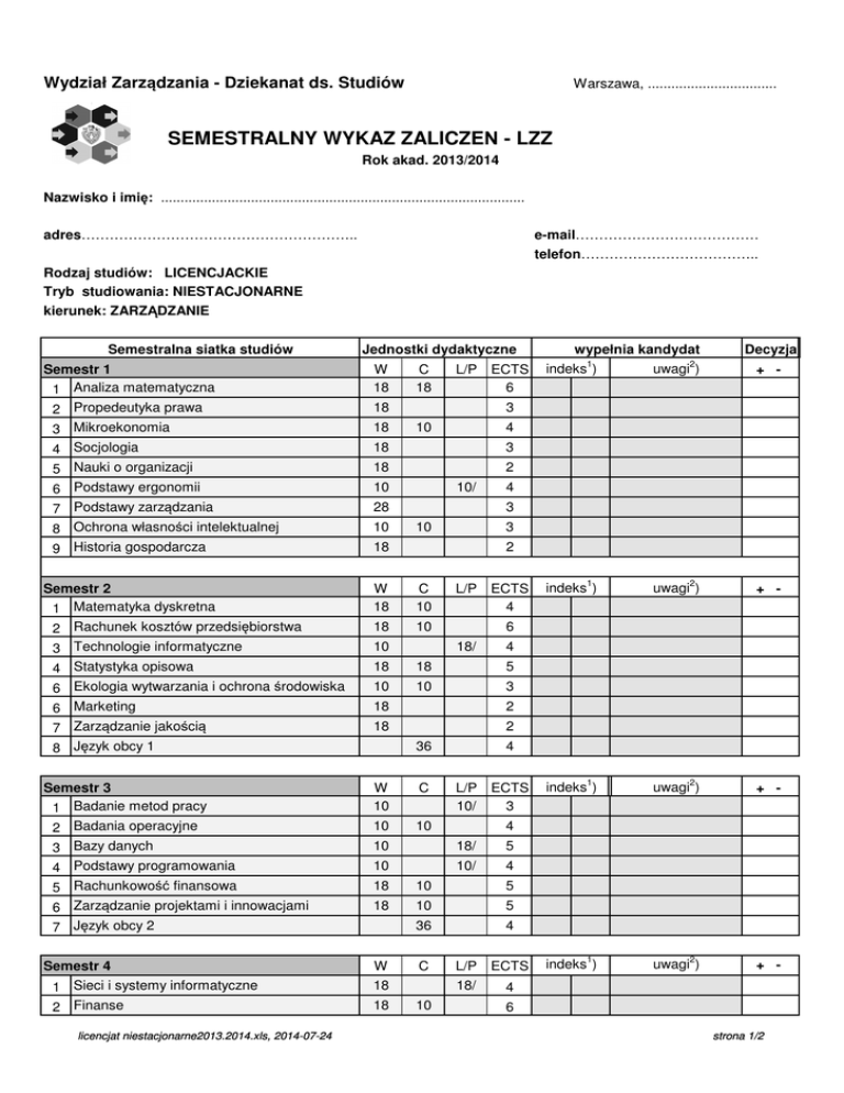 Wydział Zarządzania - Dziekanat ds. Studiów Warszawa, ................................. SEMESTRALNY WYKAZ ZALICZEŃ - LZZ Rok akad. 2013/2014 Nazwisko i imię: ............................................................................................. adres………………………………………………….. e-mail………………………………… telefon……………………………….. Rodzaj studiów: LICENCJACKIE Tryb studiowania: NIESTACJONARNE kierunek: ZARZĄDZANIE Semestralna siatka studiów Jednostki dydaktyczne Semestr 1 1 Analiza matematyczna W 18 2 Propedeutyka prawa 3 Mikroekonomia 18 18 4 Socjologia 5 Nauki o organizacji 18 3 18 2 6 Podstawy ergonomii 7 Podstawy zarządzania 10 8 Ochrona własności intelektualnej 9 Historia gospodarcza 10 Semestr 2 1 Matematyka dyskretna C 18 L/P ECTS 6 10 10/ 10 10 4 Statystyka opisowa 6 Ekologia wytwarzania i ochrona środowiska 18 18 5 10 10 3 6 Marketing 7 Zarządzanie jakością 18 2 18 2 10 L/P ECTS 4 uwagi2) + - indeks1) uwagi2) + - 6 18/ 36 4 4 Semestr 3 1 Badanie metod pracy W 10 C 2 Badania operacyjne 3 Bazy danych 10 10 10 18/ 5 4 Podstawy programowania 5 Rachunkowość finansowa 10 10/ 4 licencjat niestacjonarne2013.2014.xls, 2014-07-24 indeks1) 2 18 L/P ECTS 10/ 3 4 18 10 5 18 10 5 36 4 C 18 18 + - 3 2 Rachunek kosztów przedsiębiorstwa 3 Technologie informatyczne 1 Sieci i systemy informatyczne 2 Finanse uwagi2) 3 18 W indeks1) 4 C 10 Semestr 4 + - 4 W 18 6 Zarządzanie projektami i innowacjami 7 Język obcy 2 Decyzja uwagi2) 3 28 8 Język obcy 1 wypełnia kandydat indeks1) L/P ECTS 18/ 10 4 6 strona 1/2 3 Organizacja produkcji 4 Zachowania organizacyjne 5 Zarządzanie personelem 6 Bezpieczeństwo publiczne 18 0 24 2 36 W C 3 L/P ECTS 12 3 12 3 3 Przedmiot 3 z modułu 1Z9 4 Przedmiot 4 z modułu 1Z9 12 3 12 3 5 Przedmiot 5 z modułu 1Z9 6 Przedmiot p z modułu 1ZX 12 3 12 3 8 Praktyka zawodowa 9 Semin. dyplomowe 1 z modułu 1Z9 10 Praca dyplomwa cz.1 z modułu 1Z9 160 12 4 2 6 /60 W C L/P ECTS 1 Przedmiot 6 z modułu 1Z9 2 Przedmiot 7 z modułu 1Z9 12 3 12 3 3 Przedmiot 8 z modułu 1Z9 4 Przedmiot 9 z modułu 1Z9 12 3 12 3 5 Przedmiot X z modułu 1Z9 6 Przedmiot q z modułu 1ZX 7 Semin. dyplomowe 2 z modułu 1Z9 9 Praca dyplomwa cz.2 z modułu 1Z9 2 5 1 Przedmiot 1 z modułu 1Z9 2 Przedmiot 2 z modułu 1Z9 Semestr 6 1 3 18 7 Język obcy 3 Semestr 5 10/ 18 12 3 12 3 12 3 /90 indeks1) uwagi2) + - indeks1) uwagi2) + - 9 ) - w pierwszej kolumnie należy wpisać oceny z egzaminu, w drugiej oceny z zaliczeń ) - podać formę relizacji (wykład, ćwiczenia, laboratotium lub projekt) i liczbę godzin oraz semestr, na którym zaliczono dany przedmiot Data…………………………………… Podpis ……………………………. licencjat niestacjonarne2013.2014.xls, 2014-07-24 strona 2/2