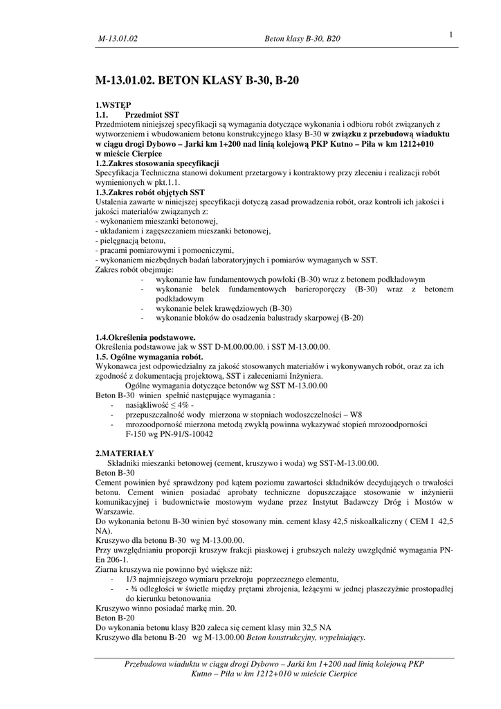 M-13.01.02 Beton klasy B-30, B20 1 M-13.01.02. BETON KLASY B-30, B-20 1.WSTĘP 1.1. Przedmiot SST Przedmiotem niniejszej specyfikacji są wymagania dotyczące wykonania i odbioru robót związanych z wytworzeniem i wbudowaniem betonu konstrukcyjnego klasy B-30 w związku z przebudową wiaduktu w ciągu drogi Dybowo – Jarki km 1+200 nad linią kolejową PKP Kutno – Piła w km 1212+010 w mieście Cierpice 1.2.Zakres stosowania specyfikacji Specyfikacja Techniczna stanowi dokument przetargowy i kontraktowy przy zleceniu i realizacji robót wymienionych w pkt.1.1. 1.3.Zakres robót objętych SST Ustalenia zawarte w niniejszej specyfikacji dotyczą zasad prowadzenia robót, oraz kontroli ich jakości i jakości materiałów związanych z: - wykonaniem mieszanki betonowej, - układaniem i zagęszczaniem mieszanki betonowej, - pielęgnacją betonu, - pracami pomiarowymi i pomocniczymi, - wykonaniem niezbędnych badań laboratoryjnych i pomiarów wymaganych w SST. Zakres robót obejmuje: - wykonanie ław fundamentowych powłoki (B-30) wraz z betonem podkładowym - wykonanie belek fundamentowych barieroporęczy (B-30) wraz z betonem podkładowym - wykonanie belek krawędziowych (B-30) - wykonanie bloków do osadzenia balustrady skarpowej (B-20) 1.4.Określenia podstawowe. Określenia podstawowe jak w SST D-M.00.00.00. i SST M-13.00.00. 1.5. Ogólne wymagania robót. Wykonawca jest odpowiedzialny za jakość stosowanych materiałów i wykonywanych robót, oraz za ich zgodność z dokumentacją projektową, SST i zaleceniami Inżyniera. Ogólne wymagania dotyczące betonów wg SST M-13.00.00 Beton B-30 winien spełnić następujące wymagania : - nasiąkliwość ≤ 4% - przepuszczalność wody mierzona w stopniach wodoszczelności – W8 - mrozoodporność mierzona metodą zwykłą powinna wykazywać stopień mrozoodporności F-150 wg PN-91/S-10042 2.MATERIAŁY Składniki mieszanki betonowej (cement, kruszywo i woda) wg SST-M-13.00.00. Beton B-30 Cement powinien być sprawdzony pod kątem poziomu zawartości składników decydujących o trwałości betonu. Cement winien posiadać aprobaty techniczne dopuszczające stosowanie w inżynierii komunikacyjnej i budownictwie mostowym wydane przez Instytut Badawczy Dróg i Mostów w Warszawie. Do wykonania betonu B-30 winien być stosowany min. cement klasy 42,5 niskoalkaliczny ( CEM I 42,5 NA). Kruszywo dla betonu B-30 wg M-13.00.00. Przy uwzględnianiu proporcji kruszyw frakcji piaskowej i grubszych należy uwzględnić wymagania PNEn 206-1. Ziarna kruszywa nie powinno być większe niż: - 1/3 najmniejszego wymiaru przekroju poprzecznego elementu, - - ¾ odległości w świetle między prętami zbrojenia, leżącymi w jednej płaszczyźnie prostopadłej do kierunku betonowania Kruszywo winno posiadać markę min. 20. Beton B-20 Do wykonania betonu klasy B20 zaleca się cement klasy min 32,5 NA Kruszywo dla betonu B-20 wg M-13.00.00 Beton konstrukcyjny, wypełniający. Przebudowa wiaduktu w ciągu drogi Dybowo – Jarki km 1+200 nad linią kolejową PKP Kutno – Piła w km 1212+010 w mieście Cierpice M-13.01.02 Beton klasy B-30, B-20 2 Woda wg SST–13.00.00. Domieszki i dodatki do betonu wg SST-M -13.00.00 Materiały do wykonania deskowania wg SST-M-13.00.00 3.SPRZĘT Rodzaj sprzętu i wymagania wg SST M-13.00.00. 4.TRANSPORT Ogólne wymagania dotyczące transportu wg SST D-M.00.00.00 Wymagania szczegółowe dotyczące transportu masy betonowej podano w rozdziale 5.1.3.SST M.13.00.00. 5.WYKONANIE ROBÓT Obowiązują wszystkie zasady i wymagania zawarte w pkt.5.SST M-13.00.00. dotyczące wykonania i pielęgnacji 6. KONTROLA JAKOŚCI ROBÓT Wymagane właściwości betonu, oraz zakres kontroli rodzaje badań mieszanki betonowej i betonu wg pkt.6. SST M-13.00.00. 7. OBMIAR ROBÓT Ogólne zasady obmiaru robót podano w SST D-.00.00.00.”Wymagania ogólne” Jednostką obmiaru jest 1 m3 betonu wbudowanego w obiekt. Płaci się za wykonaną i wbudowaną ilość betonu zgodnie z projektem i obmiarem ilości betonu. 8. ODBIÓR ROBÓT Zasady odbioru robót według pkt. 8. SST D-.00.00.00. i SST D-13.00.00. 9. PODSTAWA PŁATNOŚCI Cena jednostkowa uwzględnia: - dostarczenie niezbędnych czynników produkcji, - oczyszczenie wykopu (wykonanie warstwy chudego betonu oraz zbrojenia jest płatne oddzielnie) - wytworzenie lub zakup mieszanki betonowej, - dostarczenie i ułożenie mieszanki betonowej, z zagęszczeniem i pielęgnacją, - oczyszczenie stanowiska pracy, - wykonanie badań laboratoryjnych betonu . 10. PRZEPISY ZWIĄZANE - Normy i przepisy dotyczące betonu i konstrukcji betonowych wg SST M-13.00.00. Przebudowa wiaduktu w ciągu drogi Dybowo – Jarki km 1+200 nad linią kolejową PKP Kutno – Piła w km 1212+010 w mieście Cierpice
