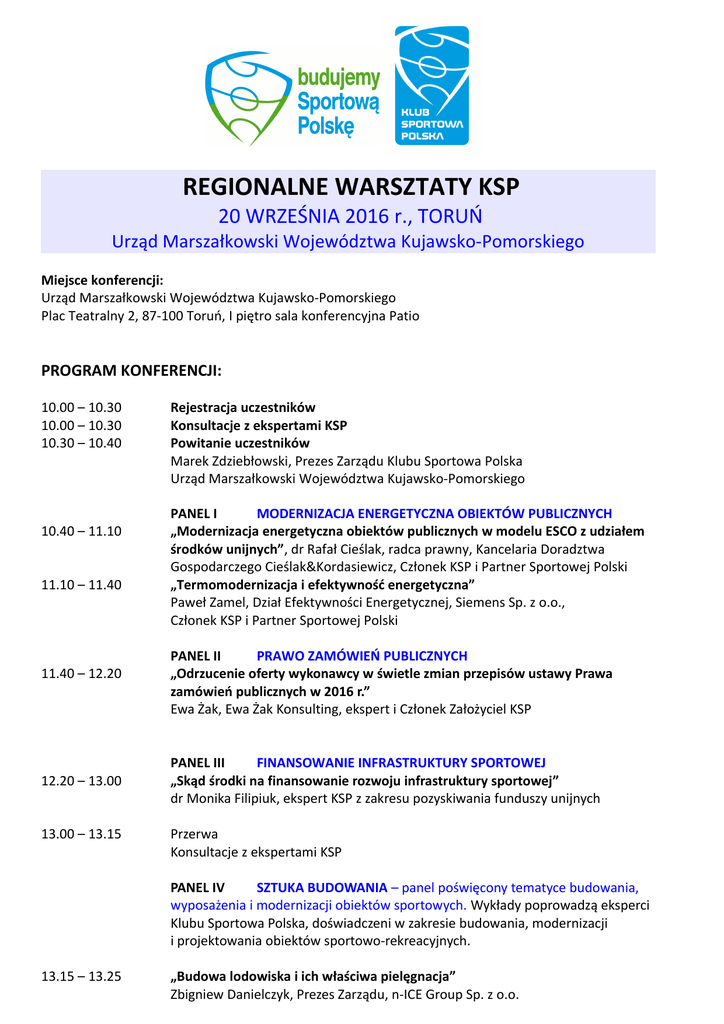 REGIONALNE WARSZTATY KSP 20 WRZEŚNIA 2016 r., TORUŃ Urząd Marszałkowski Województwa Kujawsko-Pomorskiego Miejsce konferencji: Urząd Marszałkowski Województwa Kujawsko-Pomorskiego Plac Teatralny 2, 87-100 Toruń, I piętro sala konferencyjna Patio PROGRAM KONFERENCJI: 10.00 – 10.30 10.00 – 10.30 10.30 – 10.40 10.40 – 11.10 11.10 – 11.40 11.40 – 12.20 12.20 – 13.00 13.00 – 13.15 Rejestracja uczestników Konsultacje z ekspertami KSP Powitanie uczestników Marek Zdziebłowski, Prezes Zarządu Klubu Sportowa Polska Urząd Marszałkowski Województwa Kujawsko-Pomorskiego PANEL I MODERNIZACJA ENERGETYCZNA OBIEKTÓW PUBLICZNYCH „Modernizacja energetyczna obiektów publicznych w modelu ESCO z udziałem środków unijnych”, dr Rafał Cieślak, radca prawny, Kancelaria Doradztwa Gospodarczego Cieślak&Kordasiewicz, Członek KSP i Partner Sportowej Polski „Termomodernizacja i efektywność energetyczna” Paweł Zamel, Dział Efektywności Energetycznej, Siemens Sp. z o.o., Członek KSP i Partner Sportowej Polski PANEL II PRAWO ZAMÓWIEŃ PUBLICZNYCH „Odrzucenie oferty wykonawcy w świetle zmian przepisów ustawy Prawa zamówień publicznych w 2016 r.” Ewa Żak, Ewa Żak Konsulting, ekspert i Członek Założyciel KSP PANEL III FINANSOWANIE INFRASTRUKTURY SPORTOWEJ „Skąd środki na finansowanie rozwoju infrastruktury sportowej” dr Monika Filipiuk, ekspert KSP z zakresu pozyskiwania funduszy unijnych Przerwa Konsultacje z ekspertami KSP PANEL IV SZTUKA BUDOWANIA – panel poświęcony tematyce budowania, wyposażenia i modernizacji obiektów sportowych. Wykłady poprowadzą eksperci Klubu Sportowa Polska, doświadczeni w zakresie budowania, modernizacji i projektowania obiektów sportowo-rekreacyjnych. 13.15 – 13.25 „Budowa lodowiska i ich właściwa pielęgnacja” Zbigniew Danielczyk, Prezes Zarządu, n-ICE Group Sp. z o.o. Firma jest członkiem KSP i Ambasadorem Sportowej Polski 13.25 – 13.35 13.35 – 13.45 13.45 – 13.55 13.55 – 14.05 14.05 – 14.15 14.15 – 14.25 14.25 – 14.35 14.35 – 14.45 15.00 – 16.30 „NOVOFLOOR ICE – sport i zabawa przez cały rok” Grzegorz Tworek, Zastępca Dyrektora Działu Marketingu Wyrobów dla Budownictwa, Novol Sp. z o.o. Firma jest Członkiem Założycielem KSP i Ambasadorem Sportowej Polski. „Aktywna Woda z Elplast + - zagospodarowanie akwenów wodnych poprzez budowę nowoczesnych kąpielisk na akwenach oraz przystani cumowniczych na bazie modułowych pomostów pływających – Elplast + Sp. z o.o.” Marzena Kern-Michalczuk, Product Menadżer, Elplast + Sp. z o.o. Firma jest członkiem KSP i Partnerem Sportowej Polski „BODYS – urządzenia do ćwiczeń na świeżym powietrzu” Anna Polaniecka, Prezes Zarządu Bodys Sp. z o.o. Firma jest członkiem KSP i Partnerem Sportowej Polski „Modernizacja krytych pływalni i kąpielisk” Marek Wrzal, Prezes Zarządu, Berndorf Baderbau Sp. z o.o. Firma jest członkiem założycielem KSP i Ambasadorem Sportowej Polski „Zabezpieczenie i konserwacja podłóg sportowych” Magda Piątkowska, Prezes Zarządu Janser Polska Sp. z o.o. Firma jest członkiem KSP. „Urządzenie dynamiczne – ciekawe rozwiązanie dla młodzieży” Jos Muller, Wiceprezes Zarządu, Educarium Sp. z o.o. Firma jest członkiem KSP „Pumptrack – obiekt sportowy nowej generacji” Aleks Bartkowiak, Prezes Zarządu BTProject. Firma jest członkiem KSP „Czy wybudowano już wszystko? Fakty i mity o infrastrukturze sportowej w Polsce”, Adam Horodecki, Menedżer Sprzedaży Forum Seating, Nowy Styl Group. Firma jest Członkiem KSP Obiad i rozmowy indywidualne KONSULTACJE KLUBU SPORTOWA POLSKA (zakres konsultacji możliwych podczas Regionalnych Warsztatów KSP) Termomodernizacja i efektywność energetyczna Paweł Zamel, Dział Efektywności Energetycznej, Siemens Sp. z o.o. Modernizacja energetyczna obiektów publicznych w modelu ESCO z udziałem środków unijnych dr Rafał Cieślak, radca prawny, Kancelaria Doradztwa Gospodarczego Cieślak & Kordasiewicz Źródła finansowania infrastruktury sportowej dr Monika Filipiuk, Ekspert KSP z zakresu pozyskiwania funduszy unijnych Prawo Zamówień Publicznych Ewa Żak, Właściciel Ewa Żak Konsulting, Ekspert i Członek Założyciel KSP Modernizacja krytych pływalni i kąpielisk Marek Wrzal, Prezes Zarządu, Berndorf Baderbau Sp. z o.o. DAISY I ULTRAFILTRACJA – oszczędność wody, ścieków, prądu i ciepła Zbigniew Wojciul, Właściciel P.P.H.U ANCHEM Grzegorz Wojciul, Kierownik ds. Technicznych, P.P.H.U. Anchem Nowoczesne systemy nawierzchni sportowych oraz posadzek przemysłowych Novofloor Grzegorz Tworek, Zastępca Dyrektora Działu Marketingu Wyrobów dla Budownictwa, Novol Sp. z o.o. Budowa lodowisk i ich właściwa pielęgnacja Zbigniew Danielczyk, Prezes Zarządu, n-ICE Group Sp. z o.o. Pozabilansowe formy finansowania inwestycji JST Łukasz Spławski, Z-ca Dyrektora ds. finansowania Jednostek Samorządu Terytorialnego, Magellan S.A. Urządzenia do ćwiczeń na świeżym powietrzu Anna Polaniecka, Prezes Zarządu, Bodys Sp. z o.o. Pielęgnacja i remonty nawierzchni sportowych w halach Wiesław Borkowicz, Dyrektor ds. Handlowych, Hemet Sp. z o.o. Nawierzchnie sportowe – charakterystyki techniczno-użytkowe oraz metody ich weryfikacji dr Ewa Sudoł, pracownik Instytutu Techniki Budowlanej Zagospodarowanie akwenów wodnych – pomosty i baseny pływające Marzena Kern-Michalczuk, Product Manager, Elplast + Sp. z o.o. Komory kriogeniczne, komory hiperbaryczne oraz urządzenia do rehabilitacji schorzeń narządów ruchu DBC Piotr Stelmaszewski, Product Manager, Creator Sp. z o.o. Wewnętrzne nawierzchnie sportowe Arkadiusz Apolinarski, Commercial Segments Sales Manager, Tarkett Polska Sp. z o. o. Rowerowe place zabaw – PUMPTRACK Aleks Bartkowiak, Prezes Zarządu BTProject Projektowanie i budowa placów zabaw Jos Muller, Wiceprezes Zarządu, Educarium Sp. z o.o. Doradztwo, sprzedaż, serwis urządzeń czyszczących (szorowarki, 