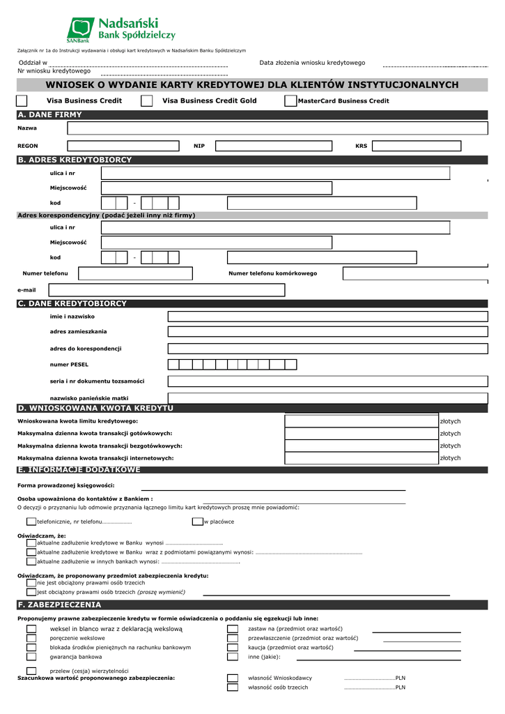 Załącznik nr 1a do Instrukcji wydawania i obsługi kart kredytowych w Nadsańskim Banku Spółdzielczym Oddział w Nr wniosku kredytowego Data złożenia wniosku kredytowego WNIOSEK O WYDANIE KARTY KREDYTOWEJ DLA KLIENTÓW INSTYTUCJONALNYCH Visa Business Credit Visa Business Credit Gold MasterCard Business Credit A. DANE FIRMY Nazwa REGON NIP KRS B. ADRES KREDYTOBIORCY ulica i nr Miejscowość kod - Adres korespondencyjny (podać jeżeli inny niż firmy) ulica i nr Miejscowość kod - Numer telefonu Numer telefonu komórkowego e-mail C. DANE KREDYTOBIORCY imie i nazwisko adres zamieszkania adres do korespondencji numer PESEL seria i nr dokumentu tozsamości nazwisko panieńskie matki D. WNIOSKOWANA KWOTA KREDYTU Wnioskowana kwota limitu kredytowego: złotych Maksymalna dzienna kwota transakcji gotówkowych: złotych Maksymalna dzienna kwota transakcji bezgotówkowych: złotych Maksymalna dzienna kwota transakcji internetowych: złotych E. INFORMACJE DODATKOWE Forma prowadzonej księgowości: Osoba upoważniona do kontaktów z Bankiem : O decyzji o przyznaniu lub odmowie przyznania łącznego limitu kart kredytowych proszę mnie powiadomić: telefonicznie, nr telefonu………………… w placówce Oświadczam, że: aktualne zadłużenie kredytowe w Banku wynosi …………………………………. aktualne zadłużenie kredytowe w Banku wraz z podmiotami powiązanymi wynosi: ………………………………………………………………… aktualne zadłużenie w innych bankach wynosi: ………………………………………………. Oświadczam, że proponowany przedmiot zabezpieczenia kredytu: nie jest obciążony prawami osób trzecich jest obciążony prawami osób trzecich (proszę wymienić) F. ZABEZPIECZENIA Proponujemy prawne zabezpieczenie kredytu w formie oświadczenia o poddaniu się egzekucji lub inne: weksel in blanco wraz z deklaracją wekslową zastaw na (przedmiot oraz wartość) poręczenie wekslowe przewłaszczenie (przedmiot oraz wartość) blokada środków pieniężnych na rachunku bankowym kaucja (przedmiot oraz wartość) gwarancja bankowa inne (jakie): przelew (cesja) wierzytelności Szacunkowa wartość proponowanego zabezpieczenia: własność Wnioskodawcy ………………………………PLN własność osób trzecich ………………………………PLN G. MIESIĘCZNE WYCIĄGI Miesięczne wyciągi enerowane 7 dnia każdego miesiąca (po zakończenia okresu rozliczeniowego) */: wysłać na adres korespondencyjny wysłać na adres e-mail udostępnić w bankowości internetowej Spłata zadłużenia karty kredytowej */: poprzez bezpośrednią wpłatę na rachunek karty kredytowej w ciężar rachunku bankowego wskazanego w Umowie o kartę kredytową: stosować do minimalnej spłaty zadłużenia na karcie stosować do całkowitego salda zadłużenia Informujemy, że w przypadku nie dokonania żadnej transakcji płatniczej w danym okresie rozliczeniowym oraz braku zadłużenia wobec Banku z tytułu posługiwania się kartą Zestawienie transakcji płatniczych nie będzie generowane i przesyłane. H. DO WNIOSKU ZAŁACZAM/Y: 1) dokumenty formalno-prawne tj. dokumenty założycielskie: KRS, zaświadczenie o wpisie do ewidencji działalności gospodarczej lub odpis z rejestru właściwego dla formy prawnej Wnioskodawcy, 2) zaświadczenie*/oświadczenie* o nie zaleganiuz płatnościami na rzecz ZUS, 3) zaświadczenie*/oświadczenie* o nie zaleganiu z płatnościami na rzecz US, 4) kserokopię dowodu osobistego bądź innego dokumentu zwierającego zdjęcie i numer PESEL Wnioskodawcy i Użytkowników karty, 5) sprawozdanie finansowe z 2 pełnych lat obrotowych i bieżącego okresu 6) inne dokumenty (wymienić):…………………………………………………………………………………………………………………………………………………………………………………………. I. OŚWIADCZENIA 1. Przyjmuję do wiadomości informację Nadsańskiego Banku Spółdzielczym że: 1) Nadsański Bank Spółdzielczy z siedzibą w Stalowej Woli przy ul. Okulickiego 56C, będzie administratorem moich danych osobowych w rozumieniu ustawy z dnia 29 sierpnia 1997 r. o ochronie danych osobowych (Dz. U. z 2002 r. Nr 101, poz. 926, z późn. zm); 2) dane te przetwarzane będą przez Nadsański Bank Spółdzielczy w celu rozpatrzenia niniejszego Wniosku oraz zawarcia i realizacji Umowy, a także w celach określonych w art. 23 ust. 1 pkt 3 ustawy o ochronie danych osobowych; 3) w zakresie ubezpieczenia assistance, Administratorem Danych, zgodnie z art. 23 ust. 1 pkt 3 ustawy z dnia 29 sierpnia 1997 r. o ochronie danych osobowych, (Dz. U. z 2002 r., Nr 101, poz. 926 z późn. zm.), jest Concordia Polska Towarzystwo Ubezpieczeń Wzajemnych z siedzibą w Poznaniu, ul. Św. Michała 43, 61-119 Poznań; 3) Nadsański Bank Spółdzielczy nie będzie udostępniać tych danych innym podmiotom, z wyjątkiem podmiotów i okoliczności ujawnienia danych przewidzianych w ustawie z dnia 29 sierpnia 1997 r. Prawo bankowe (Dz. U. z 2012 r., poz. 1376, z późn. zm.) oraz innych przepisach powszechnie obowiązujących . W szczególności Bank będzie przekazywał dane do instytucji utworzonych na podstawie art. 105 ust. 4 ustawy Prawo bankowe, w tym do Biura Informacji Kredytowej S.A. z siedzibą w Warszawie - Biuro Obsługi Klienta przy ul. Postępu 17a oraz do Systemu BANKOWY REJESTR, którego administratorem danych jest Związek Banków Polskich z siedzibą w Warszawie przy ul. Kruczkowskiego8, przetwarzających dane w celu oceny zdolności kredytowej i analizy ryzyka kredytowego, zgodnie z zasadami określonymi w art. 105 ust. 4, ust. 4a i 4d oraz w art. 105a ustawy 4) przysługuje mi prawo dostępu do treści podanych danych osobowych oraz możliwość ich poprawiania. 2. Na podstawie Ustawy o ochronie danych osobowych z dnia 29.08.1997 r. (Dz. U. 2002, nr 101, poz. 926 z późn. zm.), wyrażam zgodę na przetwarzanie moich danyc