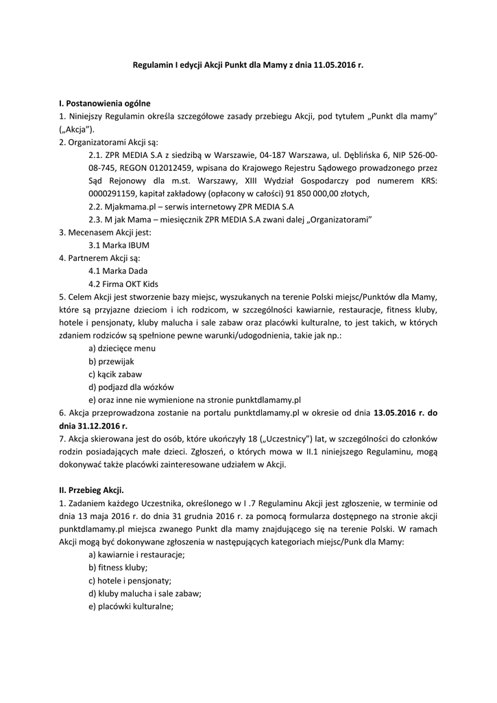 Regulamin I edycji Akcji Punkt dla Mamy z dnia 11.05.2016 r. I. Postanowienia ogólne 1. Niniejszy Regulamin określa szczegółowe zasady przebiegu Akcji, pod tytułem „Punkt dla mamy” („Akcja”). 2. Organizatorami Akcji są: 2.1. ZPR MEDIA S.A z siedzibą w Warszawie, 04-187 Warszawa, ul. Dęblińska 6, NIP 526-0008-745, REGON 012012459, wpisana do Krajowego Rejestru Sądowego prowadzonego przez Sąd Rejonowy dla m.st. Warszawy, XIII Wydział Gospodarczy pod numerem KRS: 0000291159, kapitał zakładowy (opłacony w całości) 91 850 000,00 złotych, 2.2. Mjakmama.pl – serwis internetowy ZPR MEDIA S.A 2.3. M jak Mama – miesięcznik ZPR MEDIA S.A zwani dalej „Organizatorami” 3. Mecenasem Akcji jest: 3.1 Marka IBUM 4. Partnerem Akcji są: 4.1 Marka Dada 4.2 Firma OKT Kids 5. Celem Akcji jest stworzenie bazy miejsc, wyszukanych na terenie Polski miejsc/Punktów dla Mamy, które są przyjazne dzieciom i ich rodzicom, w szczególności kawiarnie, restauracje, fitness kluby, hotele i pensjonaty, kluby malucha i sale zabaw oraz placówki kulturalne, to jest takich, w których zdaniem rodziców są spełnione pewne warunki/udogodnienia, takie jak np.: a) dziecięce menu b) przewijak c) kącik zabaw d) podjazd dla wózków e) oraz inne nie wymienione na stronie punktdlamamy.pl 6. Akcja przeprowadzona zostanie na portalu punktdlamamy.pl w okresie od dnia 13.05.2016 r. do dnia 31.12.2016 r. 7. Akcja skierowana jest do osób, które ukończyły 18 („Uczestnicy”) lat, w szczególności do członków rodzin posiadających małe dzieci. Zgłoszeń, o których mowa w II.1 niniejszego Regulaminu, mogą dokonywać także placówki zainteresowane udziałem w Akcji. II. Przebieg Akcji. 1. Zadaniem każdego Uczestnika, określonego w I .7 Regulaminu Akcji jest zgłoszenie, w terminie od dnia 13 maja 2016 r. do dnia 31 grudnia 2016 r. za pomocą formularza dostępnego na stronie akcji punktdlamamy.pl miejsca zwanego Punkt dla mamy znajdującego się na terenie Polski. W ramach Akcji mogą być dokonywane zgłoszenia w następujących kategoriach miejsc/Punk dla Mamy: a) kawiarnie i restauracje; b) fitness kluby; c) hotele i pensjonaty; d) kluby malucha i sale zabaw; e) placówki kulturalne; Zgłoszenia dokonuje się za pomocą formularza, o którym mowa, powyżej, który znajduje się na stronie punktdlamamy.pl 2. Zgłoszenie wymaga: - zarejestrowania się na stronie punktdlamamy.pl - wypełnienie formularza zgłoszeniowego - jeden Użytkownik może dodać dowolną liczbę miejsc/Punktów dla Mamy 3. Poprzez przystąpienie do Akcji na skutek przesłania Zgłoszenia Uczestnik: - akceptuje Regulamin Akcji, - wyraża zgodę na otrzymywanie informacji związanych z Akcją na adres mailowy podany podczas rejestracji - wyraża zgodę na publikowanie na łamach wydań miesięcznika „M jak Mama", a także w serwisach www.punktdlamamay.pl i www.mjakmama.pl oraz w publikacjach związanych z Akcją swojej nazwy użytkownika oraz treści swojego zgłoszenia - wyraża zgodę na umieszczenie w bazie danych i przetwarzanie przez Organizatorów danych osobowych wskazanych w Zgłoszeniu, podczas rejestracji w zakresie niezbędnym dla przeprowadzenia Akcji 4. Wskazane Punkty będą opisane w serwisach internetowych Wydawcy Grupy ZPR Media Spółka Akcyjna www.mjakmama.pl, www.punktdlamamy.pl 5. Decyzja o nadaniu wskazanym Punktom tytułu „Punkt dla Mamy” podjęta zostanie zgodnie z regulaminem Plebiscytu Punkt dla Mamy przez kapitułe Akcji na podstawie punktacji wszystkich nadesłanych zgłoszeń oraz komentarzy. Weryfikacja odbywać się będzie w terminie do 31.12.2016 r. 6. Podsumowanie akcji zostanie opublikowane na łamach wydania miesięcznika M jak Mama w terminie do 31.12.2016 r. 7. Lista wyróżnionych Punktów zostanie opublikowana w serwisie internetowym: www.punktdlamamy.pl oraz mjakmama.pl do dnia 31.12.2016 r. 8. Punkty, którym przyznany zostanie tytuł „Punktu dla Mamy” otrzymają Certyfikaty i naklejki "Punkt dla Mamy - edycja 2016", którymi będą miały prawo posługiwać się przez okres 1 roku od dnia podsumowania Akcji, o którym mowa w punkcie 5 powyżej. 9. Każdy zgłoszony punkt podlega weryfikacji redakcji mjakmama.pl 10. Zgłoszenia które nie będą spełniały regulaminu strony zostaną usunięte III . Prawa autorskie 1. Wszystkie osoby zgłaszające zdjęcia miejsc, w formularzu zgłoszeniowym Punkt dla mamy oświadczają że są wyłącznymi właścicielami praw autorskich materiałów zdjęciowych, które przedstawiają w formularzu zgłoszeniowym. 2. Autor opisu pod zgłoszeniem oświadcza, że jest pełnoprawnym autorem tego opisu i jest to jego własna praca. 3. Organizatorzy Akcji zastrzegają sobie prawo nieodpłatnego wykorzystania nadesłanych prac (lub ich fragmentów) na potrzeby konkursu, a w szczególności do publikacji w Internecie lub prezentacji w innych mediach. IV . Postanowienia końcowe 1. Regulamin znajduje się do wglądu w siedzibie ZPR MEDIA S.A z siedzibą w Warszawie przy ul. Dęblińskiej 6, a także na stronach internetowych: www.punktdlamamy.pl i www.mjakmama.pl. 2. Wszelkie dodatkowe pytania związane z przebiegiem i warunkami Akcji można kierować na adres e-mail: [email protected]