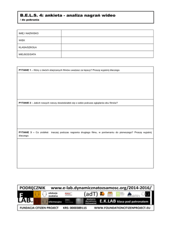 B.E.L.S. 4: ankieta - analiza nagrań wideo / do pobrania IMIĘ I NAZWISKO WIEK KLASA/SZKOŁA MIEJSCE/DATA PYTANIE 1 – Który z dwóch obejrzanych filmów uważasz za lepszy? Proszę wyjaśnij dlaczego. PYTANIE 2 – Jakich nowych rzeczy dowiedziałeś się o sobie podczas oglądania obu filmów? PYTANIE 3 – Co zrobiłeś dlaczego. inaczej podczas nagrania drugiego filmu, w porównaniu do pierwszego? Proszę wyjaśnij