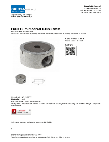 OkuciaOnline.pl [email protected] tel. +48 56 676 19 26 tel. +48 663 484 595 Zapraszamy do sklepu www.okuciaonline.pl FUERTE mimośród fi35x17mm kod produktu: 11.03.610-4 kategoria: Kategorie > Systemy połączeń, elementy złączne > Systemy połączeń > Fuerte Cena brutto: 4,25 zł Cena netto: 3,46 zł Kod QR: Mimośród fi35 FUERTE Materiał: znal Wymiar fi35x17mm, imbus 6mm Do łączenia elementów łóżek, stołów, skrzyń itp. szczególnie zalecany do drewna litego i ciężkich elementów Animacja zasady działania systemu FUERTE: // strona: 1/2 wydrukowano: 03-03-2017 http://www.okuciaonline.pl/fuerte-mimosrod-fi35x17mm-11-03-610-4.html strona: 2/2 wydrukowano: 03-03-2017 http://www.okuciaonline.pl/fuerte-mimosrod-fi35x17mm-11-03-610-4.html