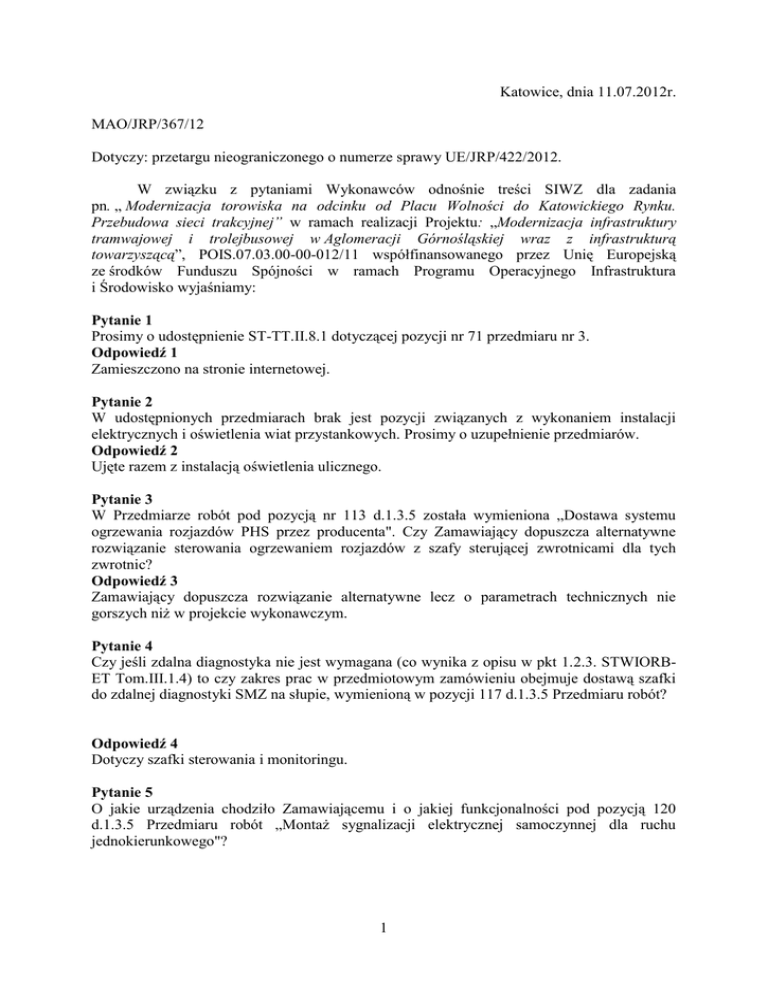Katowice, dnia 11.07.2012r. MAO/JRP/367/12 Dotyczy: przetargu nieograniczonego o numerze sprawy UE/JRP/422/2012. W związku z pytaniami Wykonawców odnośnie treści SIWZ dla zadania pn. „ Modernizacja torowiska na odcinku od Placu Wolności do Katowickiego Rynku. Przebudowa sieci trakcyjnej” w ramach realizacji Projektu: „Modernizacja infrastruktury tramwajowej i trolejbusowej w Aglomeracji Górnośląskiej wraz z infrastrukturą towarzyszącą”, POIS.07.03.00-00-012/11 współfinansowanego przez Unię Europejską ze środków Funduszu Spójności w ramach Programu Operacyjnego Infrastruktura i Środowisko wyjaśniamy: Pytanie 1 Prosimy o udostępnienie ST-TT.II.8.1 dotyczącej pozycji nr 71 przedmiaru nr 3. Odpowiedź 1 Zamieszczono na stronie internetowej. Pytanie 2 W udostępnionych przedmiarach brak jest pozycji związanych z wykonaniem instalacji elektrycznych i oświetlenia wiat przystankowych. Prosimy o uzupełnienie przedmiarów. Odpowiedź 2 Ujęte razem z instalacją oświetlenia ulicznego. Pytanie 3 W Przedmiarze robót pod pozycją nr 113 d.1.3.5 została wymieniona „Dostawa systemu ogrzewania rozjazdów PHS przez producenta". Czy Zamawiający dopuszcza alternatywne rozwiązanie sterowania ogrzewaniem rozjazdów z szafy sterującej zwrotnicami dla tych zwrotnic? Odpowiedź 3 Zamawiający dopuszcza rozwiązanie alternatywne lecz o parametrach technicznych nie gorszych niż w projekcie wykonawczym. Pytanie 4 Czy jeśli zdalna diagnostyka nie jest wymagana (co wynika z opisu w pkt 1.2.3. STWIORBET Tom.III.1.4) to czy zakres prac w przedmiotowym zamówieniu obejmuje dostawą szafki do zdalnej diagnostyki SMZ na słupie, wymienioną w pozycji 117 d.1.3.5 Przedmiaru robót? Odpowiedź 4 Dotyczy szafki sterowania i monitoringu. Pytanie 5 O jakie urządzenia chodziło Zamawiającemu i o jakiej funkcjonalności pod pozycją 120 d.1.3.5 Przedmiaru robót „Montaż sygnalizacji elektrycznej samoczynnej dla ruchu jednokierunkowego"? 1 Odpowiedź 5 Dotyczy urządzeń z etapowaniem robót sygnalizacyjnych na odcinkach jednotorowych związane Pytanie 6 Prosimy o potwierdzenie iż zakres przedmiotowego zamówienia obejmuje wyłącznie: przebudowę torowiska tramwajowego wraz z odwodnieniem(Tom II.1 i Tom II.9.1), przebudowę sieci trakcyjnej z zasilaniem (Tom II.5), przebudowę sieci elektroenergetycznej i oświetlenia – torowisko (Tom II.6.1), przebudowę sieci teletechnicznej (Tom II.8), przebudowę sieci gazowej (Tom II.11), przebudowę kanalizacji ogólnospławnej (Tom II. 10), przebudowę sieci wodociągowej (Tom II.12), zieleń i elementy małej architektury (Tom II.13). Odpowiedź 6 Zakres przedmiotu zamówienia obejmuje przebudowę torowiska tramwajowego w zakresie ujętym w przedmiarze robót. Pytanie 7 Prosimy o potwierdzenie zakres przedmiotowego zamówienia nie obejmuje projektów: Tom II.2 Projekt Drogowy, Tom II.3 Projekt Stałej Organizacji Ruchu, Tom II.6.2 Projekt przebudowy Sieci Elektroenergetycznej i Oświetlenia -droga, Tom II.7 Projekt Elektryczny sygnalizacji świetlnej, Tom II.9.2 Projekt Odwodnienia - część drogowa. Wykonawca nadmienia iż w/w projekty nie są umieszczone na stronie Zamawiającego. Odpowiedź 7 Zakres przedmiotu zamówienia obejmuje przebudowę torowiska tramwajowego w zakresie ujętym w przedmiarze robót. Pytanie 8 Prosimy o uzupełnienie dokumentacji o Tom II.15.2 - plan BIOZ - Finansowanie z budżetu Miasta. Odpowiedź 8 Dokumentacja została zamieszczona na stronie Zamawiającego Pytanie 9 Prosimy o zamieszczenie na stronie przedmiarów zaktualizowanych w oparciu o odpowiedzi udzielone przez Zamawiającego. Jeśli Zamawiający nie zamierza umieścić na stronie aktualnych przedmiarów, prosimy o wskazanie nr działu, pozycji, podstawy wyceny, nr specyfikacji technicznej, opisu, jednostki oraz ilości robót, które Wykonawca powinien zamieścić w przedmiarze. Odpowiedź 9 Z uwagi na nieduże zmiany zamawiający nie będzie zamieszczał zaktualizowanych przedmiarów. Pozycje dodatkowe należy dopisać na koniec przedmiaru. Pytanie 10 Czy w konstrukcjach nośnych sieci trakcyjnej należy użyć tłumików drgań. Jeżeli tak to prosimy o uzupełnienie rysunków konstrukcyjnych oraz o podanie parametrów technicznych tłumików drgań. Odpowiedź 10 Należy wykonać zgodnie z dokumentacją projektową. 2 Pytanie 11 Czy dla połączeń międzytorowych, międzytokowych i podłączeń kabli powrotnych do szyn należy użyć skrzynek przyszynowych. Jeżeli tak to prosimy o podanie rozwiązania technicznego skrzynki jakie należy zastosować (rysunek techniczny, parametry techniczne skrzynki). Odpowiedź: Należy wykonać zgodnie z dokumentacją projektową. Pytanie 12 Prosimy o podanie parametrów technicznych systemu sterowania i ogrzewania zwrotnic w celu umożliwienia zastosowania rozwiązań równoważnych innych producentów zgodnie z zapisami Prawa Zamówień Publicznych. Odpowiedź 12 Parametry zostały zawarte w dokumentacji projektowej. Pytanie 13 W której pozycji kosztorysowej należy wycenić montaż szafy kabli powrotnych wraz z podłączeniami do szyn. Odpowiedź 13 Montaż uczynienia szyn poz. 98. Pytanie 14 Prosimy o wyjaśnienie czy podane w przedmiarze długości przebudowy kabli SN dotyczą długości linii 3-kablowej czy całkowitej długości kabli do przebudowy. Odpowiedź 14 Zgodnie z przedmiarem 1 m kabla. Pytanie 15 W Projekcie Wykonawczym TOM II. 8.1 uwzględniono do przebudowy kable TKD, które zostały wycofane z produkcji z końcem 2011 roku. Czy zamawiający dopuszcza zastosowanie zamiennych kabli XzTKMXpw o pojemności podobnej oraz o średnicy żył 0,8 mm? Odpowiedź 15 Zamawiający dopuszcza rozwiązanie alternatywne lecz o parametrach technicznych nie gorszych niż w projekcie wykonawczym Pytanie 16 W Projekcie Wykonawczym TOM II.8.1 uwzględniono budowę nowego rurociągu kablowego oraz kabla światłowodowego 6J dla ekranów LED, ale brak przedmiaru dla tego zakresu. Odpowiedź 16 Zakres rzeczowy U