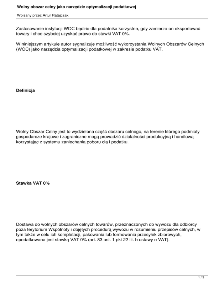 Wolny obszar celny jako narzędzie optymalizacji podatkowej Wpisany przez Artur Ratajczak Zastosowanie instytucji WOC będzie dla podatnika korzystne, gdy zamierza on eksportować towary i chce szybciej uzyskać prawo do stawki VAT 0%. W niniejszym artykule autor sygnalizuje możliwość wykorzystania Wolnych Obszarów Celnych (WOC) jako narzędzia optymalizacji podatkowej w zakresie podatku VAT. Definicja Wolny Obszar Celny jest to wydzielona część obszaru celnego, na terenie którego podmioty gospodarcze krajowe i zagraniczne mogą prowadzić działalności produkcyjną i handlową korzystając z systemu zaniechania poboru cła i podatku. Stawka VAT 0% Dostawa do wolnych obszarów celnych towarów, przeznaczonych do wywozu dla odbiorcy poza terytorium Wspólnoty i objętych procedurą wywozu w rozumieniu przepisów celnych, w tym także w celu ich kompletacji, pakowania lub formowania przesyłek zbiorowych, opodatkowana jest stawką VAT 0% (art. 83 ust. 1 pkt 22 lit. b ustawy o VAT). 1/3 Wolny obszar celny jako narzędzie optymalizacji podatkowej Wpisany przez Artur Ratajczak Prawo wspólnotowe Zastosowanie względem powyższych czynności stawki VAT 0% jest wykorzystaniem możliwości 112 dyrektywy VAT z 2006 r. (art. 154-163) która pozwala na stosowanie tzw. środków specjalnych. Zgodnie jej regulacjami państwa członkowskie mogą wprowadzić środki specjalne w celu zwolnienia z podatku (przy zachowaniu prawa do odliczenia) określonych w tym przepisie dostaw towarów. Zwolnienia powyższe mają upraszczać rozliczenia podatkowe względem towarów, których po przywozie jeszcze nie dopuszczono do obrotu na terenie danego państwa albo które przeznaczone są na eksport. Dokumentacja Warunkiem zastosowania obniżonej stawki VAT jest prowadzenie dokumentacji (art. 83 ust. 2 ustawy o VAT). Ustawodawca niestety nie sprecyzował, jaka to miałaby być dokumentacja, nie zostało także wydane w tej kwestii rozporządzenie wykonawcze. Towary są wprowadzane do WOC na podstawie dokumentów związanych z transportem, takich jak list przewozowy, dowód dostawy, manifest lub kwit wysyłkowy; dokumenty te powinny zawierać wszystkie informacje niezbędne dla ustalenia tożsamości wprowadzanych towarów. Podmioty prowadzące WOC mają obowiązek prowadzenia szczegółowej ewidencji towarowej 2/3 Wolny obszar celny jako narzędzie optymalizacji podatkowej Wpisany przez Artur Ratajczak (towarów wprowadzanych i wyprowadzanych z WOC) która nadzorowana jest przez organy celne. Potwierdzeniem wprowadzenia towarów do WOC może być np. wydanie przez podmiot prowadzący WOC dokumentu w postaci wydruku komputerowego z ewidencji towarów wprowadzonych. Warto też zachować na potrzeby ewentualnej kontroli podatkowej fakturę sprzedaży towarów zagranicznemu kontrahentowi, umowę zawartą z WOC oraz oczywiście potwierdzenie zgłoszenia celnego do objęcia towarów procedurą wywozu (karta SAD-3 lub potwierdzenie elektroniczne ECS). Korzyści Zastosowanie instytucji WOC będzie dla podatnika korzystne w sytuacji gdy zamierza on eksportować towary i chce szybciej uzyskać prawo do zastosowania stawki VAT 0%. Mechanizm działania jest następujący: towary, które chcemy wyeksportować najpierw zgłaszamy do procedury celnej wywozu, następnie wprowadzamy do WOC i w tym momencie uzyskujemy już prawo do skorzystania ze stawki VAT 0%. W klasycznej sytuacji ze stawki VAT 0% możemy skorzystać dopiero, gdy wyeksportujemy towary za granicę. Później nasz zagraniczny kontrahent będzie mógł pobrać te towary z WOC (czynność ta nie jest opodatkowana VAT) pod warunkiem jednak, ze nadal będą one objęte procedurą wywozu (zgłoszenie to traci ważność w okresie 90 dni, jednakże procedurę można powtórzyć i zgłosić towary powtórnie do procedury wywozu). Towary złożone w WOC i objęte procedurą wywozu możemy również wywieźć sami lub skorzystać z pośrednika. 3/3