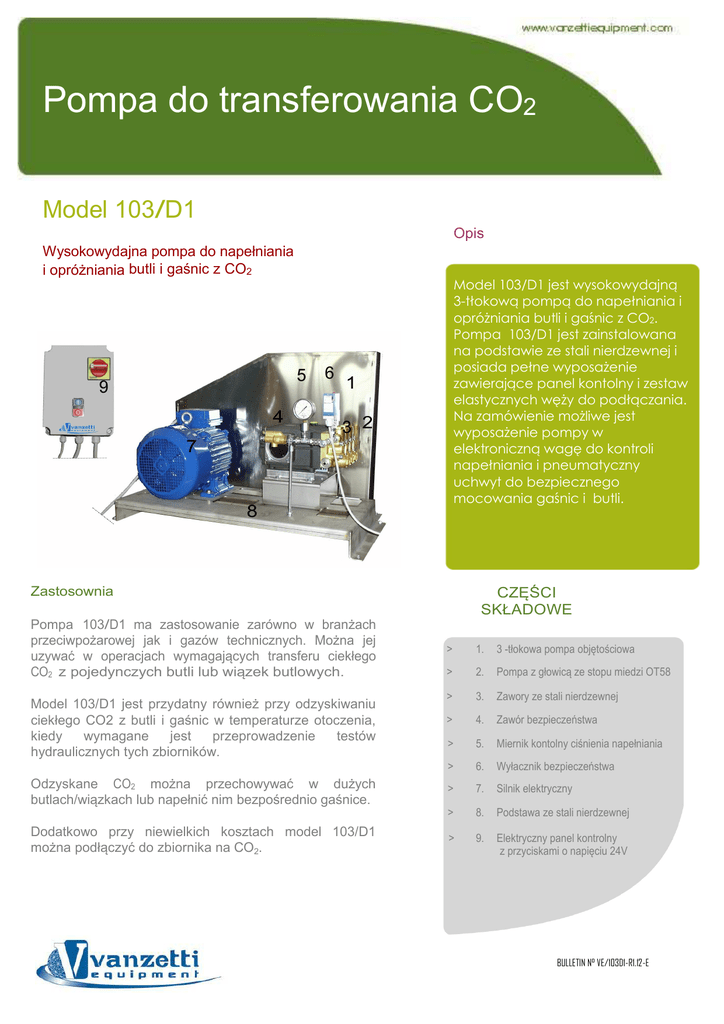 Pompa do transferowania CO2 Model 103/D1 Opis Wysokowydajna pompa do napełniania i opróżniania butli i gaśnic z CO2 5 9 4 6 Model 103/D1 jest wysokowydajną 3-tłokową pompą do napełniania i opróżniania butli i gaśnic z CO2. Pompa 103/D1 jest zainstalowana na podstawie ze stali nierdzewnej i posiada pełne wyposażenie zawierające panel kontolny i zestaw elastycznych węży do podłączania. Na zamówienie możliwe jest wyposażenie pompy w elektroniczną wagę do kontroli napełniania i pneumatyczny uchwyt do bezpiecznego mocowania gaśnic i butli. 1 3 2 7 8 Zastosownia Pompa 103/D1 ma zastosowanie zarówno w branżach przeciwpożarowej jak i gazów technicznych. Można jej uzywać w operacjach wymagających transferu ciekłego CO2 z pojedynczych butli lub wiązek butlowych. Model 103/D1 jest przydatny również przy odzyskiwaniu ciekłego CO2 z butli i gaśnic w temperaturze otoczenia, kiedy wymagane jest przeprowadzenie testów hydraulicznych tych zbiorników. Odzyskane CO2 można przechowywać w dużych butlach/wiązkach lub napełnić nim bezpośrednio gaśnice. Dodatkowo przy niewielkich kosztach model 103/D1 można podłączyć do zbiornika na CO2. CZĘŚCI SKŁADOWE > 1. 3 -tłokowa pompa objętościowa > 2. Pompa z głowicą ze stopu miedzi OT58 > 3. Zawory ze stali nierdzewnej > 4. Zawór bezpieczeństwa > 5. Miernik kontolny ciśnienia napełniania > 6. Wyłacznik bezpieczeństwa > 7. Silnik elektryczny > 8. Podstawa ze stali nierdzewnej > 9. Elektryczny panel kontrolny z przyciskami o napięciu 24V BULLETIN N° VE/103D1-R1.12-E Transferowanie CO2 STANDARDOWE AKCESORIA > > Elastyczny wąż wlotowy wykonany z PTFE przeplatanego ze stalą nierdzewną, dł. 2 m, w zestawie ze złączami do butli Elastyczny wąż napełniający wykonany z PTFE przeplatanego ze stalą nierdzewną, dł. 1,7 m, w zestawie ze złączami do butli i zaworem odcinającym > Instrukcja obsługi AIR4-BIL pozwala na unieruchomienie gaśnicy podczas opróżniania AKCESORIA NA ZAMÓWIENIE OPIS MODEL KOD Elastyczny wąż wlotowy dł. 2.5 m / MCB/MAL02 Elastyczny wąż napełniający dł. 2.5 m / MCB/MAV02 Elektoroniczna waga kontrolna, 150 Kg. podziałka 10g. ETW150 MZWE226 Elektroniczna waga kontrolna, 150 Kg. podziałka 50g. BE150/50FP600 MZWE007 Manualny uchwyt do przymocowania gaśnicy na wadze VIF/BIL MZVM002 Pneumatyczny uchwyt do przmocowania gaśnicy na wadze serii BE AIR4/BIL MZAP009 Kolektor do podłączenia 3 butli źródłowych z CO2 C3BB RGFN205 Stojak na 3 butle źródłowe podłączone do kolektora C3BB R3BB RGFN307 Komora chłodzenia na 2 butle źródłowe z CO2 / MCBE100 DOSTĘPNE MODELE I DANE TECHNICZNE MODEL 103/D1 103/D1 PRZEPŁYW (Kg/h) 300 300 MAX CIŚNIENIE ROBOCZE (Bar) 100 100 ZASILANIE (Volt/Hz) 400/50 trójfazowy 230/50 trójfazowy WYMIARY (SZER.xDŁxWYS. – mm) 1000x500x500 ~ 1000x500x500 ~ WAGA (Kg) 100 ~ 100 ~ BULLETIN N° VE/103D1-R1.12-E
