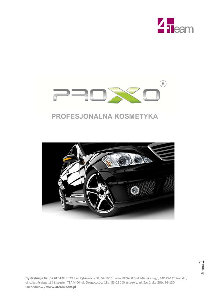 Strona 1 PROFESJONALNA KOSMETYKA Dystrybucja Grupa 4TEAM: ETOLL ul. Ząbkowicka 32, 57-100 Strzelin, PROAUTO ul. Mieszka I-ego, 24K 75-132 Koszalin, ul. Łukasińskiego 134 Szczecin, TEAM Oil ul. Drogowców 18a, 83-250 Skarszewy, ul. Zagórska 20b, 26-130 Suchedniów / www.4team.com.pl Nazwa PROXO Felga preparat do czyszczenia felg Nazwa PROXO Insekt preparat do usuwania insektów i innych zabrudzeń organicznych Nazwa Skutecznie usuwa: - osad z klocków hamulcowych - smołę - sól i błoto. Odtłuszcza powierzchnie aluminiowe i stalowe. Nie zawiera kwasów. Bezpieczny dla felg i kołpaków. Opis Skutecznie usuwa trudne zabrudzenia organiczne z powierzchni elementów szklanych, lakierowanych, gumowych i plastikowych. Opis Preparat na bazie wodnej emulsji silikonowej do nabłyszczania elementów wykonanych z gumy. Niezwykle szybko się wchłania nadając głęboką czerń i połysk. Dostępne opakowania 650ml atomizer Dostępne opakowania 650ml atomizer Dostępne opakowania 650ml atomizer Strona 2 PROXO Opona preparat nabłyszczający do opon Opis Dystrybucja Grupa 4TEAM: ETOLL ul. Ząbkowicka 32, 57-100 Strzelin, PROAUTO ul. Mieszka I-ego, 24K 75-132 Koszalin, ul. Łukasińskiego 134 Szczecin, TEAM Oil ul. Drogowców 18a, 83-250 Skarszewy, ul. Zagórska 20b, 26-130 Suchedniów / www.4team.com.pl Nazwa PROXO Kokpit matowy Nazwa PROXO Kokpit błyszczący Nazwa Preparat do pielęgnacji kokpitu z dodatkiem wosków naturalnych. Czyści i pielęgnuje, pozostawiając powierzchnię matową. Można stosować również do nielakierowanych zderzaków, spojlerów i gumy. Opis Preparat do pielęgnacji kokpitu z dodatkiem wosków naturalnych. Czyści i pielęgnuje nadając głęboki połysk. Działa antystatycznie, zapobiega osadzaniu się kurzu. Chroni przed promieniami UV. Opis Doskonały preparat do czyszczenia i konserwacji elementów z tworzyw sztucznych: plastików, linoleum, i sztucznej skóry. Dostępne opakowania 650ml atomizer Dostępne opakowania 650ml atomizer Dostępne opakowania 650ml atomizer Strona 3 PROXO Plastik preparat do czyszczenia plastików Opis Dystrybucja Grupa 4TEAM: ETOLL ul. Ząbkowicka 32, 57-100 Strzelin, PROAUTO ul. Mieszka I-ego, 24K 75-132 Koszalin, ul. Łukasińskiego 134 Szczecin, TEAM Oil ul. Drogowców 18a, 83-250 Skarszewy, ul. Zagórska 20b, 26-130 Suchedniów / www.4team.com.pl Nazwa PROXO Szyba preparat do mycia szyb Nazwa PROXO Silnik profesjonalny preparat do czyszczenia silnika Nazwa Uniwersalny preparat do czyszczenia szyb samochodowych i w gospodarstwach domowych, lusterek, reflektorów oraz innych powierzchni szklanych. Nie pozostawia smug. Zapobiega osadzaniu się pary. Pozostawia przyjemny zapach . Opis Bardzo silny i skuteczny preparat przeznaczony do mycia silników oraz podzespołów samochodowych. Usuwa oleje, smary oraz inne uporczywe zabrudzenia. Opis Wyjątkowo szybki i łatwy w stosowaniu. Przyspiesza wysychanie pojazdu. Przywraca naturalny połysk. Dostępne opakowania 650ml atomizer Dostępne opakowania 650ml atomizer dostępny wkrótce Dostępne opakowania 650ml atomizer Strona 4 PROXO Wosk na mokro Opis Dystrybucja Grupa 4TEAM: ETOLL ul. Ząbkowicka 32, 57-100 Strzelin, PROAUTO ul. Mieszka I-ego, 24K 75-132 Koszalin, ul. Łukasińskiego 134 Szczecin, TEAM Oil ul. Drogowców 18a, 83-250 Skarszewy, ul. Zagórska 20b, 26-130 Suchedniów / www.4team.com.pl Nazwa Silny preparat piorący do czyszczenia tapicerki i dywaników. Skutecznie usuwa brud i plamy z głębszych warstw tkaniny. Nie należy stosować do tapicerek skórzanych. Dostępne opakowania 650ml atomizer Strona 5 PROXO Tapicerka preparat do mycia tapicerki Opis Dystrybucja Grupa 4TEAM: ETOLL ul. Ząbkowicka 32, 57-100 Strzelin, PROAUTO ul. Mieszka I-ego, 24K 75-132 Koszalin, ul. Łukasińskiego 134 Szczecin, TEAM Oil ul. Drogowców 18a, 83-250 Skarszewy, ul. Zagórska 20b, 26-130 Suchedniów / www.4team.com.pl
