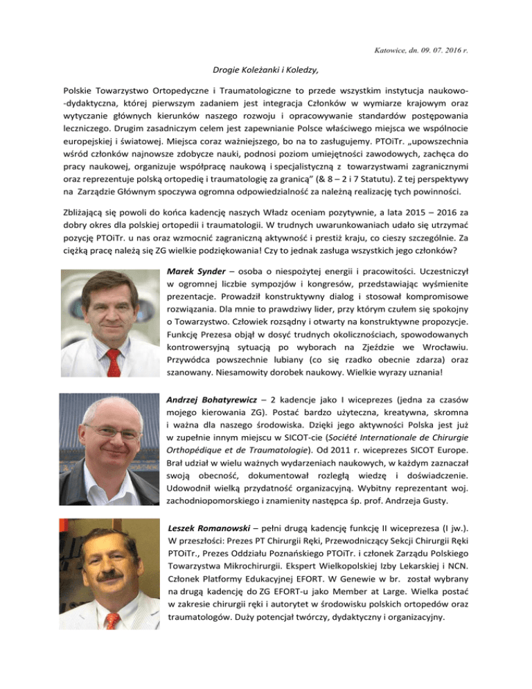 Katowice, dn. 09. 07. 2016 r. Drogie Koleżanki i Koledzy, Polskie Towarzystwo Ortopedyczne i Traumatologiczne to przede wszystkim instytucja naukowo-dydaktyczna, której pierwszym zadaniem jest integracja Członków w wymiarze krajowym oraz wytyczanie głównych kierunków naszego rozwoju i opracowywanie standardów postępowania leczniczego. Drugim zasadniczym celem jest zapewnianie Polsce właściwego miejsca we wspólnocie europejskiej i światowej. Miejsca coraz ważniejszego, bo na to zasługujemy. PTOiTr. „upowszechnia wśród członków najnowsze zdobycze nauki, podnosi poziom umiejętności zawodowych, zachęca do pracy naukowej, organizuje współpracę naukową i specjalistyczną z towarzystwami zagranicznymi oraz reprezentuje polską ortopedię i traumatologię za granicą” (& 8 – 2 i 7 Statutu). Z tej perspektywy na Zarządzie Głównym spoczywa ogromna odpowiedzialność za należną realizację tych powinności. Zbliżającą się powoli do końca kadencję naszych Władz oceniam pozytywnie, a lata 2015 – 2016 za dobry okres dla polskiej ortopedii i traumatologii. W trudnych uwarunkowaniach udało się utrzymać pozycję PTOiTr. u nas oraz wzmocnić zagraniczną aktywność i prestiż kraju, co cieszy szczególnie. Za ciężką pracę należą się ZG wielkie podziękowania! Czy to jednak zasługa wszystkich jego członków? Marek Synder – osoba o niespożytej energii i pracowitości. Uczestniczył w ogromnej liczbie sympozjów i kongresów, przedstawiając wyśmienite prezentacje. Prowadził konstruktywny dialog i stosował kompromisowe rozwiązania. Dla mnie to prawdziwy lider, przy którym czułem się spokojny o Towarzystwo. Człowiek rozsądny i otwarty na konstruktywne propozycje. Funkcję Prezesa objął w dosyć trudnych okolicznościach, spowodowanych kontrowersyjną sytuacją po wyborach na Zjeździe we Wrocławiu. Przywódca powszechnie lubiany (co się rzadko obecnie zdarza) oraz szanowany. Niesamowity dorobek naukowy. Wielkie wyrazy uznania! Andrzej Bohatyrewicz – 2 kadencje jako I wiceprezes (jedna za czasów mojego kierowania ZG). Postać bardzo użyteczna, kreatywna, skromna i ważna dla naszego środowiska. Dzięki jego aktywności Polska jest już w zupełnie innym miejscu w SICOT-cie (Société Internationale de Chirurgie Orthopédique et de Traumatologie). Od 2011 r. wiceprezes SICOT Europe. Brał udział w wielu ważnych wydarzeniach naukowych, w każdym zaznaczał swoją obecność, dokumentował rozległą wiedzę i doświadczenie. Udowodnił wielką przydatność organizacyjną. Wybitny reprezentant woj. zachodniopomorskiego i znamienity następca śp. prof. Andrzeja Gusty. Leszek Romanowski – pełni drugą kadencję funkcję II wiceprezesa (I jw.). W przeszłości: Prezes PT Chirurgii Ręki, Przewodniczący Sekcji Chirurgii Ręki PTOiTr., Prezes Oddziału Poznańskiego PTOiTr. i członek Zarządu Polskiego Towarzystwa Mikrochirurgii. Ekspert Wielkopolskiej Izby Lekarskiej i NCN. Członek Platformy Edukacyjnej EFORT. W Genewie w br. został wybrany na drugą kadencję do ZG EFORT-u jako Member at Large. Wielka postać w zakresie chirurgii ręki i autorytet w środowisku polskich ortopedów oraz traumatologów. Duży potencjał twórczy, dydaktyczny i organizacyjny. Jarek Czubak – jest wyjątkowo rozpoznawalną postacią tego ZG. Znany i lubiany w całym kraju, przysparza naszemu środowisku splendoru i staje się ważnym reprezentantem za granicą. Pracowitość, rzetelność i uczciwość są nieodłącznymi cechami jego charakteru. Doradca Kongresu EFORT-u w Helsinkach. W Rzymie został wybrany Prezesem Elektem EPOS. Wykład na EFORT-cie w Genewie wzbudził powszechny zachwyt. Organizuje znakomite sympozja (m.in. Wierzejewskiego), przyczyniające się do rozwoju naszej specjalności. Ważna osoba w CMKP. Autor wydań podręcznikowych. Członek honorowy w Czeskim i Słowackim Tow. Ort. Bogdan Koczy – nie spotkałem go w ciągu tej kadencji, jako czynnego uczestnika, na żadnym sympozjum, nie miałem okazji zobaczyć porywającego poprowadzenia sesji naukowej z prezentacją własnej wiedzy tematycznej, nie wysłuchałem wykładu nt. wyników własnych badań czy omawiającego osobiste doświadczenia i nie przeczytałem ani jednej autorskiej, nowatorskiej publikacji. Co więcej, nie udało mi się tego dokonać w ciągu poprzednich 4 lat jego członkostwa w ZG, a nawet na przestrzeni 34 lat mojej pracy. To dobry dyrektor szpitala, ale jego zasługi dla PTOiTr. są moim zdaniem zerowe. Wg mnie został wybrany niezgodnie ze Statutem i będzie w Lublinie kandydował na Prezesa lub Prezesa-Elekta! Szanowni Państwo, w Lublinie będziemy wybierać Władze PTOiTr. na 4 lata. Przed Towarzystwem piętrzą się poważne wyzwania, przede wszystkim o wymiarze zagranicznym. Jako Prezes ZG poprzedniej kadencji proszę o rozsądny i rozważny wybór. W kraju już od dawna funkcjonujemy na przyzwoitym poziomie, stanowiąc pewną społeczność, która jest otwarta na nowości, powstawanie różnego rodzaju zrzeszeń i towarzystw oraz wykazującą gotowość do współpracy i działań wspierających. Obecnie nadszedł czas na dalszy podbój środowisk europejskich i światowych. Przed PTOiTr. jest jeszcze wiele miejsc do zdobycia, zaistnienia i trwałego zapisania się w umysłach zagranicznych autorytetów. Współczesny Prezes powinien cieszyć się naszym szacunkiem, być osobą opiniotwórczą, z niekwestionowanym dorobkiem naukowym i zawodowym, wzbudzającą respekt i znaną na arenie międzynarodowej. Współczesny Prezes to światowiec, obyty towarzysko, z nienagannymi manierami, znający biegle języki obce, będący naszym reprezentantem nie tylko w Polsce. To człowiek, którego cenimy za klasę i wiedzę, za aktywność, za rewelacyjne wykłady i umiejętność podjęcia dyskusji naukowej na każdy temat. Otwarcie na zewnątrz uważam za podstawowe zadanie PTOiTr. Nikt za granicą nie wybierze do władz liczących się towarzystw osoby 