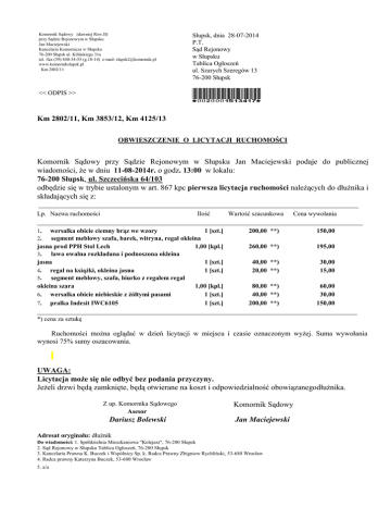 Komornik Sądowy (dawniej Rew.II) przy Sądzie Rejonowym w Słupsku Jan Maciejewski Kancelaria Komornicza w Słupsku 76-200 Słupsk ul. Kilińskiego 31a tel. /fax (59) 840-34-55 (g.10-14) e-mail: [email protected] www.komornikslupsk.pl Km 2802/11 Słupsk, dnia 28-07-2014 P.T. Sąd Rejonowy w Słupsku Tablica Ogłoszeń ul. Szarych Szeregów 13 76-200 Słupsk << ODPIS >> *0020001513417* Km 2802/11, Km 3853/12, Km 4125/13 OBWIESZCZENIE O LICYTACJI RUCHOMOŚCI Komornik Sądowy przy Sądzie Rejonowym w Słupsku Jan Maciejewski podaje do publicznej wiadomości, że w dniu 11-08-2014r. o godz. 13:00 w lokalu: 76-200 Słupsk, ul. Szczecińska 64/103 odbędzie się w trybie ustalonym w art. 867 kpc pierwsza licytacja ruchomości należących do dłużnika i składających się z: _______________________________________________________________________________________________________________________ Lp. Nazwa ruchomości Ilość Wartość szacunkowa Cena wywołania _________________________________________________________________________________________________________________________ 1. 2. wersalka obicie ciemny brąz we wzory 1 [szt.] segment meblowy szafa, barek, witryna, regał okleina jasna prod PPH Stol Lech 1,00 [kpl.] 3. ława owalna rozkładana i podnoszona okleina jasna 1 [szt.] 4. regal na książki, okleina jasna 1 [szt.] 5. segment meblowy, szafa, biurko z regałem regał okleina szara 1,00 [kpl.] 6. wersalka obicie niebieskie z żółtymi pasami 1 [szt.] 7. pralka Indesit IWC6105 1 [szt.] 200,00 **) 150,00 260,00 **) 195,00 40,00 **) 20,00 **) 30,00 15,00 80,00 **) 40,00 **) 200,00 **) 60,00 30,00 150,00 _______________________________________________________________________________________________________________________ *) cena za sztukę Ruchomości można oglądać w dzień licytacji w miejscu i czasie oznaczonym wyżej. Suma wywołania wynosi 75% sumy oszacowania. UWAGA: Licytacja może się nie odbyć bez podania przyczyny. Jeżeli drzwi będą zamknięte, będą otwierane na koszt i odpowiedzialność obowiązanegodłużnika. Z up. Komornika Sądowego Asesor Dariusz Bolewski Komornik Sądowy Jan Maciejewski Adresat oryginału: dłużnik Do wiadomości: 1. Spółdzielnia Mieszkaniowa "Kolejarz", 76-200 Słupsk 2. Sąd Rejonowy w Słupsku Tablica Ogłoszeń, 76-200 Słupsk 3. Kancelaria Prawna K. Buczek i Wspólnicy Sp. k. Radca Prawny Zbigniew Rychliński, 53-680 Wrocław 4. Radca prawny Katarzyna Buczek, 53-680 Wrocław 5. a/a