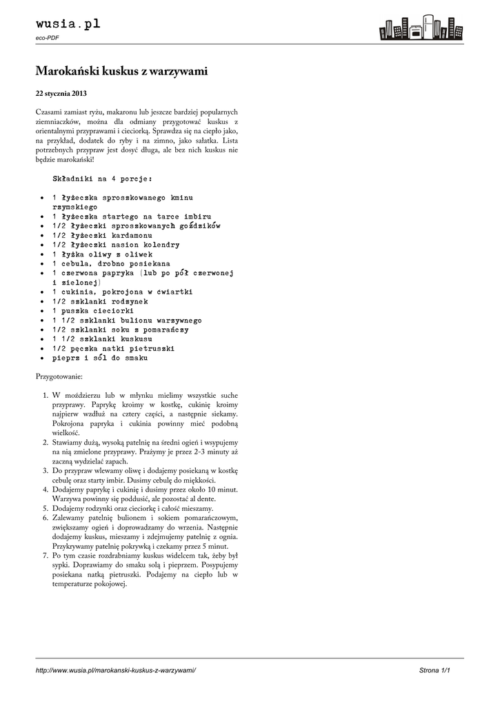 Powered by TCPDF (www.tcpdf.org) wusia.pl eco-PDF Marokański kuskus z warzywami 22 stycznia 2013 Czasami zamiast ryżu, makaronu lub jeszcze bardziej popularnych ziemniaczków, można dla odmiany przygotować kuskus z orientalnymi przyprawami i cieciorką. Sprawdza się na ciepło jako, na przykład, dodatek do ryby i na zimno, jako sałatka. Lista potrzebnych przypraw jest dosyć długa, ale bez nich kuskus nie będzie marokański! Składniki na 4 porcje: 1 łyżeczka sproszkowanego kminu rzymskiego 1 łyżeczka startego na tarce imbiru 1/2 łyżeczki sproszkowanych goździków 1/2 łyżeczki kardamonu 1/2 łyżeczki nasion kolendry 1 łyżka oliwy z oliwek 1 cebula, drobno posiekana 1 czerwona papryka (lub po pół czerwonej i zielonej) 1 cukinia, pokrojona w ćwiartki 1/2 szklanki rodzynek 1 puszka cieciorki 1 1/2 szklanki bulionu warzywnego 1/2 szklanki soku z pomarańczy 1 1/2 szklanki kuskusu 1/2 pęczka natki pietruszki pieprz i sól do smaku Przygotowanie: 1. W moździerzu lub w młynku mielimy wszystkie suche przyprawy. Paprykę kroimy w kostkę, cukinię kroimy najpierw wzdłuż na cztery części, a następnie siekamy. Pokrojona papryka i cukinia powinny mieć podobną wielkość. 2. Stawiamy dużą, wysoką patelnię na średni ogień i wsypujemy na nią zmielone przyprawy. Prażymy je przez 2-3 minuty aż zaczną wydzielać zapach. 3. Do przypraw wlewamy oliwę i dodajemy posiekaną w kostkę cebulę oraz starty imbir. Dusimy cebulę do miękkości. 4. Dodajemy paprykę i cukinię i dusimy przez około 10 minut. Warzywa powinny się poddusić, ale pozostać al dente. 5. Dodajemy rodzynki oraz cieciorkę i całość mieszamy. 6. Zalewamy patelnię bulionem i sokiem pomarańczowym, zwiększamy ogień i doprowadzamy do wrzenia. Następnie dodajemy kuskus, mieszamy i zdejmujemy patelnię z ognia. Przykrywamy patelnię pokrywką i czekamy przez 5 minut. 7. Po tym czasie rozdrabniamy kuskus widelcem tak, żeby był sypki. Doprawiamy do smaku solą i pieprzem. Posypujemy posiekana natką pietruszki. Podajemy na ciepło lub w temperaturze pokojowej. http://www.wusia.pl/marokanski-kuskus-z-warzywami/ Strona 1/1