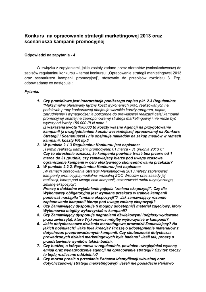 Konkurs na opracowanie strategii marketingowej 2013 oraz scenariusza kampanii promocyjnej Odpowiedzi na zapytania - 4 W związku z zapytaniami, jakie zostały zadane przez oferentów (wnioskodawców) do zapisów regulaminu konkursu – temat konkursu: „Opracowanie strategii marketingowej 2013 oraz scenariusza kampanii promocyjnej”, stosownie do przepisów rozdziału 3. Pzp, odpowiadamy co następuje : Pytania: 1. Czy prawidłowa jest interpretacja poniższego zapisu pkt. 2.3 Regulaminu: "Maksymalny planowany łączny koszt wykonanych prac, realizowanych na podstawie pracy konkursowej obejmuje wszelkie koszty /program, najem, zatrudnienie/ i wynagrodzenia potrzebne do prawidłowej realizacji całej kampanii promocyjnej opartej na zaproponowanej strategii marketingowej i nie może być wyższy od kwoty 150 000 PLN netto." iż wskazana kwota 150.000 to koszty własne Agencji na przygotowanie kampanii (z uwzględnieniem kosztu wcześniejszej opracowanej na Konkurs Strategii i Scenariusza) i nie obejmuje nakładów na zakup mediów w ramach kampanii, koszty PR itp.? 2. W punkcie 2.1.3 Regulaminu Konkursu jest napisane: „Termin realizacji kampanii promocyjnej: 01 marca - 31 grudnia 2013 r.” Czy to określenie oznacza, że kampania powinna trwać bez przerw od 1 marca do 31 grudnia, czy zamawiający bierze pod uwagę czasowe ograniczenie kampanii w celu efektywnego skoncentrowania przekazu? 3. W punkcie 2.2.2. Regulaminu Konkursu jest napisane: „W ramach opracowania Strategii Marketingowej 2013 należy zaplanować kampanię promocyjną medialno- wizualną ZOO Wrocław oraz zasady jej realizacji, biorąc pod uwagę cele kampanii, sezonowość ruchu turystycznego, zmianę ekspozycji”. Proszę o dokładne wyjaśnienie pojęcia "zmiana ekspozycji". Czy dla Wykonawcy obligatoryjna jest wymiana przekazu w trakcie kampanii ponieważ nastąpiła "zmiana ekspozycji"? Jak zamawiający rozumie zaplanowanie kampanii biorąc pod uwagę zmianę ekspozycji? 4. Czy Zamawiający dysponuje (i mógłby udostępnić) materiał zdjęciowy, który Wykonawca mógłby wykorzystać w kampanii? 5. Czy Zamawiający dysponuje nagraniami dźwiękowymi (odgłosy wydawane przez zwierzęta), które Wykonawca mógłby wykorzystać w kampanii? 6. Jakie dotychczasowe działania marketingowe prowadził Zamawiający? Na jakich nośnikach? Jaka była kreacja? Proszę o udostępnienie materiałów z dotychczas przeprowadzonych kampanii. Czy skuteczność dotychczas prowadzonych działań marketingowych była badana? Jeśli tak, proszę o przedstawienie wyników takich badań. 7. Czy budżet, o którym mowa w regulaminie, powinien uwzględniać wycenę emisji oraz wynagrodzenie agencji na opracowanie strategii? Czy też rzeczy te będą rozliczane oddzielnie? 8. Czy można prosić o przesłanie Państwa identyfikacji wizualnej oraz dotychczasowej strategii marketingowej? Jeżeli nie posiadacie Państwo takiej strategii to czy można prosić o krótki opis tego, jak do tej pory komunikowaliście się Państwo z mediami i odwiedzającymi, jakie akcje promocyjne i działania marketingowe były dotychczas realizowane przez ZOO? Jakimi hasłami promocyjnymi posługiwaliście się w komunikacji? 9. Czy można prosić o wydłużenie terminu pomiędzy akceptacją wniosków a składaniem ofert konkursowych? 10. Co stanowi unikalną wartość/atut ZOO na tle innych ogrodów zoologicznych? 11. Jakiego typu atrakcje czekają na odwiedzających ZOO? Czy są jakieś atrakcje, których nie ma w innym ogrodzie zoologicznym w Polsce? Odpowiedzi: 1. Odpowiedź na pytanie brzmi: Interpretacja jest nieprawidłowa. Podana kwota ma obejmować wszystkie zaproponowane przez oferenta działania, w tym zakup mediów itp. 2. Odpowiedź na pytanie brzmi: Najważniejszy jest efekt kampanii, dlatego decyzję o rozłożeniu w czasie działań z nią związanych pozostawiamy oferentom. 3. Odpowiedź na pytanie brzmi: Zmiana ekspozycji odnosi się głównie do przyjazdu nowych gatunków zwierząt, jak i otwarcia nowych/wyremontowanych obiektów. Pojawienie się ciekawego zwierzęcia przyciąga zwiedzających do ogrodu. W tym roku, powinno odbyć się otwarcie ekspozycji okapi, waranów, gepardów, głównego wejścia (po remoncie), rozpoczęcie budowy Odrarium 4. Odpowiedź na pytanie brzmi: Istnieje możliwość udostępnienia zdjęć, jednak ich jakość i walory estetyczne mogą nie spełnić wymogów odnoszących się do druków wielkoformatowych i innych publikacji. 5. Odpowiedź na pytanie brzmi: Zamawiający nie posiada nagrań dźwiękowych (odgłosy wydawane przez zwierzęta), które mógłby udostępnić Wykonawcy. 6. Odpowiedź na pytanie brzmi: Do chwili obecnej działaniami marketingowymi zajmowała się sekcja marketingu i edukacji ZOO Wrocław. PRZYKŁADOWE DZIAŁANIA REKLAMOWE Billboardy, banery, plakaty w ramkach MPK, artykuły sponsorowane, reklama radiowa, reklama w prasie PR: Współpraca z mediami, przede wszystkim: Gazeta Wrocławska, Gazeta Wyborcza, Wrocławianin, , TVP Wrocław, TVN, TVN24, ESKA, RMF Maxxx, Traffic, Złote Przeboje, tuWrocław.com, mmwrocław.pl, wroclaw.pl, naszemiasto.pl, czaszdziecmi.pl, PAP Patronat: Polskie Radio Wrocław WSPÓŁPRACA: Port Lotniczy Wrocław , Aquapark, Teatr Lalek, Teatr Capitol, Stadion Miejski, Hala Stulecia i Centrum Poznawcze, Humanitarium, MPK Wrocław. AMBIENT MARKETING Przyjazd lemurów do Wrocławia, przed otwarciem pawilonu Madagaskar (2010, http://www.facebook.com/photo.php?fbid=389081169718&set=a.293945954718. 14212 4.246397639718&type=1&theater) Powrót pancernych gigantów w związku z otwarciem pawilonu Terai (2012, http://www.facebook.com/photo.php?fbid=10151132308649719&set=a.29394595 4718 .142124.246397639718&type=1&theater http://www.facebook.com/photo.php?fbid=10151132308649719&set=a.29394595 4718. 142124.246397639718&type=1&theater, http://www.facebook.com/photo.php?fbid=10151151893229719&set=a.29394595 4718. 142124.246397639718&type=1&theater) Materiały nie zostaną ud