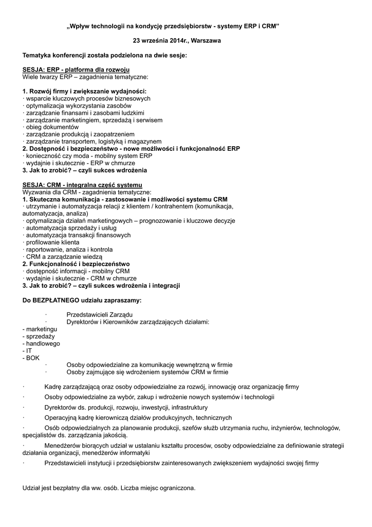 „Wpływ technologii na kondycję przedsiębiorstw - systemy ERP i CRM” 23 września 2014r., Warszawa Tematyka konferencji została podzielona na dwie sesje: SESJA: ERP - platforma dla rozwoju Wiele twarzy ERP – zagadnienia tematyczne: 1. Rozwój firmy i zwiększanie wydajności: · wsparcie kluczowych procesów biznesowych · optymalizacja wykorzystania zasobów · zarządzanie finansami i zasobami ludzkimi · zarządzanie marketingiem, sprzedażą i serwisem · obieg dokumentów · zarządzanie produkcją i zaopatrzeniem · zarządzanie transportem, logistyką i magazynem 2. Dostępność i bezpieczeństwo - nowe możliwości i funkcjonalność ERP · konieczność czy moda - mobilny system ERP · wydajnie i skutecznie - ERP w chmurze 3. Jak to zrobić? – czyli sukces wdrożenia SESJA: CRM - integralna część systemu Wyzwania dla CRM - zagadnienia tematyczne: 1. Skuteczna komunikacja - zastosowanie i możliwości systemu CRM · utrzymanie i automatyzacja relacji z klientem / kontrahentem (komunikacja, automatyzacja, analiza) · optymalizacja działań marketingowych – prognozowanie i kluczowe decyzje · automatyzacja sprzedaży i usług · automatyzacja transakcji finansowych · profilowanie klienta · raportowanie, analiza i kontrola · CRM a zarządzanie wiedzą 2. Funkcjonalność i bezpieczeństwo · dostępność informacji - mobilny CRM · wydajnie i skutecznie - CRM w chmurze 3. Jak to zrobić? – czyli sukces wdrożenia i integracji Do BEZPŁATNEGO udziału zapraszamy: · · - marketingu - sprzedaży - handlowego - IT - BOK · · Przedstawicieli Zarządu Dyrektorów i Kierowników zarządzających działami: Osoby odpowiedzialne za komunikację wewnętrzną w firmie Osoby zajmujące się wdrożeniem systemów CRM w firmie · Kadrę zarządzającą oraz osoby odpowiedzialne za rozwój, innowację oraz organizację firmy · Osoby odpowiedzialne za wybór, zakup i wdrożenie nowych systemów i technologii · Dyrektorów ds. produkcji, rozwoju, inwestycji, infrastruktury · Operacyjną kadrę kierowniczą działów produkcyjnych, technicznych · Osób odpowiedzialnych za planowanie produkcji, szefów służb utrzymania ruchu, inżynierów, technologów, specjalistów ds. zarządzania jakością. · Menedżerów biorących udział w ustalaniu kształtu procesów, osoby odpowiedzialne za definiowanie strategii działania organizacji, menedżerów informatyki · Przedstawicieli instytucji i przedsiębiorstw zainteresowanych zwiększeniem wydajności swojej firmy Udział jest bezpłatny dla ww. osób. Liczba miejsc ograniczona.