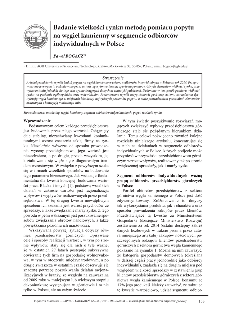 Badanie wielkości rynku metodą pomiaru popytu na węgiel kamienny w segmencie odbiorców indywidualnych w Polsce Paweł BOGACZ1) 1) Dr inż.; AGH University of Science and Technology, Kraków, Mickiewicza 30, 30-059, Poland; email: [email protected] Streszczenie Artykuł przedstawia wyniki badań popytu na węgiel kamienny w sektorze odbiorców indywidualnych w Polsce za rok 2014. Przeprowadzono je w oparciu o zbudowany przez autora algorytm badawczy, oparty na pomiarze różnych elementów wielkości rynku, przy wykorzystaniu jednakże do tego celu ogólnodostępnych danych ze statystyki publicznej. Dokonano w ten sposób pomiaru wielkości rynku na poziomie ogólnopolskim oraz wojewódzkim. Prezentowane wyniki mogą stanowić podstawę systemu zarządzania dystrybucją węgla kamiennego w miejscach lokalizacji najwyższych poziomów popytu, a także prowadzeniem pozostałych elementów związanych z koncepcją marketingu-mix. Słowa kluczowe: marketing, węgiel kamienny, segment odbiorców indywidualnych, popyt, wielkość rynku Wprowadzenie Podstawowym celem każdego przedsiębiorstwa jest budowanie przez niego wartości. Osiągnięty daje stabilny, niezachwiany kwestiami koniunkturalnymi wzrost znaczenia takiej firmy na rynku. Niezależnie wówczas od sposobu prowadzenia wyceny przedsiębiorstwa, jego wartość jest niezachwiana, a po drugie, przede wszystkim, jej kształtowanie się wiąże się z długotrwałym trendem wzrostowym. W związku z powyższym szuka się w firmach wszelkich sposobów na budowanie tego parametru biznesowego. Jak wskazuje fundamentalna dla kwestii koncepcji budowania wartości praca Blacka i innych [1], podstawą wszelkich działań w zakresie wartości jest racjonalizacja wpływów i wypływów realizowanych przez przedsiębiorstwa. W tej drugiej kwestii niewątpliwym sposobem ich szukania jest wzrost przychodów ze sprzedaży, a także zwiększanie marży zysku. Z tego powodu w pełni wskazanym jest poszukiwanie sposobów zwiększania obrotów handlowych, a także powiększania poziomu ich marżowości. Wskazywana powyżej sytuacja dotyczy również przedsiębiorstw górniczych. Opisywane cele i sposoby realizacji wartości, w tym po stronie wpływów, stały się dla nich o tyle ważne, że w ostatnich 27 latach postępuje sukcesywne otwieranie tych firm na gospodarkę wolnorynkową, w tym w otoczeniu międzynarodowym, a po drugie zwłaszcza w ostatnim czasie obserwuje się znaczną potrzebę poszukiwania działań racjonalizacyjnych w branży, ze względu na zauważalną od 2009 roku w mniejszym lub większym stopniu dekoniunkturę występująca w górnictwie i to nie tylko w Polsce, ale na całym świecie. W tym świetle poszukiwanie rozwiązań mogących zwiększyć wpływy przedsiębiorstwa górniczego staje się pożądanym kierunkiem działania. Temu celowi poświęcono również kolejne rozdziały niniejszego artykułu, koncentrując się w nich na działaniach w segmencie odbiorców indywidualnych w Polsce, których podjęcie może przynieść w przyszłości przedsiębiorstwom górniczym wzrost wpływów, realizowany tak po stronie zwiększonej sprzedaży, jak i marży zysku. Segment odbiorców indywidualnych ważną grupą odbiorców przedsiębiorstw górniczych w Polsce Portfel obiorców przedsiębiorstw z sektora górnictwa węgla kamiennego w Polsce jest dość zdywersyfikowany. Zróżnicowanie to dotyczy tak wykorzystania produktu, jak i charakteru oraz sposobu prowadzenia zakupów przez klientów. Przedstawiające tą kwestię za Ministerstwem Gospodarki (dzisiejsze Ministerstwo Rozwoju) zestawienie za rok 2014 (ostatni dostępny zakres danych liczbowych w trakcie pisania przez autora niniejszego artykułu) zakupów ilościowych poszczególnych rodzajów klientów przedsiębiorstw górniczych z sektora górnictwa węgla kamiennego pokazano na rysunku 1. Można na nim zauważyć, że kategoria gospodarstw domowych (określana w dalszej części pracy jednorodnie jako odbiorcy indywidualni), znalazła się na drugim miejscu pod względem wielkości sprzedaży w zestawieniu grup klientów przedsiębiorstw górniczych z sektora górnictwa węgla kamiennego w Polsce, konsumując 17% jego produkcji. Należy zauważyć, że traktując tę kwestię wartościowo, udział segmentu odbior- Inżynieria Mineralna — LIPIEC – GRUDZIEŃ <2016> JULY – DECEMBER — Journal of the Polish Mineral Engineering Society 153 Rys. 1. Struktura ilościowa odbiorców węgla kamiennego w Polsce w roku 2014 [%] Źródło: Opracowane własne na podstawie raportu Zużycie paliw i nośników energii 2014 [2] Fig. 1. The quantitative structure of consumers of hard coal in Poland in 2014 [%]. Source: Own calculations based on the report “Consumption of fuels and energy carriers in 2014” [2] Rys. 2. Struktura ilościowa odbiorców węgla kamiennego w Polsce w roku 2014 [%] Źródło: Opracowane własne na podstawie raportu Zużycie paliw i nośników energii 2014 [2] Fig. 2. The value structure of consumers of hard coal in Poland in 2014 [%] Source: Own calculations based on the report “Consumption of fuels and energy carriers in 2014” [2] ców indywidualnych w rynku węgla kamiennego w Polsce jest jeszcze większy, co pokazano na rysunku 2, wzrastając w tym ujęciu do 23%. Powyższa różnica wynika z faktu, że w segmencie tym występują wyższe ceny sprzedaży, niż w segmentach pozostałych, co powoduje możliwość generowania przez firmy górnicze wyższych marż zysku, niż w innych częściach rynku. W ujęciu funkcji celu opisywanej we Wprowadzeniu, to jak najbardziej wskazany kierunek. Jak wynika już z powyższych danych wartościowych, segment odbiorców indywidualnych powinien być niezwykle ważny dla przedsiębiorstwa górniczego. Poza powyższymi danymi wiąże się to również z innym, wizerunkowym powodem. Odbiorcy indywidualni są bowiem najbardziej 154 opiniotwórczą grupą klientów przedsiębiorstw górniczych, decydując poprzez sw