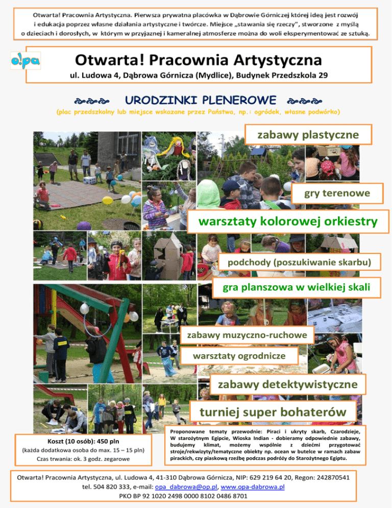 Otwarta! Pracownia Artystyczna ul. Ludowa 4, Dąbrowa Górnicza (Mydlice), Budynek Przedszkola 29 URODZINKI PLENEROWE (plac przedszkolny lub miejsce wskazane przez Państwa, np.: ogródek, własne podwórko) zabawy plastyczne gry terenowe warsztaty kolorowej orkiestry podchody (poszukiwanie skarbu) gra planszowa w wielkiej skali zabawy muzyczno-ruchowe warsztaty ogrodnicze zabawy detektywistyczne turniej super bohaterów Koszt (10 osób): 450 pln (każda dodatkowa osoba do max. 15 – 15 pln) Czas trwania: ok. 3 godz. zegarowe Proponowane tematy przewodnie: Piraci i ukryty skarb, Czarodzieje, W starożytnym Egipcie, Wioska Indian - dobieramy odpowiednie zabawy, budujemy klimat, możemy wspólnie z dziećmi przygotować stroje/rekwizyty/tematyczne obiekty np. ocean w butelce w ramach zabaw pirackich, czy piaskową rzeźbę podczas podróży do Starożytnego Egiptu. Otwarta! Pracownia Artystyczna, ul. Ludowa 4, 41-310 Dąbrowa Górnicza, NIP: 629 219 64 20, Regon: 242870541 tel. 504 820 333, e-mail: [email protected], www.opa-dabrowa.pl PKO BP 92 1020 2498 0000 8102 0486 8701