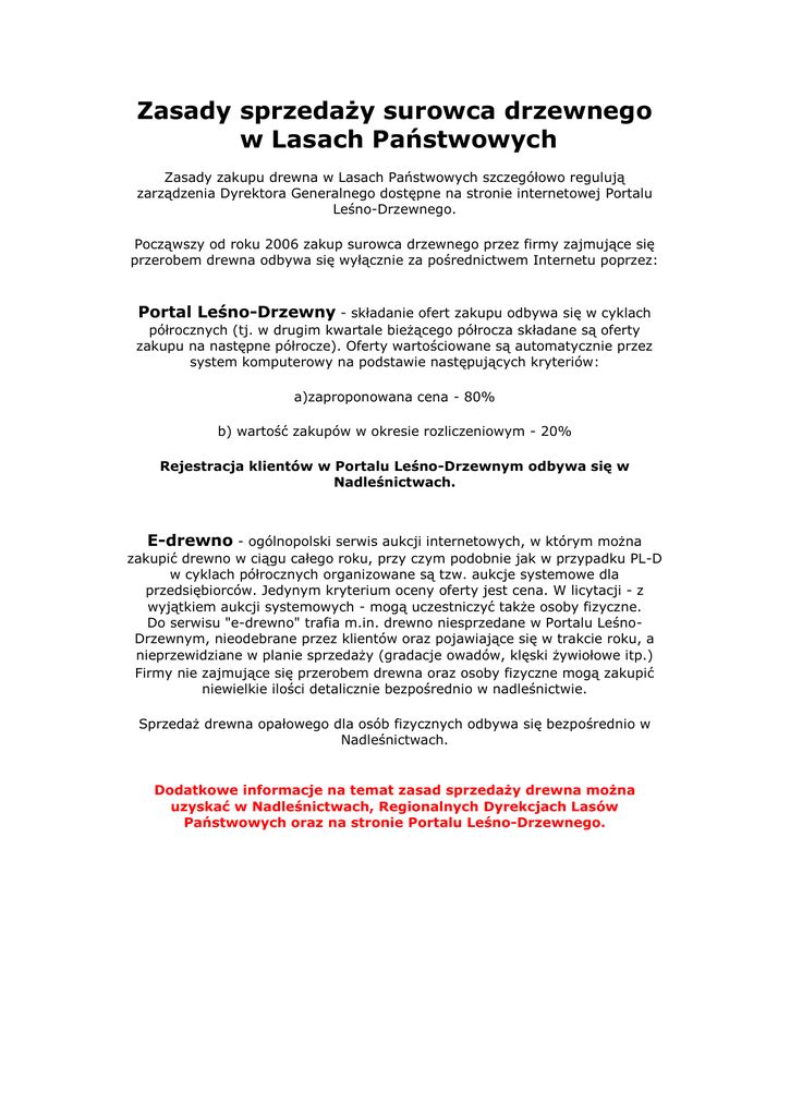 Zasady sprzedaży surowca drzewnego w Lasach Państwowych Zasady zakupu drewna w Lasach Państwowych szczegółowo regulują zarządzenia Dyrektora Generalnego dostępne na stronie internetowej Portalu Leśno-Drzewnego. Począwszy od roku 2006 zakup surowca drzewnego przez firmy zajmujące się przerobem drewna odbywa się wyłącznie za pośrednictwem Internetu poprzez: Portal Leśno-Drzewny - składanie ofert zakupu odbywa się w cyklach półrocznych (tj. w drugim kwartale bieżącego półrocza składane są oferty zakupu na następne półrocze). Oferty wartościowane są automatycznie przez system komputerowy na podstawie następujących kryteriów: a)zaproponowana cena - 80% b) wartość zakupów w okresie rozliczeniowym - 20% Rejestracja klientów w Portalu Leśno-Drzewnym odbywa się w Nadleśnictwach. E-drewno - ogólnopolski serwis aukcji internetowych, w którym można zakupić drewno w ciągu całego roku, przy czym podobnie jak w przypadku PL-D w cyklach półrocznych organizowane są tzw. aukcje systemowe dla przedsiębiorców. Jedynym kryterium oceny oferty jest cena. W licytacji - z wyjątkiem aukcji systemowych - mogą uczestniczyć także osoby fizyczne. Do serwisu "e-drewno" trafia m.in. drewno niesprzedane w Portalu LeśnoDrzewnym, nieodebrane przez klientów oraz pojawiające się w trakcie roku, a nieprzewidziane w planie sprzedaży (gradacje owadów, klęski żywiołowe itp.) Firmy nie zajmujące się przerobem drewna oraz osoby fizyczne mogą zakupić niewielkie ilości detalicznie bezpośrednio w nadleśnictwie. Sprzedaż drewna opałowego dla osób fizycznych odbywa się bezpośrednio w Nadleśnictwach. Dodatkowe informacje na temat zasad sprzedaży drewna można uzyskać w Nadleśnictwach, Regionalnych Dyrekcjach Lasów Państwowych oraz na stronie Portalu Leśno-Drzewnego.