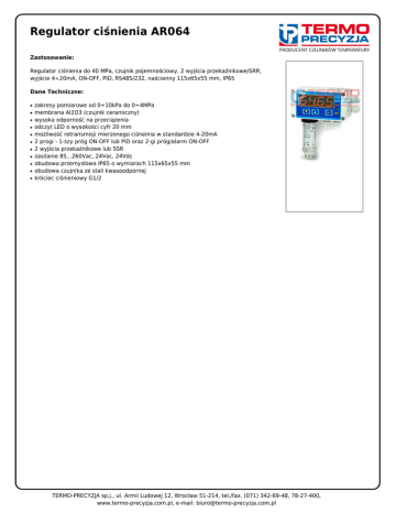 Regulator ciśnienia AR064 Zastosowanie: Regulator ciśnienia do 40 MPa, czujnik pojemnościowy, 2 wyjścia przekaźnikowe/SRR, wyjście 4÷20mA, ON-OFF, PID, RS485/232, naścienny 115x65x55 mm, IP65 Dane Techniczne: ● ● ● ● ● ● ● ● ● ● ● zakresy pomiarowe od 0÷10kPa do 0÷4MPa membrana Al2O3 (czujnik ceramiczny) wysoka odporność na przeciążenia odczyt LED o wysokości cyfr 20 mm możliwość retransmisji mierzonego ciśneinia w standardzie 4-20mA 2 progi - 1-szy próg ON-OFF lub PID oraz 2-gi próg/alarm ON-OFF 2 wyjścia przekaźnikowe lub SSR zasilanie 85...260Vac, 24Vac, 24Vdc obudowa przemysłowa IP65 o wymiarach 115x65x55 mm obudowa czujnika ze stali kwasoodpornej króciec ciśnieniowy G1/2 TERMO-PRECYZJA sp.j., ul. Armii Ludowej 12, Wrocław 51-214, tel./fax. (071) 342-69-48, 78-27-400, www.termo-precyzja.com.pl, e-mail: [email protected]