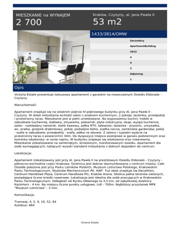 MIESZKANIE na WYNAJEM 2 700 Kraków, Czyżyny, al. Jana Pawła II 53 m2 1433/3814/OMW Secondary ApartmentBuilding 2015 4 4 3 Adjoining 1 Opis Victoria Estate prezentuje luksusowy apartament z garażem na nowoczesnym Osiedlu Eldorado Czyżyny. Nieruchomość: Apartament znajduje się na ostatnim piętrze IV-piętrowego budynku przy Al. Jana Pawła II Czyżyny. W skład mieszkania wchodzi salon z aneksem kuchennym, 2 pokoje, łazienka, przedpokój i przestronny taras. Mieszkanie jest w pełni umeblowane. Na wyposażeniu kuchni: meble w zabudowie kuchennej, lodówka, zmywarka, piekarnik, płyta indukcyjna, okap, wyspa kuchenna; salon - rozkładany narożnik, stolik kawowy, półka RTV, telewizor; łazienka - prysznic, umywalka, wc, pralka, grzejnik drabinkowy; pokój: podwójne łóżko, szafka nocna, zamknieta garderoba; pokój - szafa w zabudowie; przedpokój - szafa, półka na obuwie. Z salonu i sypialni wyjście na przestronny taras o powierzchni 34m. Do dyspozycji miejsce postojowe w garażu podziemnym oraz komórka lokatorska- w cenie najmu. W budynku znajduje się wózkownia oraz rowerownia. Mieszkanie zlokalizowane na zamkniętym, strzeżonym, monitorowanym osiedlu. Apartament dla osób wymagających, lubiących wysoki standard mieszkania z dobrym dojazdem do centrum. Lokalizacja: Apartament zlokalizowany jest przy Al. Jana Pawła II na prestiżowym Osiedlu Eldorado - Czyżyny północno-wschodnia części Krakowa. Dzielnica jest dobrze skomunikowana z centrum miasta. Całe Osiedle położone jest przy Parku Lotników Polskich, Muzeum Lotnictwa Polskiego, Krakowskim Parku Technologicznym, Wydziale Mechanicznym PK, AWF. Tuż obok znajduje się Decathlon, Centrum Handlowe Plaza, Centrum Handlowe M1, Kraków Arena. Okolica pełna terenów zielonych, posiadająca liczne ścieżki rowerowe. Lokalizacja jest idealna dla osób pracujących w Krakowskim Parku Technologicznym. Odległość od Rynku Głównego to 4,5 km, od zabytkowej dzielnicy Kazimierz - 4 km. Na miejscu liczne punkty usługowe, Lidl - 700m. Najbliższy przystanek MPK "Muzeum Lotnictwa" - 3 min. Komunikacja: Tramwaj: 4, 5, 9, 10, 52, 64 Autobus: 664 Victoria Estate Opłaty: 2700 zł najem + 600 zł opłaty. Serdecznie polecam! Natalia Sujdak tel. +48 516 547 102 email: [email protected] Victoria Estate Powered by TCPDF (www.tcpdf.org)