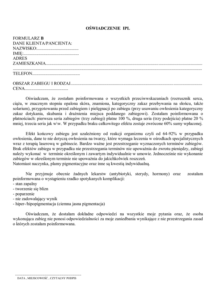 OŚWIADCZENIE IPL FORMULARZ B DANE KLIENTA/PANCJENTA: NAZWISKO:...................................... IMIĘ:................................................... ADRES ZAMIESZKANIA................................................................................................................................................ .............................................................................................................................................................................. TELEFON............................................ OBSZAR ZABIEGU I RODZAJ......................................................................................................................... CENA........................................ Oświadczam, że zostałam poinformowana o wszystkich przeciwwskazaniach (rozrusznik serca, ciąża, w znacznym stopniu opalona skóra, znamiona, kategoryczny zakaz przebywania na słońcu, także solarium), przygotowaniu przed zabiegiem i pielęgnacji po zabiegu (przy usuwaniu owłosienia kategoryczny zakaz dotykania, skubania i drażnienia miejsca poddanego zabiegowi). Zostałam poinformowana o płatnościach: pierwsza seria zabiegów (trzy zabiegi) płatne 100 %, druga seria (trzy podejścia) płatne 20 % mniej, trzecia seria jak w\w. W przypadku braku całkowitego efektu zostaje zwrócone 60% sumy wpłaconej. Efekt końcowy zabiegu jest uzależniony od reakcji organizmu czyli od 64-92% w przypadku owłosienia, dane te nie dotyczą owłosienia na twarzy, które wymaga leczenia w ośrodkach specjalistycznych wraz z terapią laserową w gabinecie. Bardzo ważne jest przestrzeganie wyznaczonych terminów zabiegów. Brak efektów zabiegu w przypadku nie przestrzegania terminów nie upoważnia do zwrotu pieniędzy, zabiegi należy wykonać w terminie określonym i zawartym indywidualnie w umowie. Jednocześnie nie wykonanie zabiegów w określonym terminie nie upoważnia do jakichkolwiek roszczeń. Natomiast naczynka, plamy pigmentacyjne oraz inne są kwestią indywidualną. Nie przyjmuje obecnie żadnych lekarstw (antybiotyki, sterydy, hormony) oraz poinformowana o wystąpieniu rzadko spotykanych komplikacji: - stan zapalny - tworzenie się blizn - poparzenie - nie zadowalający wynik - hiper-/hipopigmentacja (ciemna jasna pigmentacja) zostałam Oświadczam, że dostałam dokładne odpowiedzi na wszystkie moje pytania oraz, że osoba wykonująca zabieg nie ponosi odpowiedzialności za moje zaniedbania wynikające z nie przestrzegania zasad o których zostałam poinformowana. ............................................................. DATA , MIEJSCOWOŚĆ , CZYTALNY PODPIS