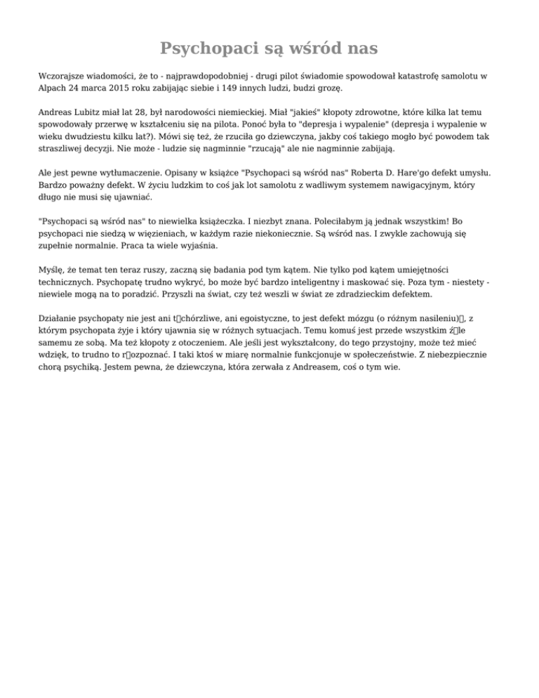 Psychopaci są wśród nas Wczorajsze wiadomości, że to - najprawdopodobniej - drugi pilot świadomie spowodował katastrofę samolotu w Alpach 24 marca 2015 roku zabijając siebie i 149 innych ludzi, budzi grozę. Andreas Lubitz miał lat 28, był narodowości niemieckiej. Miał "jakieś" kłopoty zdrowotne, które kilka lat temu spowodowały przerwę w kształceniu się na pilota. Ponoć była to "depresja i wypalenie" (depresja i wypalenie w wieku dwudziestu kilku lat?). Mówi się też, że rzuciła go dziewczyna, jakby coś takiego mogło być powodem tak straszliwej decyzji. Nie może - ludzie się nagminnie "rzucają" ale nie nagminnie zabijają. Ale jest pewne wytłumaczenie. Opisany w książce "Psychopaci są wśród nas" Roberta D. Hare'go defekt umysłu. Bardzo poważny defekt. W życiu ludzkim to coś jak lot samolotu z wadliwym systemem nawigacyjnym, który długo nie musi się ujawniać. "Psychopaci są wśród nas" to niewielka książeczka. I niezbyt znana. Poleciłabym ją jednak wszystkim! Bo psychopaci nie siedzą w więzieniach, w każdym razie niekoniecznie. Są wśród nas. I zwykle zachowują się zupełnie normalnie. Praca ta wiele wyjaśnia. Myślę, że temat ten teraz ruszy, zaczną się badania pod tym kątem. Nie tylko pod kątem umiejętności technicznych. Psychopatę trudno wykryć, bo może być bardzo inteligentny i maskować się. Poza tym - niestety niewiele mogą na to poradzić. Przyszli na świat, czy też weszli w świat ze zdradzieckim defektem. Działanie psychopaty nie jest ani tchórzliwe, ani egoistyczne, to jest defekt mózgu (o różnym nasileniu), z którym psychopata żyje i który ujawnia się w różnych sytuacjach. Temu komuś jest przede wszystkim źle samemu ze sobą. Ma też kłopoty z otoczeniem. Ale jeśli jest wykształcony, do tego przystojny, może też mieć wdzięk, to trudno to rozpoznać. I taki ktoś w miarę normalnie funkcjonuje w społeczeństwie. Z niebezpiecznie chorą psychiką. Jestem pewna, że dziewczyna, która zerwała z Andreasem, coś o tym wie.