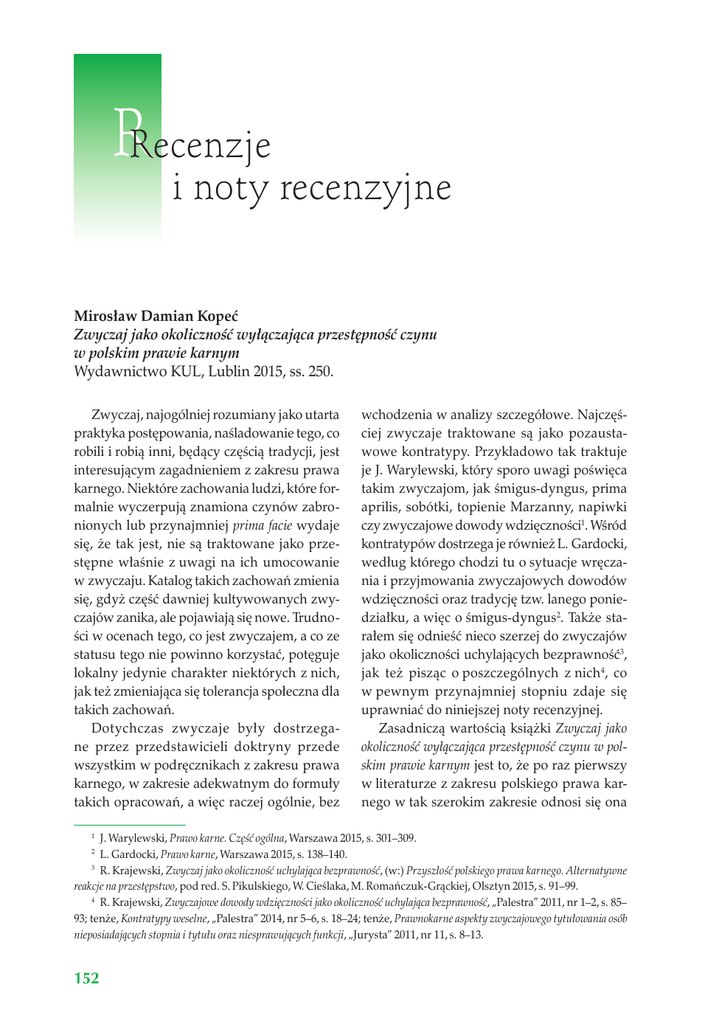 RRecenzje i noty recenzyjne Mirosław Damian Kopeć Zwyczaj jako okoliczność wyłączająca przestępność czynu w polskim prawie karnym Wydawnictwo KUL, Lublin 2015, ss. 250. Zwyczaj, najogólniej rozumiany jako utarta praktyka postępowania, naśladowanie tego, co robili i robią inni, będący częścią tradycji, jest interesującym zagadnieniem z zakresu prawa karnego. Niektóre zachowania ludzi, które formalnie wyczerpują znamiona czynów zabronionych lub przynajmniej prima facie wydaje się, że tak jest, nie są traktowane jako przestępne właśnie z uwagi na ich umocowanie w zwyczaju. Katalog takich zachowań zmienia się, gdyż część dawniej kultywowanych zwyczajów zanika, ale pojawiają się nowe. Trudności w ocenach tego, co jest zwyczajem, a co ze statusu tego nie powinno korzystać, potęguje lokalny jedynie charakter niektórych z nich, jak też zmieniająca się tolerancja społeczna dla takich zachowań. Dotychczas zwyczaje były dostrzegane przez przedstawicieli doktryny przede wszystkim w podręcznikach z zakresu prawa karnego, w zakresie adekwatnym do formuły takich opracowań, a więc raczej ogólnie, bez wchodzenia w analizy szczegółowe. Najczęściej zwyczaje traktowane są jako pozaustawowe kontratypy. Przykładowo tak traktuje je J. Warylewski, który sporo uwagi poświęca takim zwyczajom, jak śmigus-dyngus, prima aprilis, sobótki, topienie Marzanny, napiwki czy zwyczajowe dowody wdzięczności1. Wśród kontratypów dostrzega je również L. Gardocki, według którego chodzi tu o sytuacje wręczania i przyjmowania zwyczajowych dowodów wdzięczności oraz tradycję tzw. lanego poniedziałku, a więc o śmigus-dyngus2. Także starałem się odnieść nieco szerzej do zwyczajów jako okoliczności uchylających bezprawność3, jak też pisząc o poszczególnych z nich4, co w pewnym przynajmniej stopniu zdaje się uprawniać do niniejszej noty recenzyjnej. Zasadniczą wartością książki Zwyczaj jako okoliczność wyłączająca przestępność czynu w polskim prawie karnym jest to, że po raz pierwszy w literaturze z zakresu polskiego prawa karnego w tak szerokim zakresie odnosi się ona J. Warylewski, Prawo karne. Część ogólna, Warszawa 2015, s. 301–309. L. Gardocki, Prawo karne, Warszawa 2015, s. 138–140. 3 R. Krajewski, Zwyczaj jako okoliczność uchylająca bezprawność, (w:) Przyszłość polskiego prawa karnego. Alternatywne reakcje na przestępstwo, pod red. S. Pikulskiego, W. Cieślaka, M. Romańczuk-Grąckiej, Olsztyn 2015, s. 91–99. 4 R. Krajewski, Zwyczajowe dowody wdzięczności jako okoliczność uchylająca bezprawność, „Palestra” 2011, nr 1–2, s. 85– 93; tenże, Kontratypy weselne, „Palestra” 2014, nr 5–6, s. 18–24; tenże, Prawnokarne aspekty zwyczajowego tytułowania osób nieposiadających stopnia i tytułu oraz niesprawujących funkcji, „Jurysta” 2011, nr 11, s. 8–13. 1 2 152 6/2016 do zwyczajów jako okoliczności wyłączających przestępność czynu. Z uznaniem dla Autora przyjąć trzeba sam pomysł podjęcia tej problematyki, jak i jego realizację, przy pewnych drobnych zastrzeżeniach co do jej szczegółów. Książka składa się z czterech rozdziałów, które podzielone są na podrozdziały. W ramach niektórych z nich wyodrębniono jeszcze mniejsze jednostki redakcyjne. Ich kolejność jest jak najbardziej poprawna. W pierwszym z nich Autor wskazuje definicje zwyczaju, jak też omawia jego znaczenie w różnych dziedzinach prawa, tj. prawie konstytucyjnym, cywilnym, administracyjnym, międzynarodowym i karnym. Jest to bardzo trafne ujęcie, wskazujące rolę zwyczaju nie tylko w prawie karnym, ale że jest on ważny także w innych dziedzinach prawa, a więc że nie stanowi jakiejś specyfiki tylko prawa karnego. W rozdziale drugim M. D. Kopeć omawia poszczególne zwyczaje, tj. śmigus-dyngus, przywoływki dyngusowe, Siuda Baba, prima aprilis, sobótki, topienie Marzanny, Halloween, Dzień św. Mikołaja, Boże Narodzenie, Sylwester, Nowy Rok, Trzech Króli, karnawał, Wielki Post i Wielki Tydzień, dożynki, ślub i wesele, okolicznościowe dowody wdzięczności. Uczynił to z wykorzystaniem licznych prac etnograficznych oraz historycznych, starając się wskazać, znamiona jakich czynów zabronionych formalnie wyczerpują zachowania mieszczące się w tych zwyczajach. Ta część pracy stanowi bardzo cenne źródło wiedzy o zwyczajach jako takich, dalece wykraczającą poza prawo karne, choć oczywiście niezbędną dla jego postrzegania w kontekście zwyczajów jako okoliczności wyłączających przestępczość czynu. Rozdział trzeci, jak się wydaje zasadniczy, prezentuje poglądy przedstawicieli doktryny na zwyczaj jako okoliczność wyłączającą bezprawność czynu, jak też stanowi miejsce, w którym Autor poszukuje formuły uzasadnienia traktowania zwyczaju jako okoliczności wyłączającej przestępczość czynu, przy wskazaniu różnych, często rozległych, argumentów. Recenzje i noty recenzyjne Nie znajduje jej ani w traktowaniu zwyczaju jako odrębnego kontratypu pozaustawowego, gdyż zupełnie odrzuca taką koncepcję. Nie znajduje jej także w ujmowaniu zachowań motywowanych zwyczajowo, jako mieszczących się w stanie wyższej konieczności. M. D. Kopeć uważa też, że podstawą uchylenia odpowiedzialności osoby działającej w ramach zwyczaju nie może być zgoda uprawnionego traktowana jako kontratyp, jak też że nie można zwyczaju rozumieć jako kontratyp działania w ramach uprawnień i obowiązków. Prowadzi go to do wniosku, że zachowania wynikające ze zwyczajów są czynami pierwotnie legalnymi. Tezę tę Autor stara się dowieść w rozdziale czwartym. W tej części opracowania wytycza granice pierwotnej legalności zwyczaju, tj. granicę przedmiotową, kulturową oraz wyznaczoną stroną podmiotową. Argumenty te nie do końca przekonują, a to zapewne dlatego, że uważam, iż zwyczaje można i należy traktować jako pozaustawowe kont
