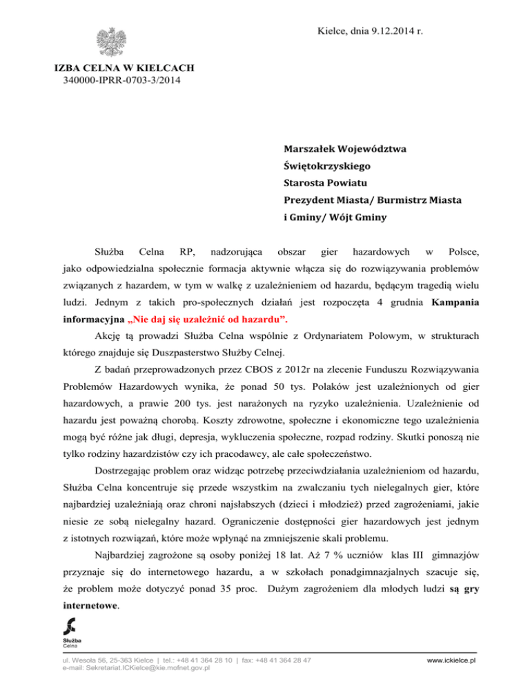 Kielce, dnia 9.12.2014 r. IZBA CELNA W KIELCACH 340000-IPRR-0703-3/2014 Marszałek Województwa Świętokrzyskiego Starosta Powiatu Prezydent Miasta/ Burmistrz Miasta i Gminy/ Wójt Gminy Służba Celna RP, nadzorująca obszar gier hazardowych w Polsce, jako odpowiedzialna społecznie formacja aktywnie włącza się do rozwiązywania problemów związanych z hazardem, w tym w walkę z uzależnieniem od hazardu, będącym tragedią wielu ludzi. Jednym z takich pro-społecznych działań jest rozpoczęta 4 grudnia Kampania informacyjna „Nie daj się uzależnić od hazardu”. Akcję tą prowadzi Służba Celna wspólnie z Ordynariatem Polowym, w strukturach którego znajduje się Duszpasterstwo Służby Celnej. Z badań przeprowadzonych przez CBOS z 2012r na zlecenie Funduszu Rozwiązywania Problemów Hazardowych wynika, że ponad 50 tys. Polaków jest uzależnionych od gier hazardowych, a prawie 200 tys. jest narażonych na ryzyko uzależnienia. Uzależnienie od hazardu jest poważną chorobą. Koszty zdrowotne, społeczne i ekonomiczne tego uzależnienia mogą być różne jak długi, depresja, wykluczenia społeczne, rozpad rodziny. Skutki ponoszą nie tylko rodziny hazardzistów czy ich pracodawcy, ale całe społeczeństwo. Dostrzegając problem oraz widząc potrzebę przeciwdziałania uzależnieniom od hazardu, Służba Celna koncentruje się przede wszystkim na zwalczaniu tych nielegalnych gier, które najbardziej uzależniają oraz chroni najsłabszych (dzieci i młodzież) przed zagrożeniami, jakie niesie ze sobą nielegalny hazard. Ograniczenie dostępności gier hazardowych jest jednym z istotnych rozwiązań, które może wpłynąć na zmniejszenie skali problemu. Najbardziej zagrożone są osoby poniżej 18 lat. Aż 7 % uczniów klas III gimnazjów przyznaje się do internetowego hazardu, a w szkołach ponadgimnazjalnych szacuje się, że problem może dotyczyć ponad 35 proc. Dużym zagrożeniem dla młodych ludzi są gry internetowe. ul. Wesoła 56, 25-363 Kielce | tel.: +48 41 364 28 10 | fax: +48 41 364 28 47 e-mail: [email protected] www.ickielce.pl Eksperci twierdzą, że hazard internetowy jest groźniejszy niż w swojej tradycyjnej postaci, chociażby ze wzgl. na pozorną anonimowość w sieci, łatwiejszy dostęp do kasyna ( bez wychodzenia z domu). Osoba grająca on- line nie ma bezpośredniego kontaktu z gotówką i może łatwo stracić kontrolę nad ilością zaangażowanych w grę pieniędzy. Gry na automatach oraz on-line bardzo silnie uzależniają i porównywane są do najcięższych uzależnień, a także nazywane są „kokainą hazardu”. Służba Celna zauważa nasilający się proceder nielegalnego e-hazardu. Zidentyfikowała ponad 1000 domen, na których były oferowane gry internetowe z naruszeniem prawa. W 230 przypadkach hostingodawcy już usunęli z nich niedozwolone treści lub uniemożliwili dostęp do zagranicznych serwisów hazardowych. Obecnie Służba Celna prowadzi postępowania w stosunku do 17 tys. graczy, uczestniczących w nielegalnych grach internetowych na zagranicznych serwerach. Podpisał: DYREKTOR IZBY CELNEJ w Kielcach /-/ podinsp. Piotr Walczak W załączeniu: e-plakat 2