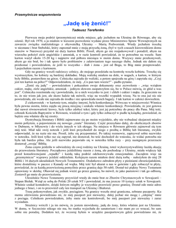 Przemytnicze wspomnienia „Jadę się Ŝenić!” Tadeusz Terefenko Pierwsza moja podróŜ (przemytnicza) miała miejsce, gdy jechałem na Ukrainę do Równego, aby się oŜenić. Był rok 1970, a ja miałem w kieszeni pozwolenie wydane przez Ministerstwo Spraw Wewnętrznych na zawarcie związku małŜeńskiego z obywatelką Ukrainy – Marią Podworniak. Wtedy jechałem troszkę w nieznane i brat Stebelski, który zapoznał mnie z moją przyszłą Ŝoną, (był w tych czasach kierownikiem domu starców w Narewce) przysłał mi duŜy karton Biblii. Prosił, abym go nie rozpakowywał i poradził, abym na wierzchu połoŜył ziele angielskie i amoniak, a w razie kontroli powiedział, Ŝe to potrzebne na wesele. Sam karton waŜył około 15-20 kg i najpierw stał półtora miesiąca w moim domu. Wszyscy mnie przekonywali, abym go nie brał, bo i tak sporo było problemów z załatwianiem tego naszego ślubu. Jednak nie dałem się przekonać i powiedziałem, Ŝe jeśli to wszystko - ślub i Ŝona - jest od Boga, to Bóg mnie przeprowadzi. I pojechałem razem z kartonem. Gdy na granicy weszli radzieccy celnicy, do mojego przedziału na kontrolę weszła kobieta. Troszkę się wystraszyłem, bo kobiety są bardziej dokładne. Moją walizkę miałem na dole, w nogach, a karton, w którym były Biblie, postawiłem na górze. Celniczka zajrzała do walizki, a potem spojrzała na górę i zapytała się: „Czyj jest ten karton na półce?” Odpowiedziałem, Ŝe mój. „Co pan tam wiezie?” - padło pytanie. „śenić się jadę” – powiedziałem i pokazałem swoje dokumenty oraz zezwolenie - „więc wziąłem cukier, mąkę, ziele angielskie, amoniak – jednym słowem zaopatrzyłem się, bo w Polsce mówią, Ŝe głód u was jest”. Celniczka roześmiała się i powiedziała, Ŝe u nich wszystko to jest: i chleb i cukier i mąka. Ja grzecznie na to, Ŝe nie wiem jak jest, ale skoro ludzie tak mówili, więc na wszelki wypadek wiozę. Na to ona juŜ nic nie powiedziała, ale wcale nie zajrzała do środka i nie sprawdzała moich bagaŜy. I tak karton w całości dowiozłem. Z ciekawostek - w kartonie tym, między innymi, była konkordancja. Wówczas w miejscowości Winnica była pewna siostra, która zajęła się pracą misyjną i szukała właśnie konkordancji. Powiedziała, Ŝe jest gotowa dać nawet równowartość krowy, byle tylko zdobyć tekst, który jest jej potrzebny do pracy dla Pana. Mój teść, członek Kościoła Baptystów w Równem, wiedział o tym i gdy tylko zobaczył w pudle tą ksiąŜkę, powiedział, Ŝe będzie ona właśnie dla tej siostry. Dystrybucją literatury i Biblii zajmowano się po moim wyjeździe, aby nie wzbudzać skojarzeń między moim pobytem, a pojawieniem się nowego „rzutu” literatury. Część przesyłano dalej, do okolicznych zborów w Dubnem, w Młynowie i do wielu innych w ich okręgu. Na miejscu w Równem głównie zajmował się tym mój teść. Miał taki swój notesik i jeśli ktoś przychodził do niego z prośbą o Biblię lub literaturę, zwykle odpowiadał, Ŝe na razie nie ma. Prosił, Ŝeby się przypomnieć. Po takiej rozmowie, zapisywał sobie nazwisko w notesiku. Jeśli ktoś tylko raz się zapytał, nie dostawał, bo teść dochodził do wniosku, Ŝe widać potrzeba nie była tak bardzo pilna. Ale jeśli nazwisko pojawiało się w notesiku kilka razy – przy następnym przerzucie dostawał „swoją” Biblię. śona często jeździła w odwiedziny do swej rodziny na Ukrainę, toteŜ wykorzystywaliśmy kaŜdą okazję do przewoŜenia literatury. Początkowo jeździliśmy razem z Ŝoną, ale pochodząc z Ukrainy, miała większy lęk przed konsekwencjami „wpadki” i kaŜdą taką podróŜ odchorowywała emocjonalnie. Zacząłem więc na „przemytnicze” wyprawy jeździć oddzielnie. Kolejnym razem miałem dość duŜą torbę – nałoŜyłem do niej 28 Biblii i 16 duŜych ukraińskich Nowych Testamentów. Dodatkowo zabrałem płyty z pieśniami chrześcijańskimi, które dostaliśmy w paczce z Kanady od wujka. Mój teść był akurat u nas w gościnie i gdy zobaczył te płyty, powiedział, Ŝe za kaŜdą przewiezioną pomyślnie przez granicę daje 50 rubli. Dostał teŜ piękny Nowy Testament oprawiony w skórkę. Obawiał się jednak wieźć go przez granicę, bo mówił, Ŝe jako pastorowi i tak go odbiorą. Zostawił go mnie do przewiezienia. Ukraińskie Nowe Testamenty przywiózł wtedy do mnie brat ze Zborów Chrystusowych w Szwajcarii – Stepan Biełak. Wziął ze sobą do Polski 20 sztuk NT i powiedział, Ŝe ma jeszcze 10 tysięcy sztuk w Szwajcarii. Właśnie szukał kontaktów, dzięki którym mógłby je wszystkie przewieźć przez granicę. Dostał ode mnie adres jednego z braci, i on to przewiózł cały ten transport na Ukrainę i Białoruś. Trasę pokonywałem, jak zwykle, pociągiem. Na granicy weszła straŜ graniczna, zebrano paszporty. Ku memu zdziwieniu powiedziano mi, Ŝe mój paszport jest niewaŜny, dalej jechać nie mogę i „zdejmą” mnie z pociągu. Celnikom powiedziałem, Ŝeby mnie nie kontrolowali, bo mój paszport jest niewaŜny i zaraz wysiadam. StraŜnicy wrócili i ja im mówię, Ŝe jestem niewidomy, jadę do Ŝony, która właśnie jest na Ukrainie. W domu, w Szczecinie nikogo nie ma, bo matka wyjechała do sanatorium i nie mam po co wracać, bo sam sobie nie poradzę. Dodałem teŜ, Ŝe wczoraj byłem w urzędzie paszportowym gdzie powiedziano mi, Ŝe wszystko jest w porządku i mogę jechać. StraŜnik zarzucił mi kłamstwo. Powiedział: „Zadzwonię do Ministerstwa Spraw Wewnętrznych i jeśli tam coś na pana mają, to się szybko dowiem. Szkoda czasu, jeśli coś jest nie tak z pańskimi dokumentami, to proszę mi powiedzieć teraz.” Odpowiedziałem, Ŝe nigdy nie miałem problemów na granicy, nigdy nie zapłaciłem Ŝadnego mandatu ani nie byłem zatrzymany, choć tyle czasu jeŜdŜę na Ukrainę. „Za półtorej godziny będzie kolejny pociąg i do tego pociągu