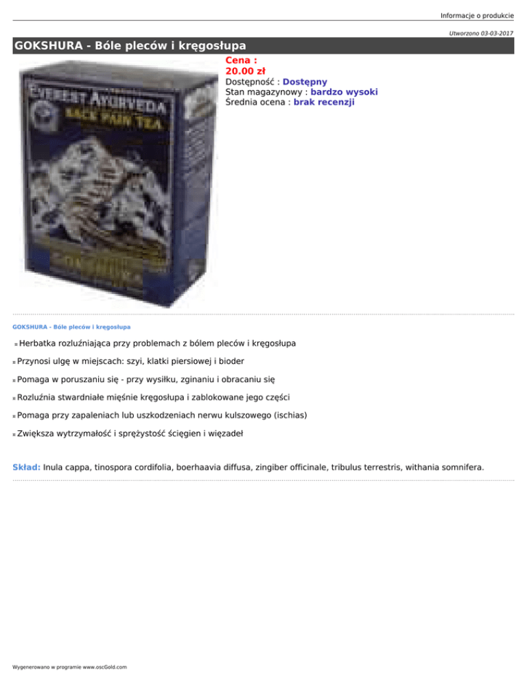 Informacje o produkcie Utworzono 03-03-2017 GOKSHURA - Bóle pleców i kręgosłupa Cena : 20.00 zł Dostępność : Dostępny Stan magazynowy : bardzo wysoki Średnia ocena : brak recenzji GOKSHURA - Bóle pleców i kręgosłupa ¤ Herbatka rozluźniająca przy problemach z bólem pleców i kręgosłupa ¤ Przynosi ulgę w miejscach: szyi, klatki piersiowej i bioder ¤ Pomaga w poruszaniu się - przy wysiłku, zginaniu i obracaniu się ¤ Rozluźnia stwardniałe mięśnie kręgosłupa i zablokowane jego części ¤ Pomaga przy zapaleniach lub uszkodzeniach nerwu kulszowego (ischias) ¤ Zwiększa wytrzymałość i sprężystość ścięgien i więzadeł Skład: Inula cappa, tinospora cordifolia, boerhaavia diffusa, zingiber officinale, tribulus terrestris, withania somnifera. Wygenerowano w programie www.oscGold.com