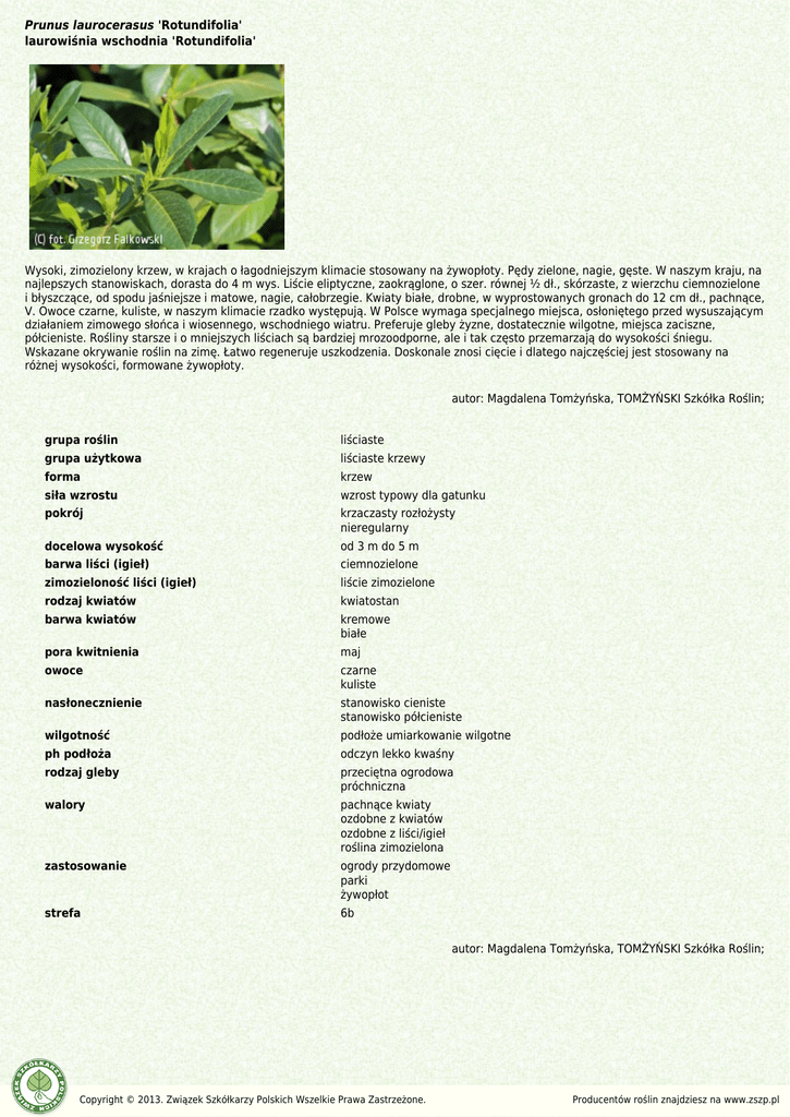 Prunus laurocerasus 'Rotundifolia' laurowiśnia wschodnia 'Rotundifolia' Wysoki, zimozielony krzew, w krajach o łagodniejszym klimacie stosowany na żywopłoty. Pędy zielone, nagie, gęste. W naszym kraju, na najlepszych stanowiskach, dorasta do 4 m wys. Liście eliptyczne, zaokrąglone, o szer. równej ½ dł., skórzaste, z wierzchu ciemnozielone i błyszczące, od spodu jaśniejsze i matowe, nagie, całobrzegie. Kwiaty białe, drobne, w wyprostowanych gronach do 12 cm dł., pachnące, V. Owoce czarne, kuliste, w naszym klimacie rzadko występują. W Polsce wymaga specjalnego miejsca, osłoniętego przed wysuszającym działaniem zimowego słońca i wiosennego, wschodniego wiatru. Preferuje gleby żyzne, dostatecznie wilgotne, miejsca zaciszne, półcieniste. Rośliny starsze i o mniejszych liściach są bardziej mrozoodporne, ale i tak często przemarzają do wysokości śniegu. Wskazane okrywanie roślin na zimę. Łatwo regeneruje uszkodzenia. Doskonale znosi cięcie i dlatego najczęściej jest stosowany na różnej wysokości, formowane żywopłoty. autor: Magdalena Tomżyńska, TOMŻYŃSKI Szkółka Roślin; grupa roślin liściaste grupa użytkowa liściaste krzewy forma krzew siła wzrostu wzrost typowy dla gatunku pokrój krzaczasty rozłożysty nieregularny docelowa wysokość od 3 m do 5 m barwa liści (igieł) ciemnozielone zimozieloność liści (igieł) liście zimozielone rodzaj kwiatów kwiatostan barwa kwiatów kremowe białe pora kwitnienia maj owoce czarne kuliste nasłonecznienie stanowisko cieniste stanowisko półcieniste wilgotność podłoże umiarkowanie wilgotne ph podłoża odczyn lekko kwaśny rodzaj gleby przeciętna ogrodowa próchniczna walory pachnące kwiaty ozdobne z kwiatów ozdobne z liści/igieł roślina zimozielona zastosowanie ogrody przydomowe parki żywopłot strefa 6b autor: Magdalena Tomżyńska, TOMŻYŃSKI Szkółka Roślin; Copyright © 2013. Związek Szkółkarzy Polskich Wszelkie Prawa Zastrzeżone. Producentów roślin znajdziesz na www.zszp.pl