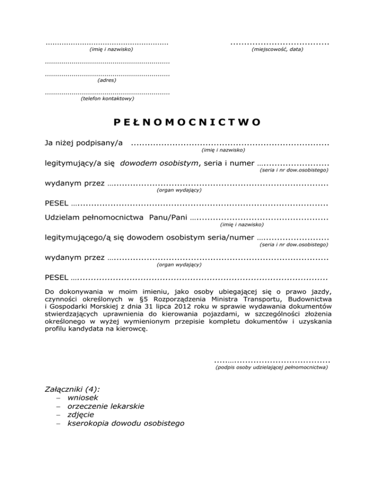 ...................................................... .................................... (imię i nazwisko) (miejscowość, data) ............................................................. ............................................................. (adres) ............................................................. (telefon kontaktowy) PEŁNOMOCNICTWO Ja niżej podpisany/a ........................................................................ (imię i nazwisko) legitymujący/a się dowodem osobistym, seria i numer …........................ (seria i nr dow.osobistego) wydanym przez ….............................................................................. (organ wydający) PESEL …........................................................................................... Udzielam pełnomocnictwa Panu/Pani …................................................ (imię i nazwisko) legitymującego/ą się dowodem osobistym seria/numer …........................ (seria i nr dow.osobistego) wydanym przez ….............................................................................. (organ wydający) PESEL …........................................................................................... Do dokonywania w moim imieniu, jako osoby ubiegającej się o prawo jazdy, czynności określonych w §5 Rozporządzenia Ministra Transportu, Budownictwa i Gospodarki Morskiej z dnia 31 lipca 2012 roku w sprawie wydawania dokumentów stwierdzających uprawnienia do kierowania pojazdami, w szczególności złożenia określonego w wyżej wymienionym przepisie kompletu dokumentów i uzyskania profilu kandydata na kierowcę. .....…................................... (podpis osoby udzielającej pełnomocnictwa) Załączniki (4): wniosek orzeczenie lekarskie zdjęcie kserokopia dowodu osobistego ...................................................... .................................... (imię i nazwisko) (miejscowość, data) ............................................................. ............................................................. (adres) ............................................................. (telefon kontaktowy) PEŁNOMOCNICTWO Ja niżej podpisany/a ........................................................................ (imię i nazwisko) legitymujący/a się paszportem, seria i numer ...................................... (seria i numer paszportu) wydanym przez ….............................................................................. (organ wydający) PESEL …........................................................................................... Udzielam pełnomocnictwa Panu/Pani …................................................ (imię i nazwisko) legitymującego/ą się dowodem osobistym seria/numer …........................ (seria i nr dow.osobistego) wydanym przez ….............................................................................. (organ wydający) PESEL …........................................................................................... Do dokonywania w moim imieniu, jako osoby ubiegającej się o prawo jazdy, czynności określonych w §5 Rozporządzenia Ministra Transportu, Budownictwa i Gospodarki Morskiej z dnia 31 lipca 2012 roku w sprawie wydawania dokumentów stwierdzających uprawnienia do kierowania pojazdami, w szczególności złożenia określonego w wyżej wymienionym przepisie kompletu dokumentów i uzyskania profilu kandydata na kierowcę. .....…................................... (podpis osoby udzielającej pełnomocnictwa) Załączniki: wniosek orzeczenie lekarskie zdjęcie kserokopia paszportu zgoda rodziców