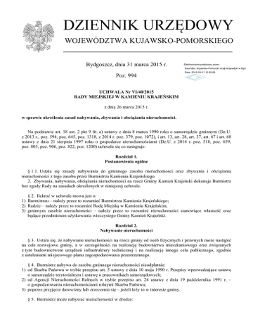 DZIENNIK URZĘDOWY WOJEWÓDZTWA KUJAWSKO-POMORSKIEGO Bydgoszcz, dnia 31 marca 2015 r. Elektronicznie podpisany przez: Ewa Mes; Kujawsko-Pomorski Urząd Wojewódzki w Bydgoszcz Poz. 994 Data: 2015-03-31 12:55:08 UCHWAŁA Nr VI/40/2015 RADY MIEJSKIEJ W KAMIENIU KRAJEŃSKIM z dnia 26 marca 2015 r. w sprawie określenia zasad nabywania, zbywania i obciążania nieruchomości. Na podstawie art. 18 ust. 2 pkt 9 lit. a) ustawy z dnia 8 marca 1990 roku o samorządzie gminnym (Dz.U. z 2013 r., poz. 594, poz. 645, poz. 1318, z 2014 r. poz. 379, poz. 1072), i art. 13, art. 28, art. 37, art. 67 i art. 68 ustawy z dnia 21 sierpnia 1997 roku o gospodarce nieruchomościami (Dz.U. z 2014 r. poz. 518, poz. 659, poz. 805, poz. 906, poz. 822, poz. 1200) uchwala się co następuje: Rozdział 1. Postanowienia ogólne § 1.1. Ustala się zasady nabywania do gminnego zasobu nieruchomości oraz zbywania i obciążania nieruchomości z tego zasobu przez Burmistrza Kamienia Krajeńskiego. 2. Zbywania, nabywania, obciążania nieruchomości na rzecz Gminy Kamień Krajeński dokonuje Burmistrz bez zgody Rady na zasadach określonych w niniejszej uchwale. § 2. Ilekroć w uchwale mowa jest o: 1) Burmistrzu – należy przez to rozumieć Burmistrza Kamienia Krajeńskiego; 2) Radzie – należy przez to rozumieć Radę Miejską w Kamieniu Krajeńskim; 3) gminnym zasobie nieruchomości – należy przez to rozumieć nieruchomości stanowiące własność oraz będące przedmiotem użytkowania wieczystego Gminy Kamień Krajeński. Rozdział 2. Nabywanie nieruchomości § 3. Ustala się, że nabywanie nieruchomości na rzecz gminy od osób fizycznych i prawnych może nastąpić na cele rozwojowe gminy, a w szczególności na realizację budownictwa mieszkaniowego oraz związanych z tym budownictwem urządzeń infrastruktury technicznej i na realizację innego celu publicznego, zgodnie z ustaleniami miejscowego planu zagospodarowania przestrzennego. § 4. Burmistrz nabywa do zasobu gminnego nieruchomości nieodpłatnie: 1) od Skarbu Państwa w trybie przepisu art. 5 ustawy z dnia 10 maja 1990 r. Przepisy wprowadzające ustawę o samorządzie terytorialnym i ustawę o pracownikach samorządowych; 2) od Agencji Nieruchomości Rolnych w trybie przepisu art. 24 ustawy z dnia 19 października 1991 r. – o gospodarowaniu nieruchomościami rolnymi Skarbu Państwa; 3) poprzez przyjęcie darowizny lub zrzeczenia się – jeżeli leży to w interesie gminy. § 5. Burmistrz może nabywać nieruchomości w drodze: Dziennik Urzędowy Województwa Kujawsko-Pomorskiego –2– Poz. 994 1) negocjacji - przy czym cena zakupu nieruchomości nie może być wyższa niż 1,5 krotność wartości ustalonej przez uprawnionego rzeczoznawcę majątkowego; 2) licytacji komorniczej lub przetargu – jeżeli uzna to za konieczność uzasadnioną lub gdy nieruchomość jest niezbędna do realizacji celów publicznych przez gminę. § 6.1. Burmistrz nabywa odpłatnie do zasobu gminnego nieruchomości: 1) pod istniejącymi drogami publicznymi; 2) przeznaczone pod budowę lub modernizację dróg publicznych. 2. Przedmiotem nabycia mogą być nieruchomości stanowiące własność osób fizycznych i prawnych oraz przysługujące tym osobom prawo użytkowania wieczystego. 3. Nabycie nieruchomości określonych w ust. 1 następuje na wniosek właściciela lub użytkownika wieczystego albo z inicjatywy Burmistrza. 4. Jeżeli nabyciu określonemu w ust. 1 podlega tylko część nieruchomości, a pozostała część nie nadaje się do prawidłowego wykorzystania na dotychczasowe cele, na wniosek właściciela lub użytkownika wieczystego Burmistrz nabywa również tę część. 5. Nabycie nieruchomości określonych w ust. 1 i ust. 4 może nastąpić w drodze zamiany. § 7. Nabycie nieruchomości niezbędnych do realizacji celów publicznych przez gminę może nastąpić wyłącznie w ramach środków przewidzianych na te cele w uchwale budżetowej. § 8. Nabycie nieruchomości należy poprzedzić rokowaniami, przeprowadzonymi między Burmistrzem a właścicielem lub użytkownikiem wieczystym nieruchomości w celu ustalenia warunków nabycia, w tym ceny nieruchomości. § 9. Podstawą do prowadzenia rokowań przy nabywaniu nieruchomości, jest operat szacunkowy wykonany przez rzeczoznawcę majątkowego. § 10. Zasady określone w § 8 i 9 stosuje się odpowiednio w przypadku ustanowienia na rzecz gminy ograniczonych praw rzeczowych na nieruchomościach stanowiących własność osób trzecich. Rozdział 3. Zbywanie nieruchomości § 11. Nieruchomości stanowiące własność gminy mogą być przedmiotem sprzedaży lub oddania w użytkowanie wieczyste, jeżeli jest to ekonomicznie uzasadnione i nie mogą one być wykorzystywane na cele publiczne realizowane przez gminę w ramach jej zadań własnych. § 12. Sprzedaż nieruchomości lub oddanie w użytkowanie wieczyste nieruchomości gruntowej następuje w drodze przetargu lub w drodze bezprzetargowej z zachowaniem zasad i warunków określonych w ustawie o gospodarce nieruchomościami oraz innych ustawach. § 13. Warunki zbycia nieruchomości gruntowej w drodze bezprzetargowej ustala Burmistrz w rokowaniach przeprowadzonych z nabywcą. § 14. W przypadku, gdy nieruchomość, która nie może być zbyta jako odrębna nieruchomość, a sąsiaduje – przylega do więcej niż jednej nieruchomości i dla każdej z nich może być niezbędna do poprawienia warunków zagospodarowania, a więcej niż jedna osoba deklaruje chęć nabycia tej części, zbycie tej części nieruchomości następuje w drodze przetargu ograniczonego do właścicieli sąsiednich nieruchomości. Rozdział 4. Obciążanie nieruchomości oraz oddanie w użyczenie § 15. Nieruchomości stanowiące własność gminy mogą być obciążane ograniczonymi prawami rzeczowymi na podstawie przepisów Kodeksu cywilnego oraz ustawy z dnia 6 lipca 1982 roku o księgach wieczystych i hipotece. Dziennik Urzędowy Województwa Kujawsko-Pomorskiego –3–