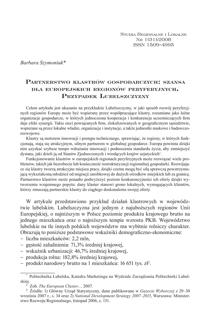 Studia Regionalne i Lokalne Nr 1(31)/2008 ISSN 1509–4995 Barbara Szymoniuk* Partnerstwo klastrów gospodarczych: szansa dla europejskich regionów peryferyjnych. Przypadek Lubelszczyzny Celem artykułu jest ukazanie na przykładzie Lubelszczyzny, w jaki sposób rozwój peryferyjnych regionów Europy może być wspierany przez współpracujące klastry, rozumiane jako luźne organizacje gospodarcze, w których jednoczesna kooperacja i konkurencja uczestniczących firm daje efekt synergii. Takie sieci powiązanych firm, zlokalizowanych w geograficznym sąsiedztwie, wspierane są przez lokalne władze, organizacje i instytucje, a także jednostki naukowe i badawczorozwojowe. Klastry są motorem innowacji i postępu technicznego, sprawiając, że regiony, w których funkcjonują, stają się atrakcyjnym, silnym partnerem w globalnej gospodarce. Europa powinna dzięki nim uzyskać szybsze tempo wdrażania innowacji i podnoszenia standardu życia, aby zmniejszyć dystans, jaki dzieli ją od Stanów Zjednoczonych i wiodących krajów azjatyckich. Funkcjonowanie klastrów w europejskich regionach peryferyjnych może rozwiązać wiele problemów, takich jak bezrobocie lub konieczność restrukturyzacji regionalnej gospodarki. Rozwijające się klastry tworzą atrakcyjne miejsca pracy, dzięki czemu mogą być siłą sprawczą powstrzymującą wykształconą młodzież od migracji zarobkowej do dużych ośrodków miejskich lub za granicę. Partnerstwo klastrów może ponadto podwyższyć poziom konkurencyjności ich oferty dzięki wytworzeniu wzajemnego popytu: dany klaster stanowi grono lokalnych, wymagających klientów, którzy zmuszają partnerskie klastry do ciągłego doskonalenia swojej oferty. W artykule przedstawiono przykład działań klastrowych w województwie lubelskim. Lubelszczyzna jest jednym z najuboższych regionów Unii Europejskiej, o najniższym w Polsce poziomie produktu krajowego brutto na jednego mieszkańca oraz o najniższym tempie wzrostu PKB. Województwo lubelskie na tle innych polskich województw ma wybitnie rolniczy charakter. Obrazują to poniższe podstawowe wskaźniki demograficzno-ekonomiczne: − liczba mieszkańców: 2,2 mln, − gęstość zaludnienia: 71,3% średniej krajowej, − wskaźnik urbanizacji: 46,7% średniej krajowej, − produkcja rolna: 182,8% średniej krajowej, − produkt narodowy brutto na 1 mieszkańca: 16 651 tys. zł. * Politechnika Lubelska, Katedra Marketingu na Wydziale Zarządzania Politechniki Lubelskiej. Zob. The European Cluster… 2007. Źródła: 1) Główny Urząd Statystyczny, dane publikowane w Gazecie Wyborczej z 29–30 września 2007 r., s. 34 oraz 2) National Development Strategy 2007–2015, Warszawa: Ministerstwo Rozwoju Regionalnego, listopad 2006, s. 151. 82 Barbara Szymoniuk Lubelszczyzna, podobnie jak wiele innych regionów peryferyjnych w Europie, wymaga wzmocnienia zorientowanej na cele współpracy między przedsiębiorstwami, agendami rządowymi i samorządowymi, organizacjami pozarządowymi i środowiskiem naukowym. W artykule starano się wykazać, że regiony potrzebują także kooperacji pomiędzy klastrami, skutecznie aktywizującej lokalne społeczności i przyspieszającej rozwój gospodarczy. 1. Partnerskie klastry Lubelszczyzny 1.1. Dolina Ekologicznej Żywności Pierwszym z analizowanych klastrów jest Dolina Ekologicznej Żywności. Słowo „dolina” w nazwie nie oznacza ukształtowania powierzchni, ale rozległy klaster, a w zasadzie „klaster klastrów”. Wzorem nazewniczym dla tej struktury jest Silicon Valley, czyli Krzemowa Dolina w Kalifornii. Za jej przykładem wiele klastrów na świecie i w Polsce nosi nazwę zawierającą słowo „dolina” (chociażby: Plastics Valée we Francji, Dolina Lotnicza i Plastikowa Dolina w Polsce). Utworzenie klastra ekologicznego na Lubelszczyźnie stało się realne dzięki możliwości zrealizowania projektu o nazwie „Strategia Doliny Ekologicznej Żywności”. Uznano, że projektowany klaster powinien koncentrować swoją działalność wokół ekologicznej produkcji rolnej. Po zakończeniu projektu powołano do życia Stowarzyszenie „EkoLubelszczyzna”. Jego rejestracja sądowa nastąpiła 17 stycznia 2007 roku. Stowarzyszenie wdraża opracowaną w ramach projektu strategię dla klastra ekologicznej żywności. Żywność ekologiczna to bardzo smaczne, aromatyczne i pełnowartościowe produkty, wolne od szkodliwych substancji chemicznych. Są produkowane na bazie płodów rolnych, jaj, mięsa, mleka i innych surowców pochodzących z gospodarstw, które stosują naturalne metody wytwarzania. Wszelkie produkty ekologiczne muszą mieć specjalne certyfikaty poświadczające ich pochodzenie i naturalne wartości. Województwo lubelskie jest regionem szczególnie odpowiednim do produkcji ekologicznej na szeroką skalę ze względu na wybitnie rolniczy charakter i czystość środowiska. W rolnictwie ekologicznym nie stosuje się sztucznych środków chemicznych (takich jak np. nawozy czy środki ochrony roślin), co oznacza, że nie wprowadza do środowiska substancji zanieczyszczających. Nie degraduje się gleby i nie powoduje przedostawania substancji szkodliwych do wód gruntowych i rzek. Sprzyja to samooczyszczaniu się środowiska i zachowaniu równowagi biologicznej, bardzo korzystnej dla człowieka i jego przyrodniczego otoczenia. Projekt, zakończony jesienią 2006 roku, był współfinansowany ze środków Europejskiego Funduszu Społecznego w ramach Zintegrowanego Programu Operacyjnego Rozwoju Regionalnego – Działanie 2.6. oraz budżetu państwa. Jego koordynatorem była Wyższa Szkoła Przedsiębiorczości i Administracji w Lublinie, a jednostką wdrażającą Urząd Marszałkowski w Lublinie. Więcej szczegółów: www.dolinaeko.lublin.pl. Partnerstwo klastrów gospodarczych… 83 Kolejną istotną przesłanką dla wspierania rolnictwa ekologicznego na Lubelszczyźnie jest fakt, że jego rozwój spowoduje stosunkowo szybkie stworzeni